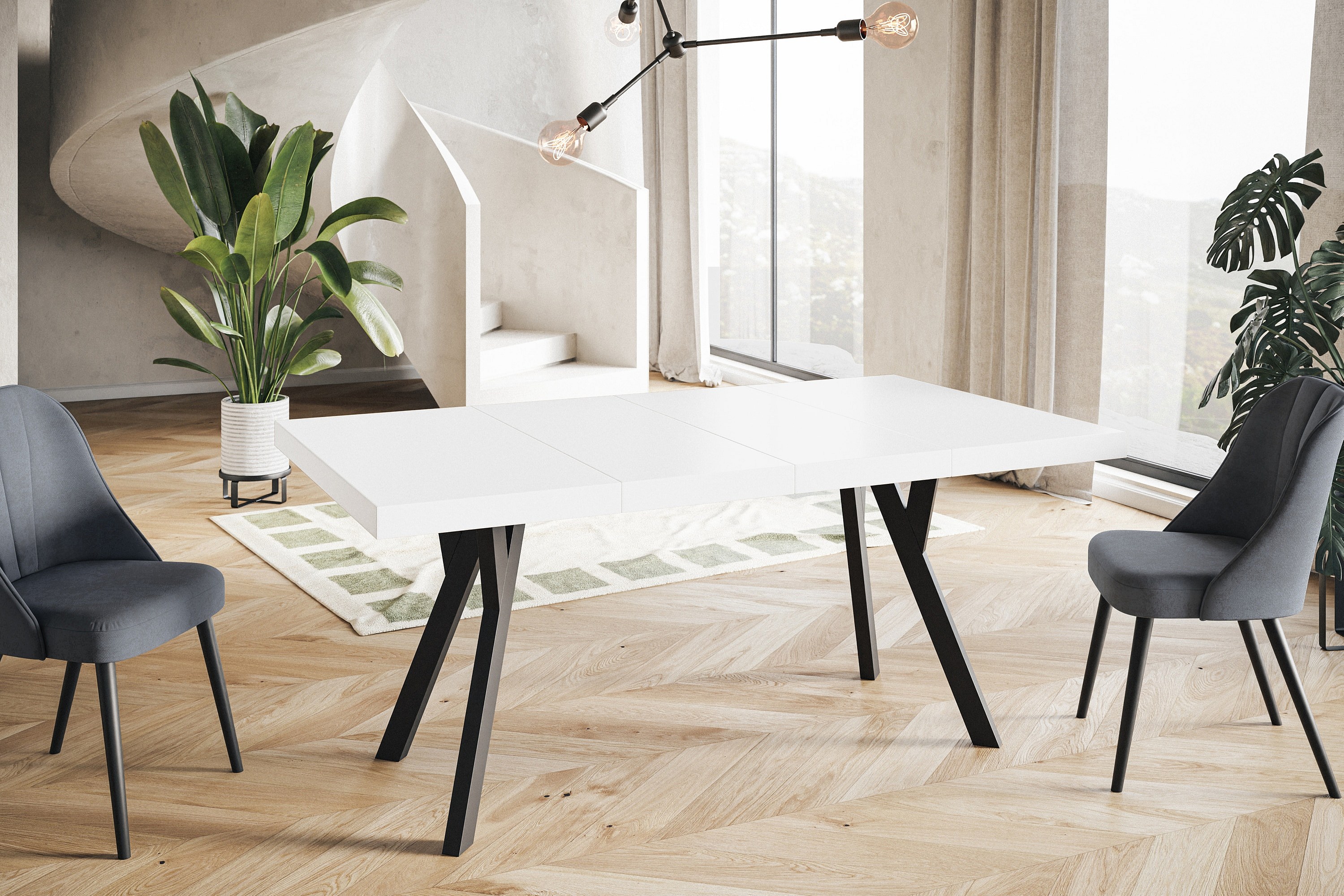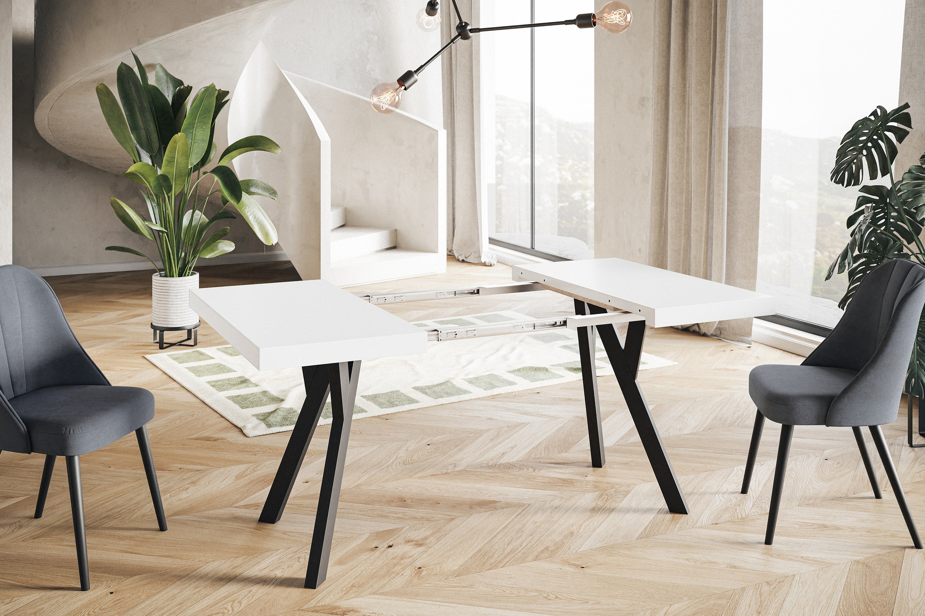 Table de salle à manger carrée RICO, table à rallonges, dimensions: 110-210X110X77 cm, couleur: blanc, avec pieds en bois de couleur noir