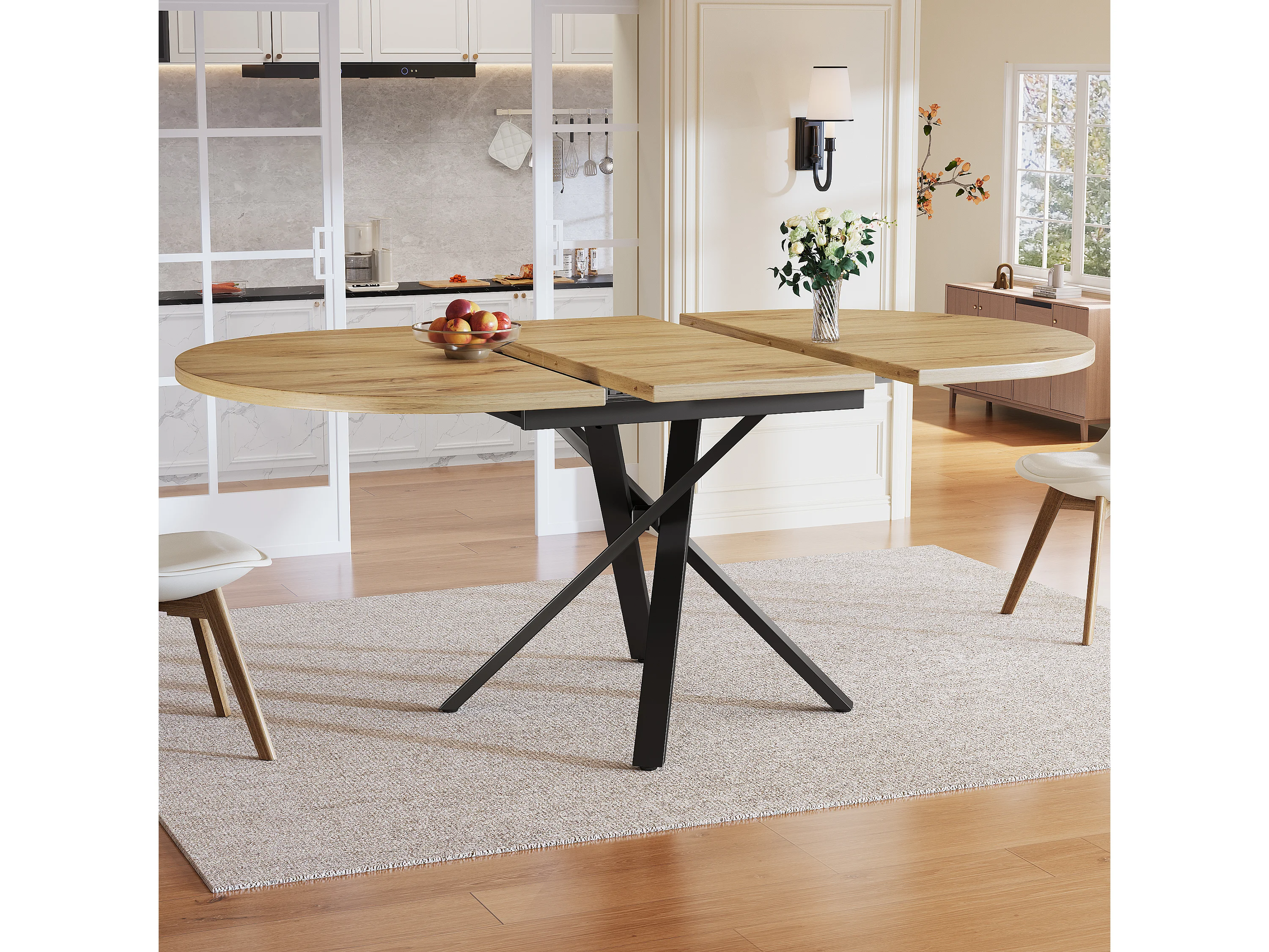 Table de salle à manger extensible - 100-140 x 100 x 75.5 cm - structure métallique stable en X - aspect bois - naturel