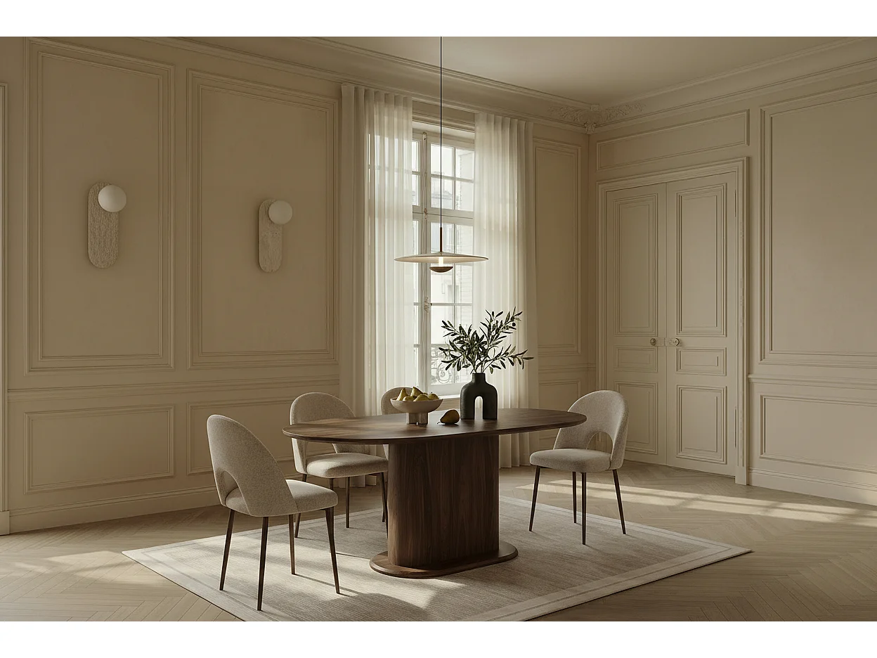 Table de salle à manger ovale effet noyer pied colonne central MDF 160x90 cm LOKA
