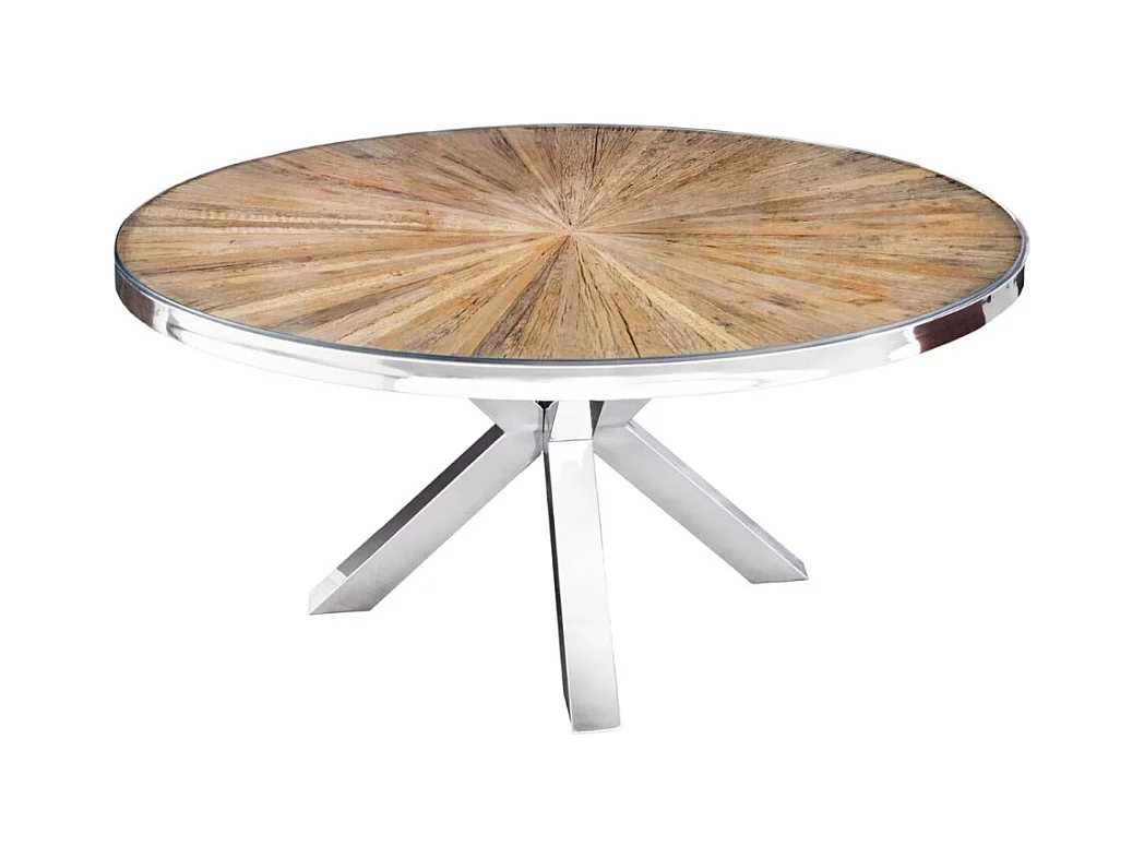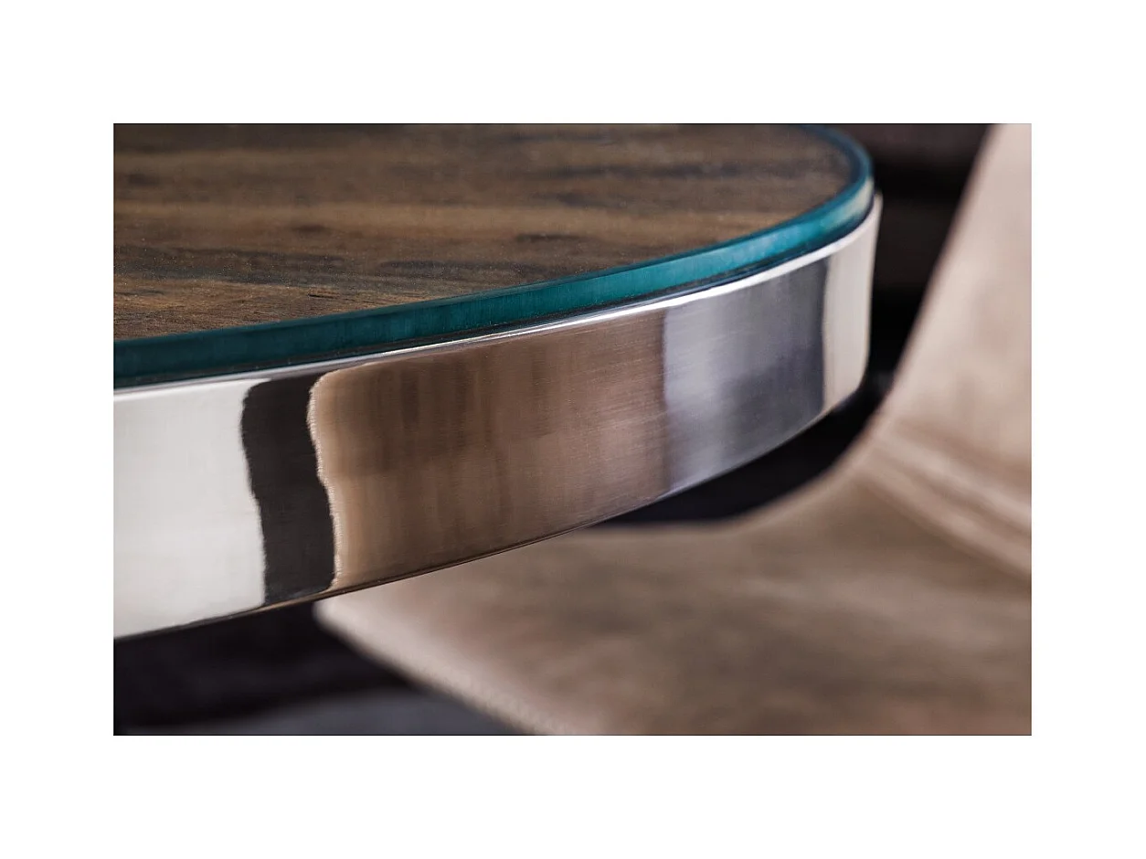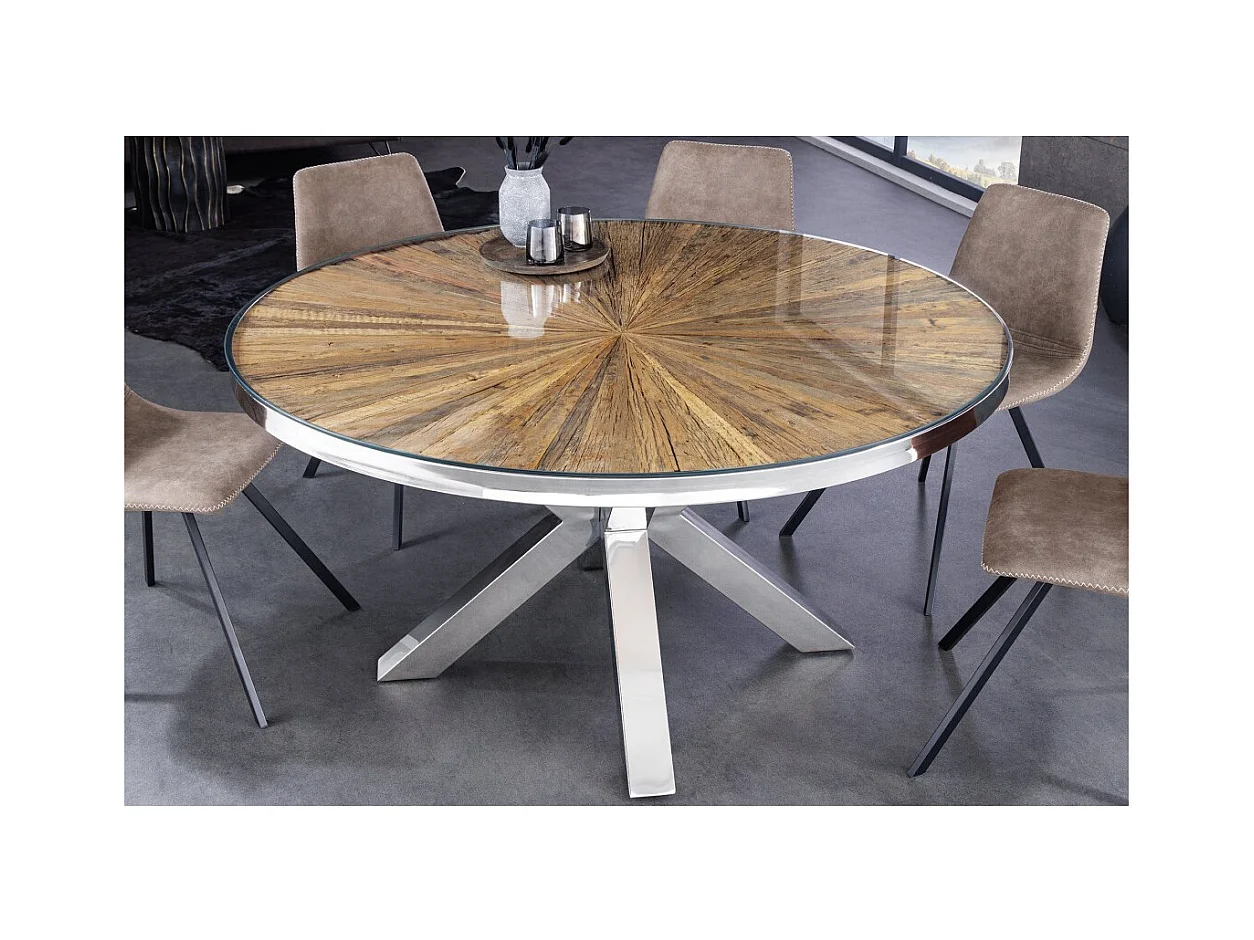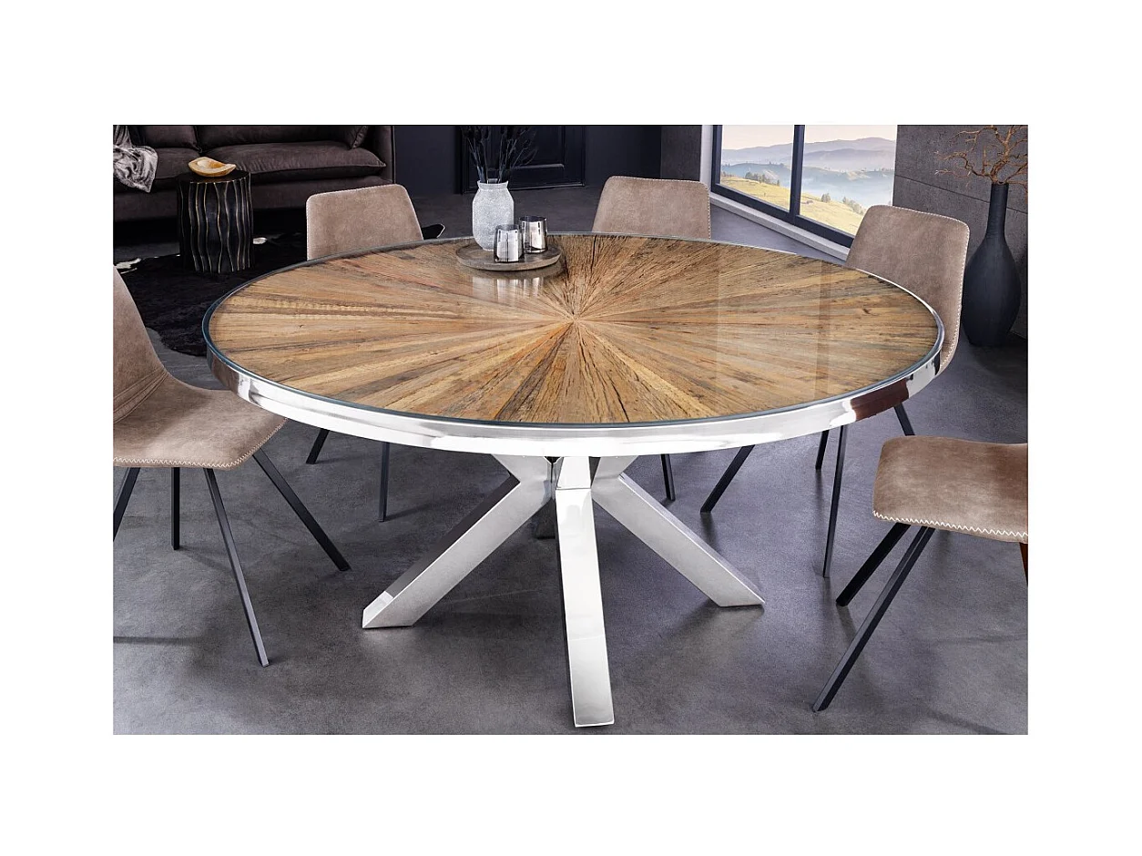Table de salle à manger RAFTA – Bois de teck et verre trempé – Pied chromé – 120 cm – Ronde – Style contemporain