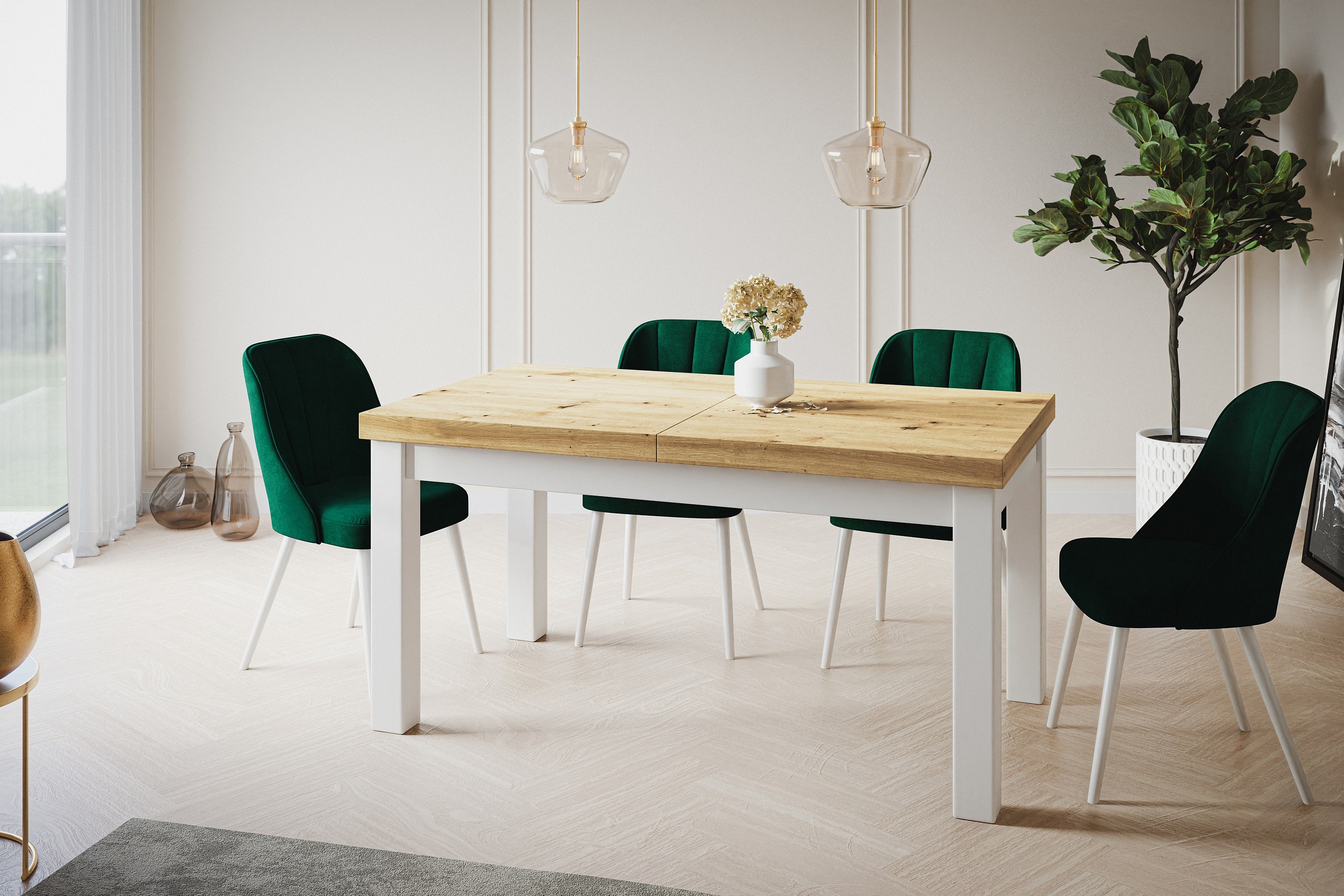 Table de salle à manger rectangulaire CLASSIC, table extensible, dimensions : 120-160X80X78 cm, couleur : ARTISAN, avec pieds en bois de couleur blanche