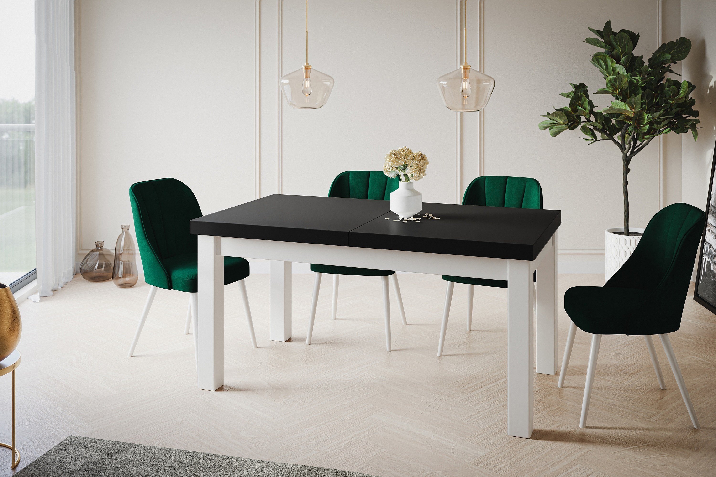 Table de salle à manger rectangulaire CLASSIC, table extensible, dimensions : 120-160X80X78 cm, couleur : noir, avec pieds en bois de couleur blanche