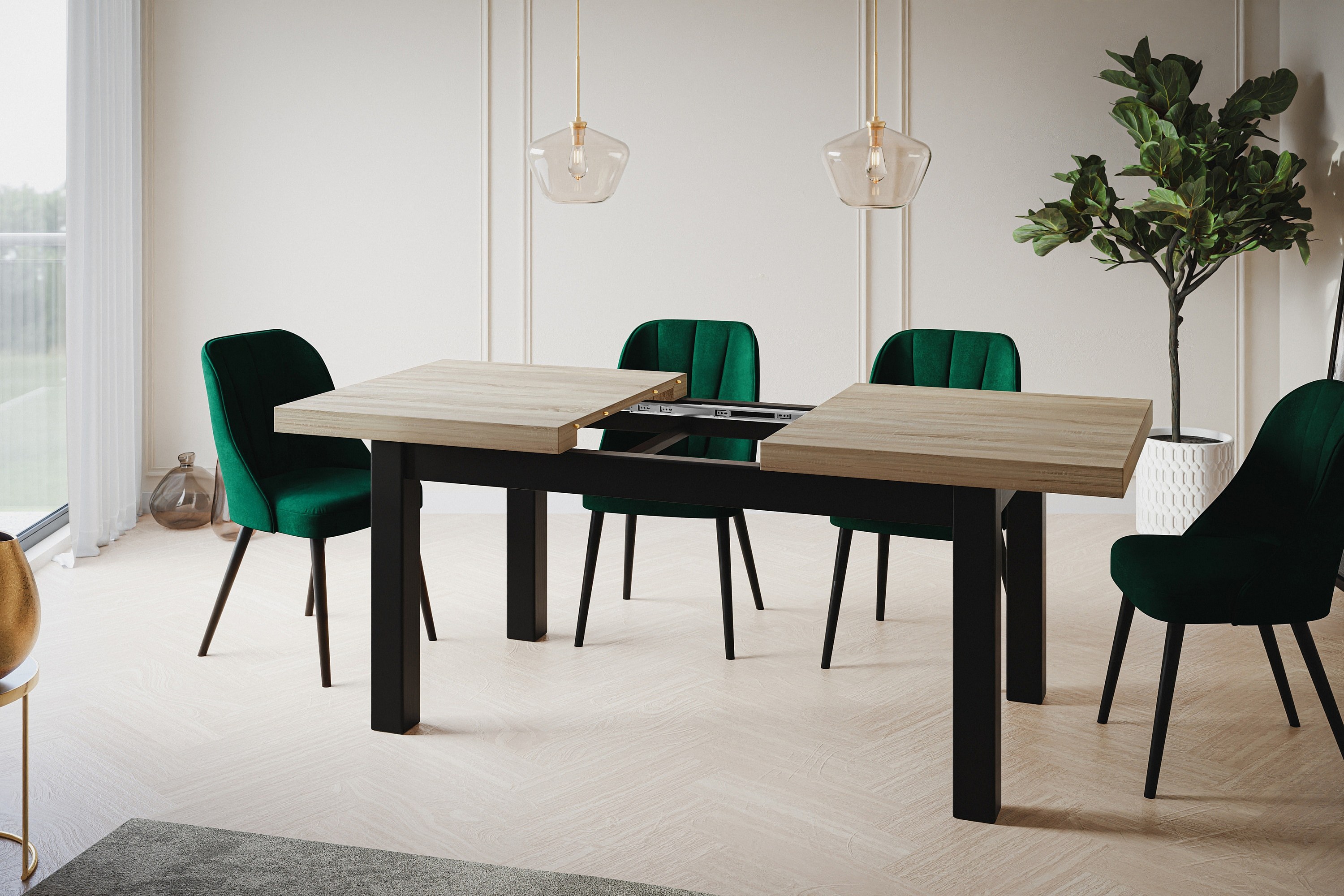 Table de salle à manger rectangulaire CLASSIC, table extensible, dimensions : 160-210X90X78 cm, couleur : SONOMA, avec pieds en bois de couleur noire