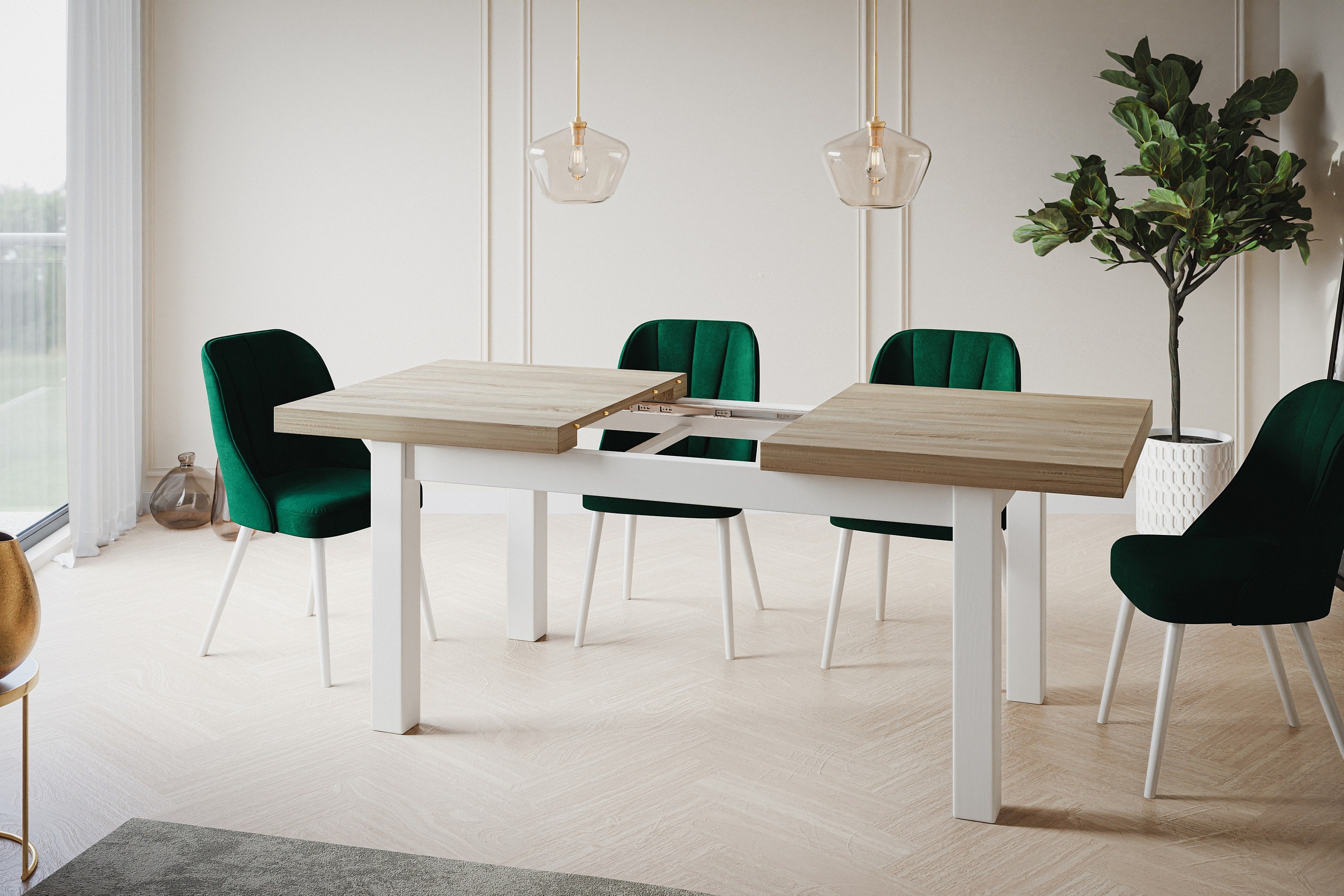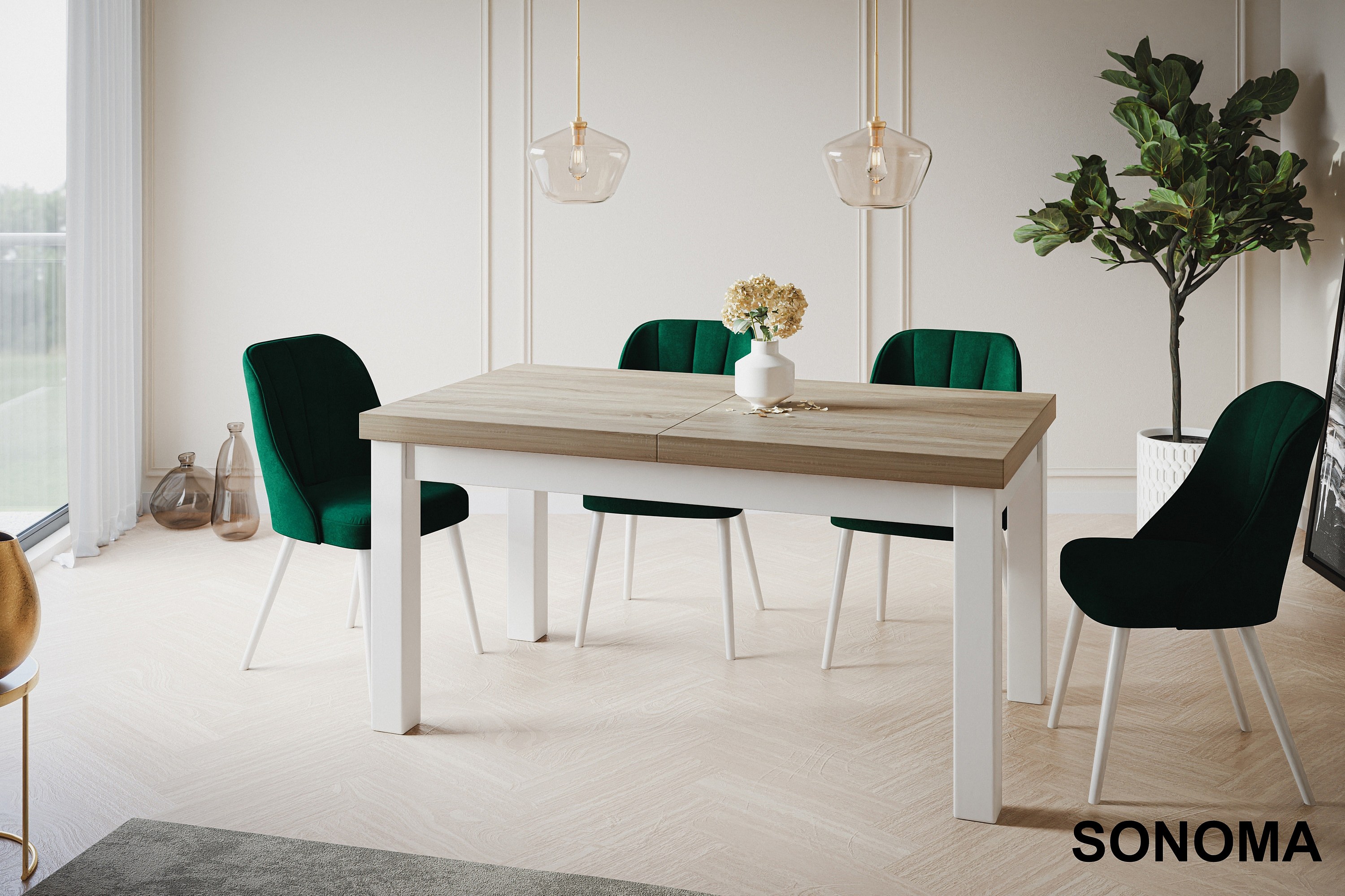 Table de salle à manger rectangulaire CLASSIC, table extensible, dimensions : 170-250X90X78 cm, couleur : SONOMA, avec pieds en bois de couleur blanche