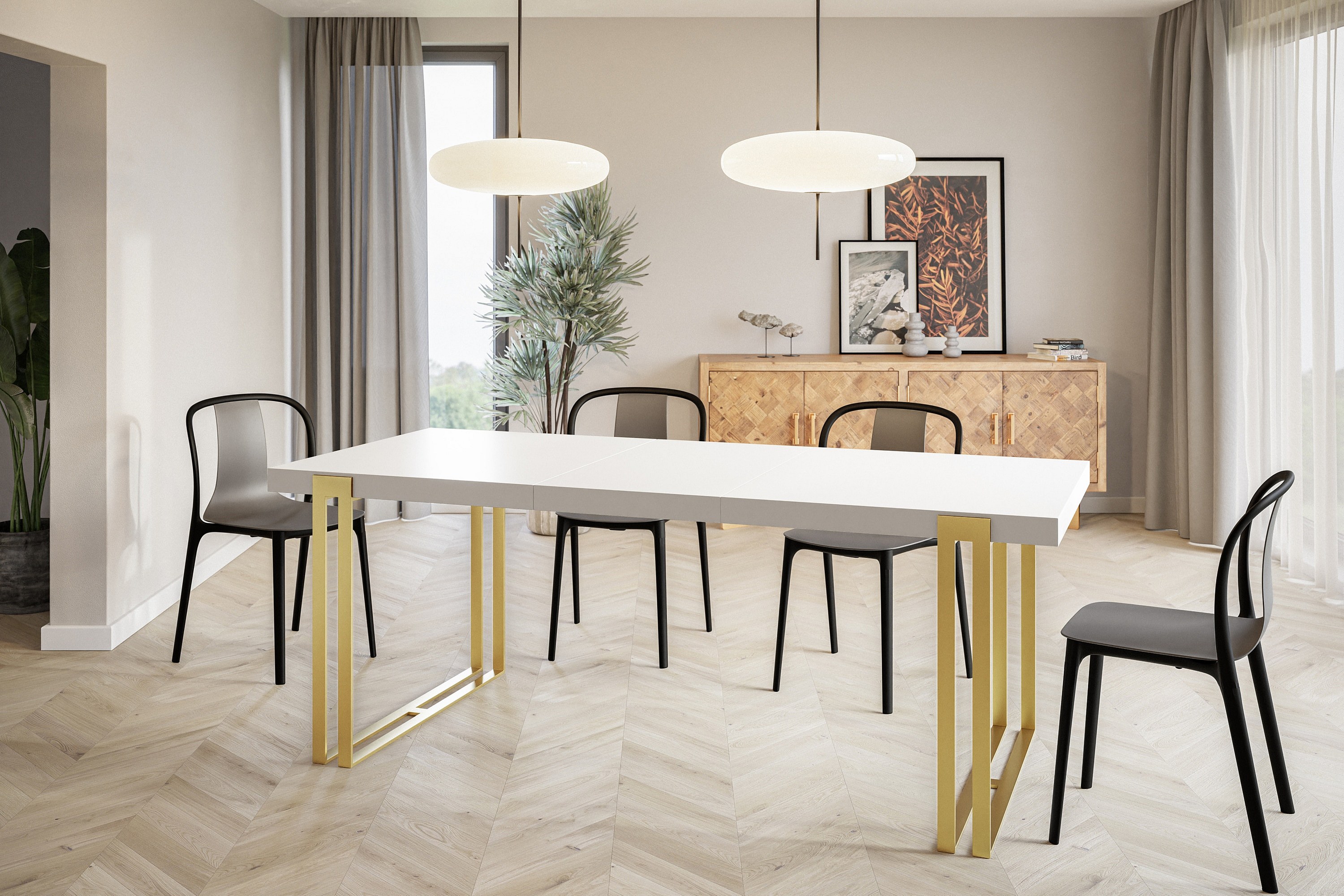 Table de salle à manger rectangulaire ROSA, table à rallonges, dimensions: 120-220X80X77 cm,couleur: blanc, avec pieds métalliques couleur or