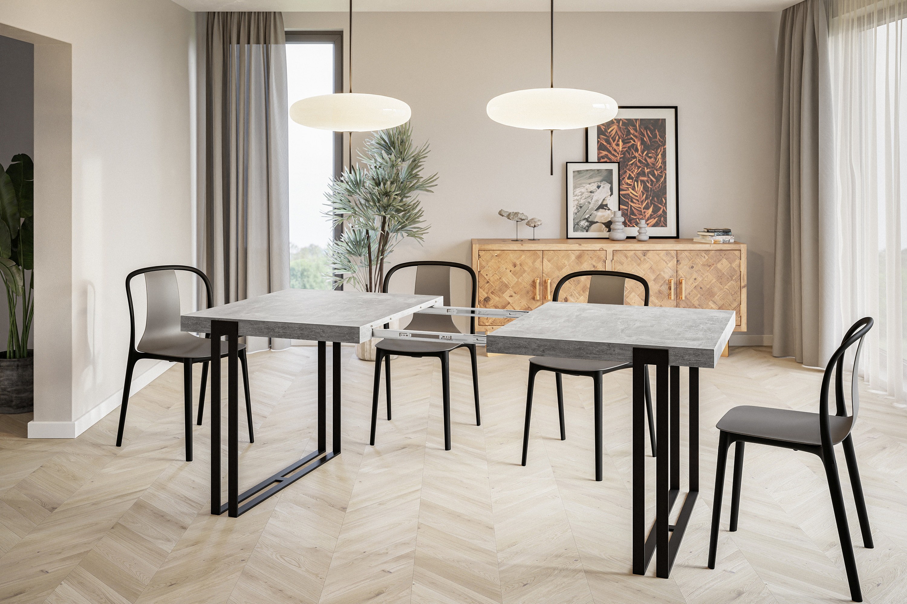 Table de salle à manger rectangulaire ROSA, table à rallonges, dimensions: 140-240X80X77 cm,couleur: gris clair, avec pieds métalliques de couleur noire
