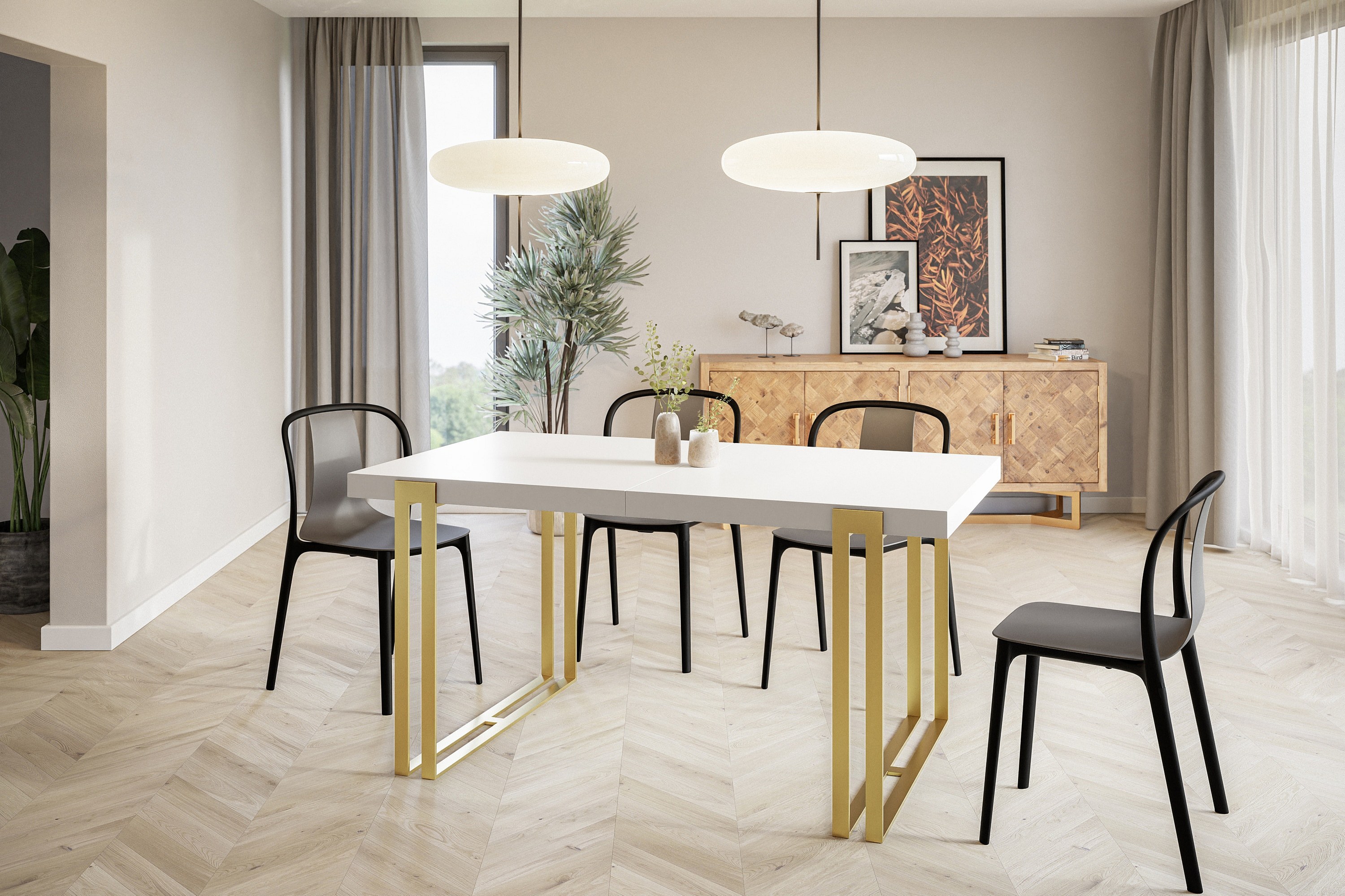 Table de salle à manger rectangulaire ROSA, table à rallonges, dimensions: 160-260X90X77 cm,couleur: blanc, avec pieds métalliques couleur or