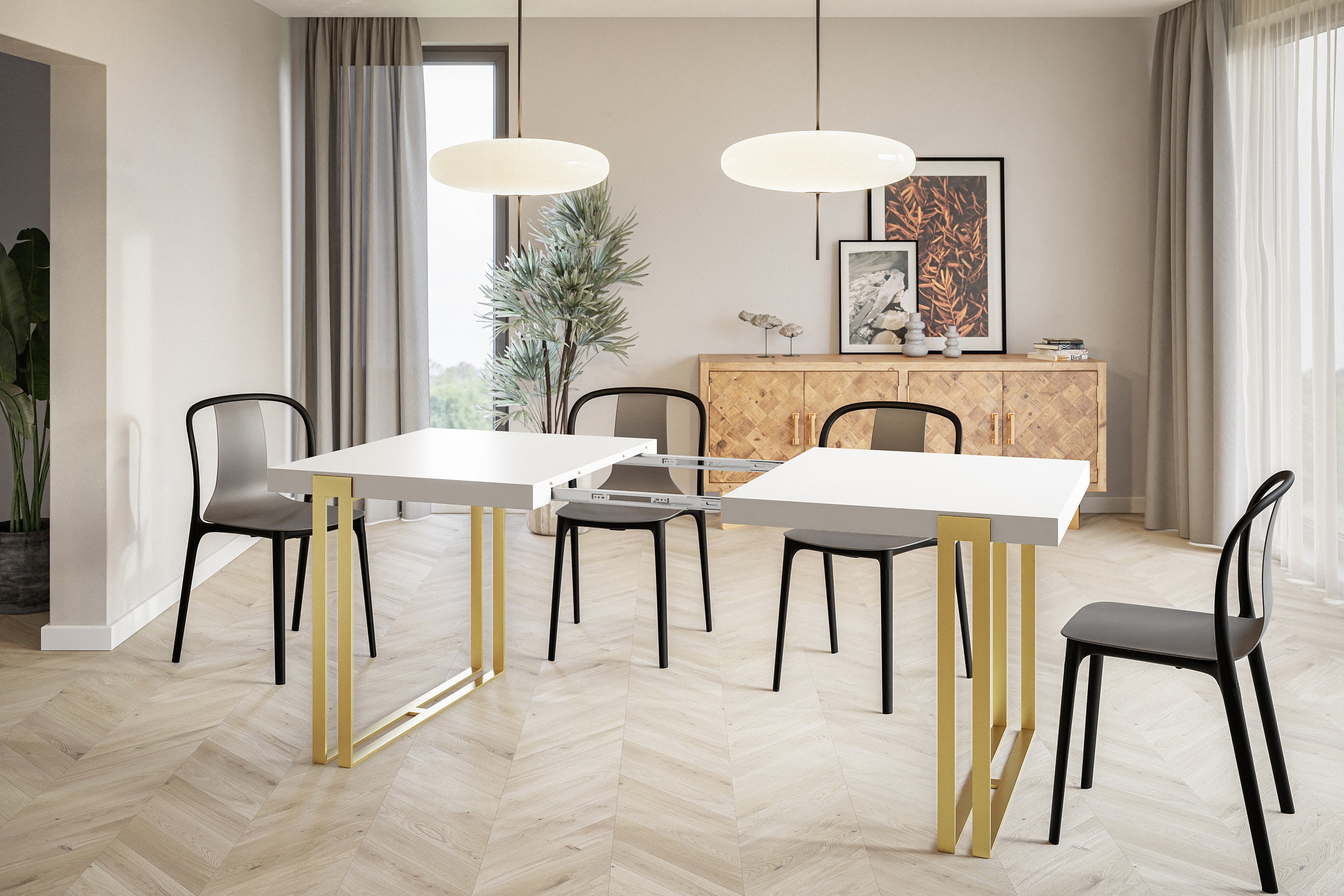 Table de salle à manger rectangulaire ROSA, table à rallonges, dimensions: 180-280X90X77 cm,couleur: blanc, avec pieds métalliques couleur or