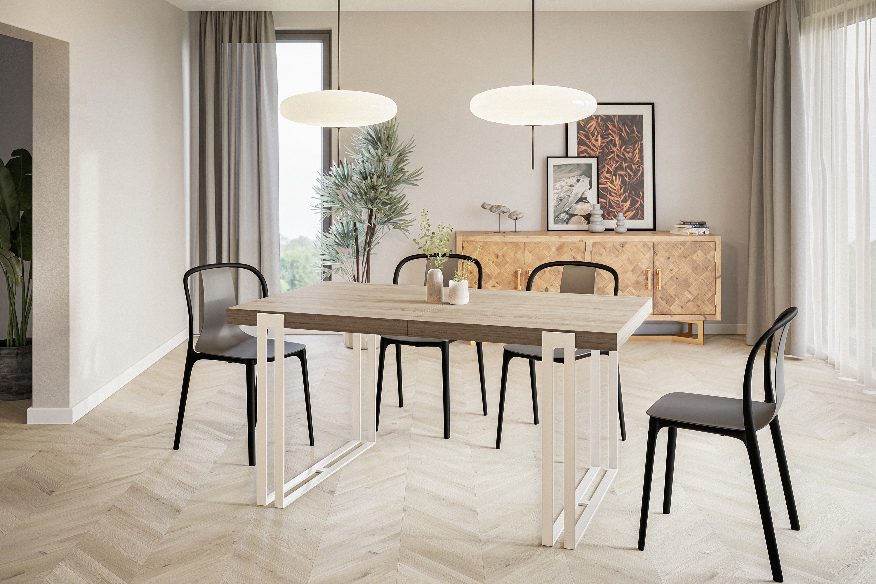 Table de salle à manger rectangulaire ROSA, table à rallonges, dimensions: 180-280X90X77 cm,couleur: SONOMA, avec pieds métalliques de couleur blanche