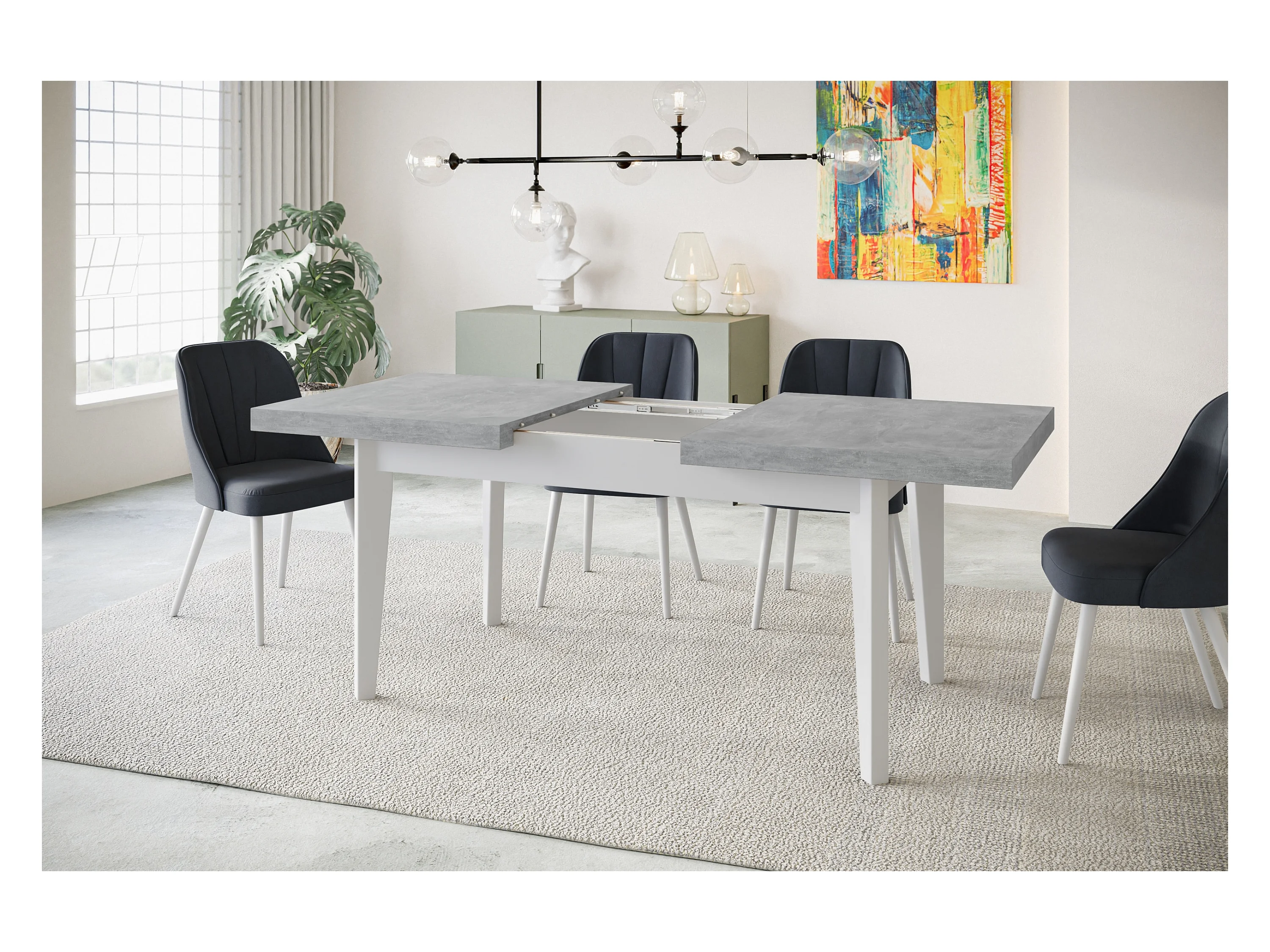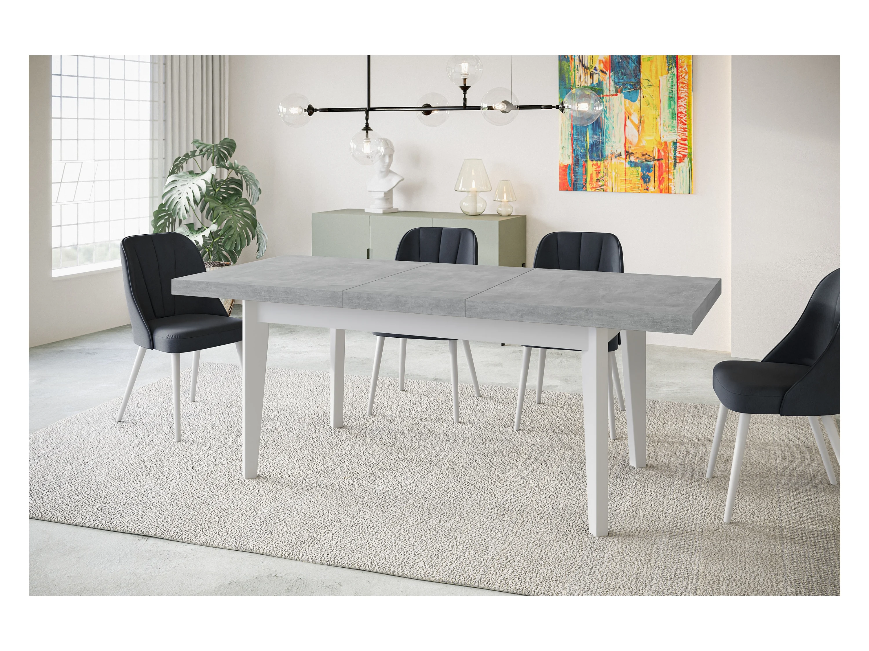 Table de salle à manger rectangulaire SKANDI, table à rallonges, dimensions: 120-160X80X78 cm, couleur: ATELIER, avec pieds en bois de couleur blanche
