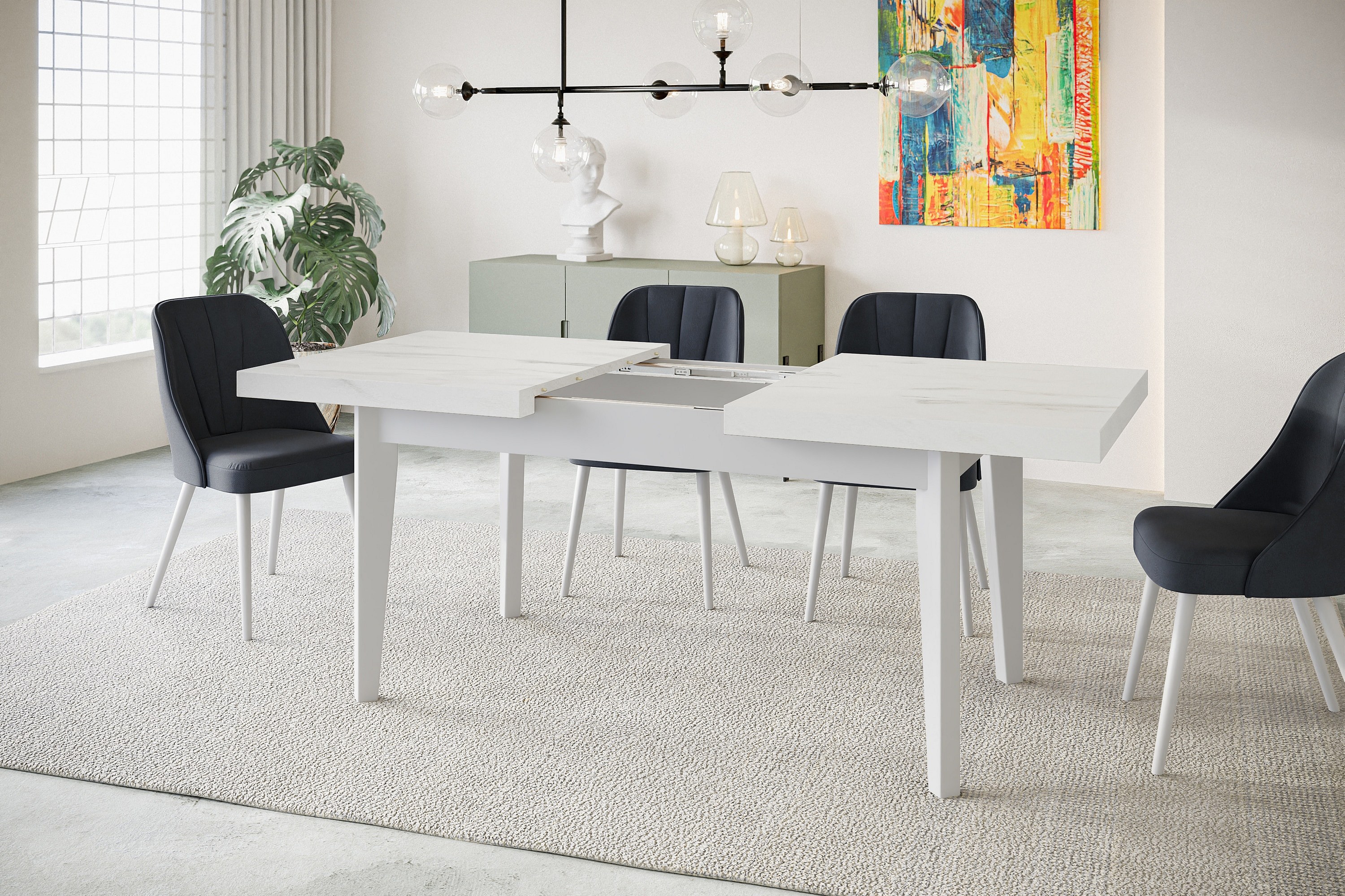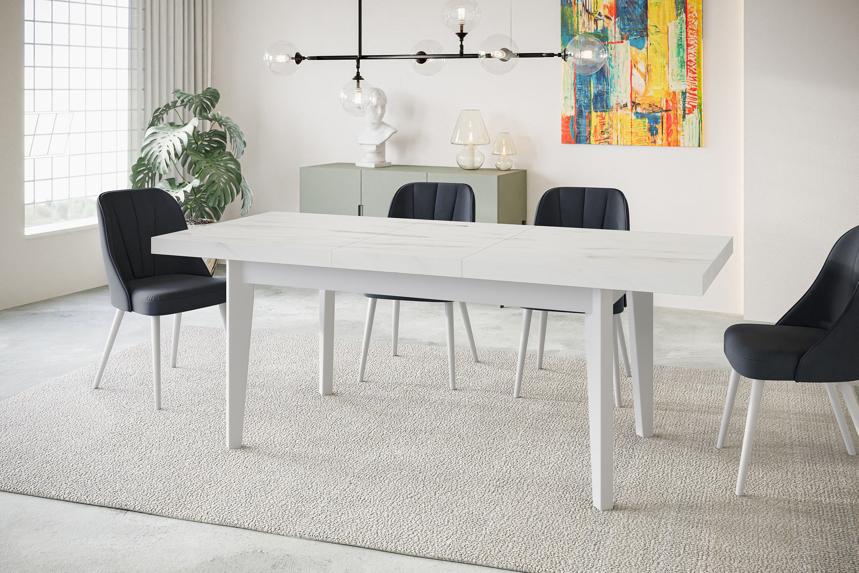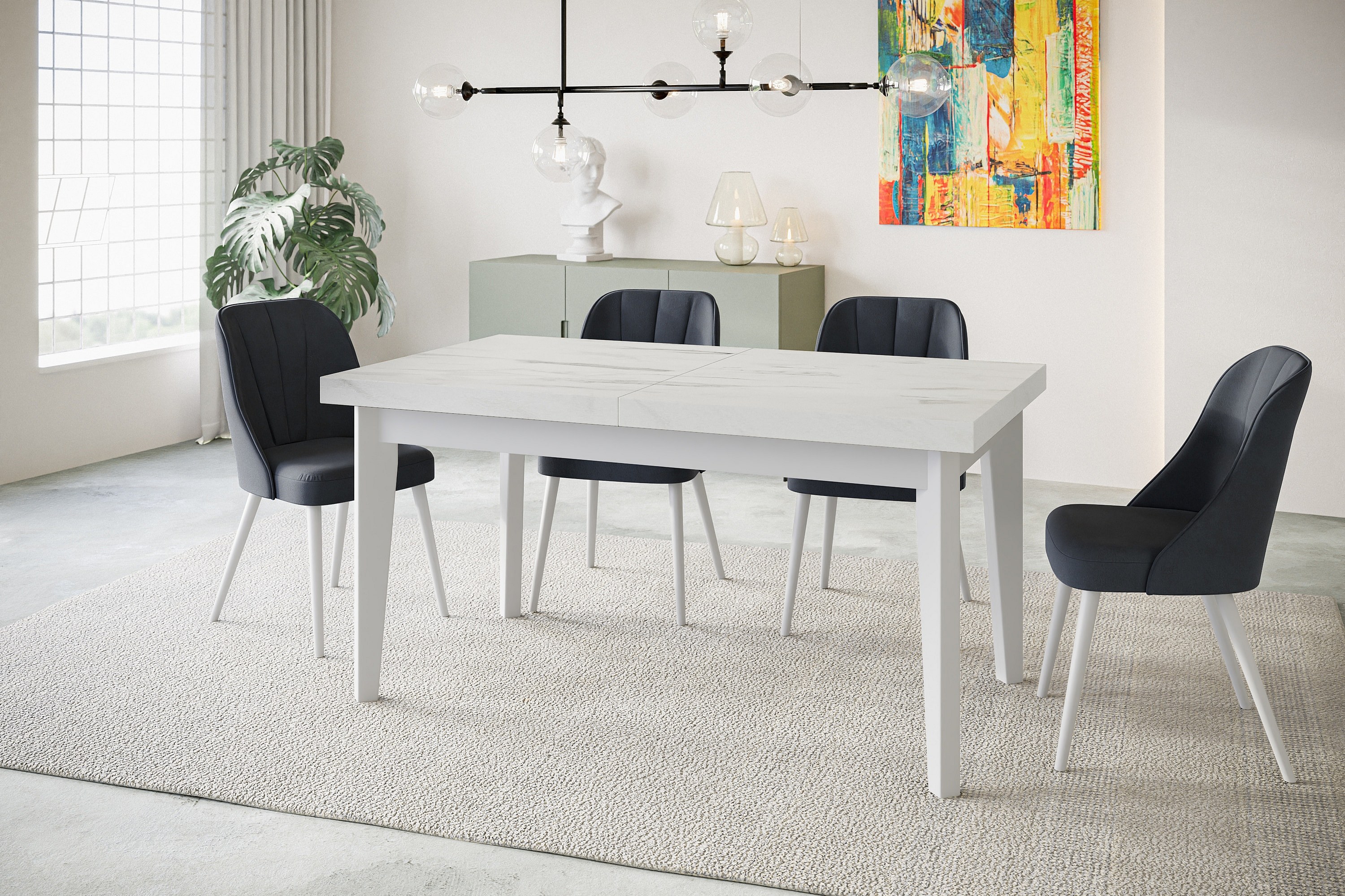 Table de salle à manger rectangulaire SKANDI, table à rallonges, dimensions: 140-180X80X78 cm, couleur: MARMUR, avec pieds en bois blanc