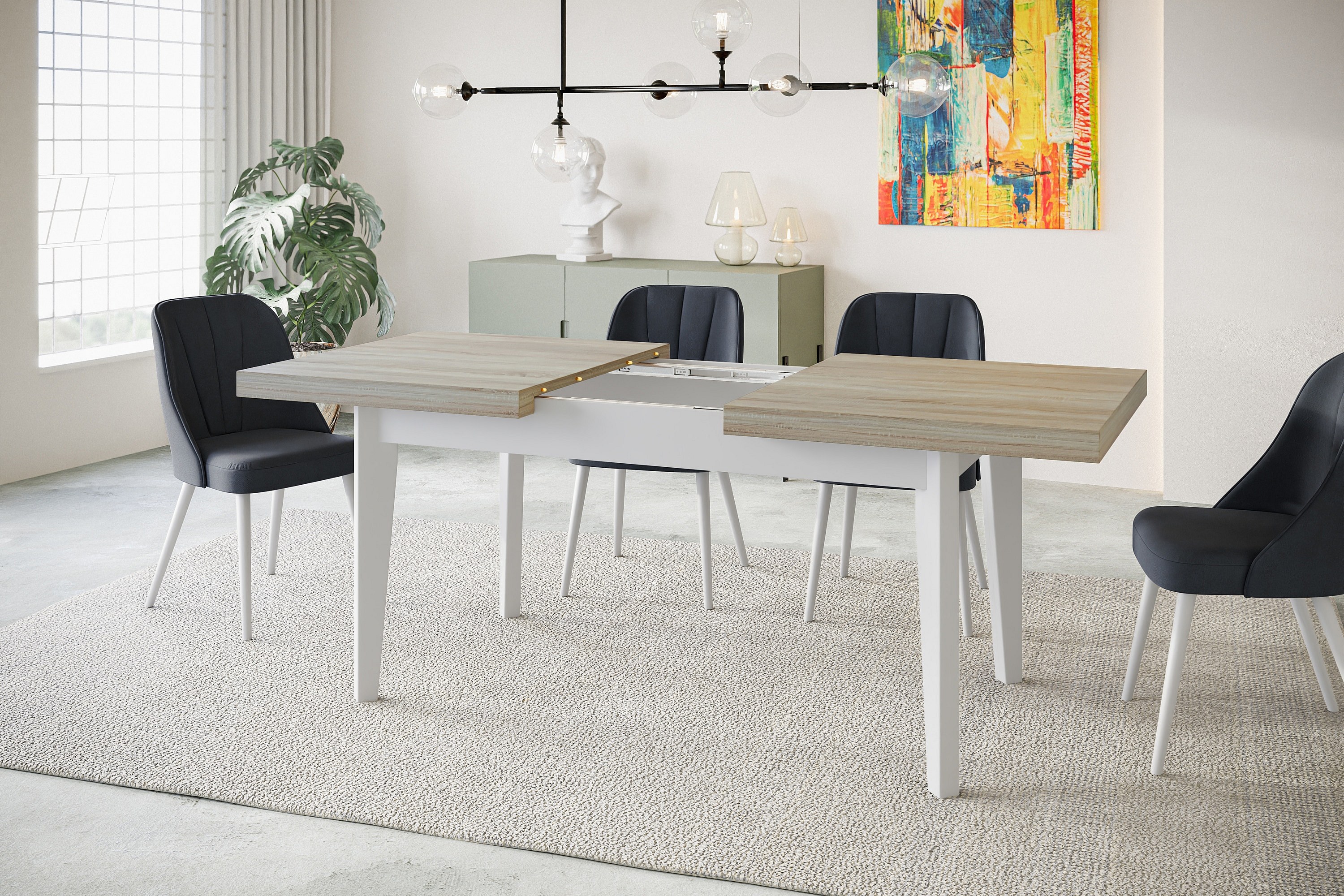 Table de salle à manger rectangulaire SKANDI, table à rallonges, dimensions: 140-180X80X78 cm, couleur: SONOMA, avec pieds en bois de couleur blanche