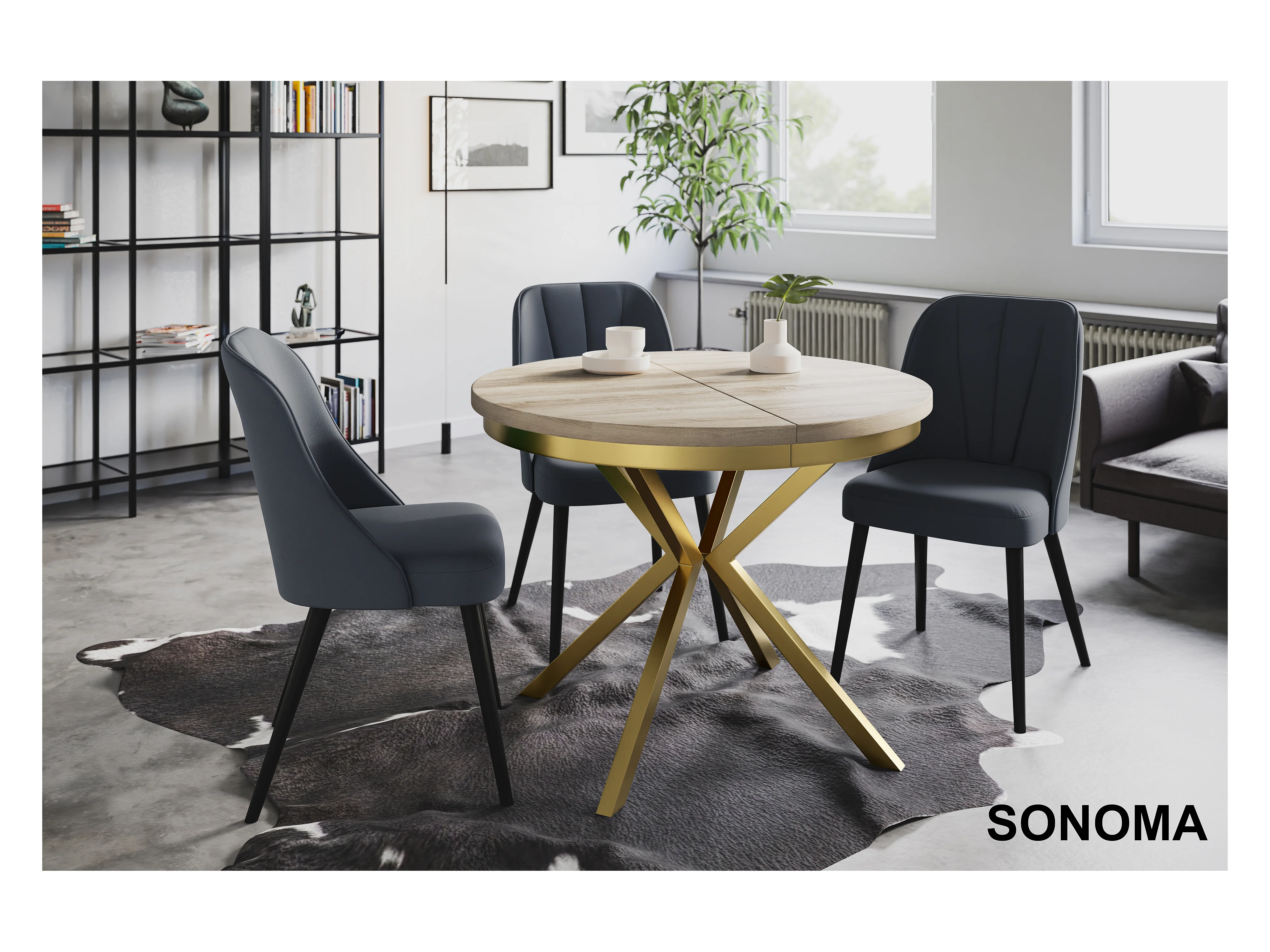 Table de salle à manger ronde BERGO, table à rallonge Diamètre : 90 cm/170 cm, table de salon Couleur : beige, avec pieds métalliques couleur or