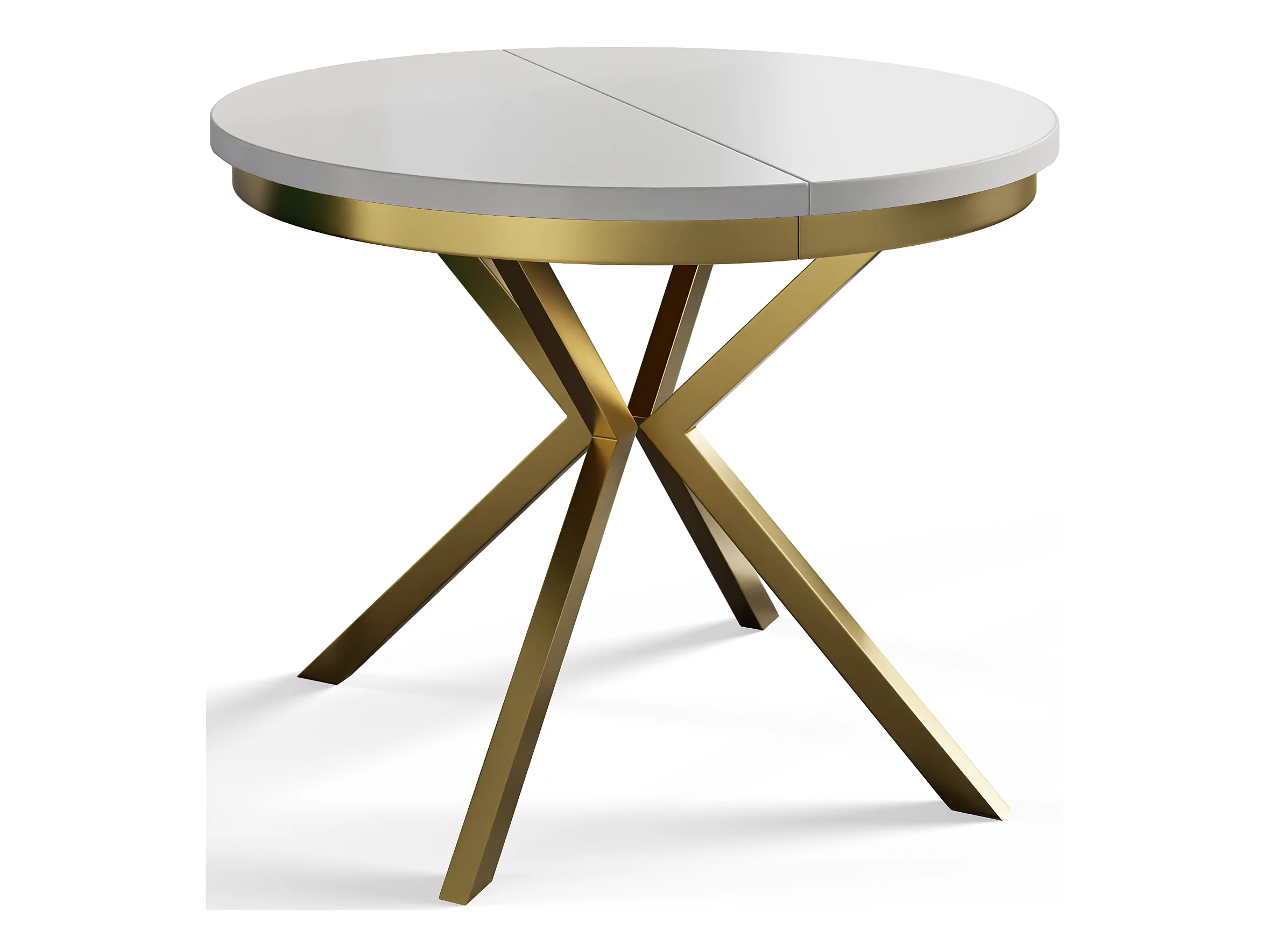 Table de salle à manger ronde BERGO, table à rallonges Diamètre : 120 cm/200 cm, couleur de la table basse : blanc, avec pieds métalliques couleur or