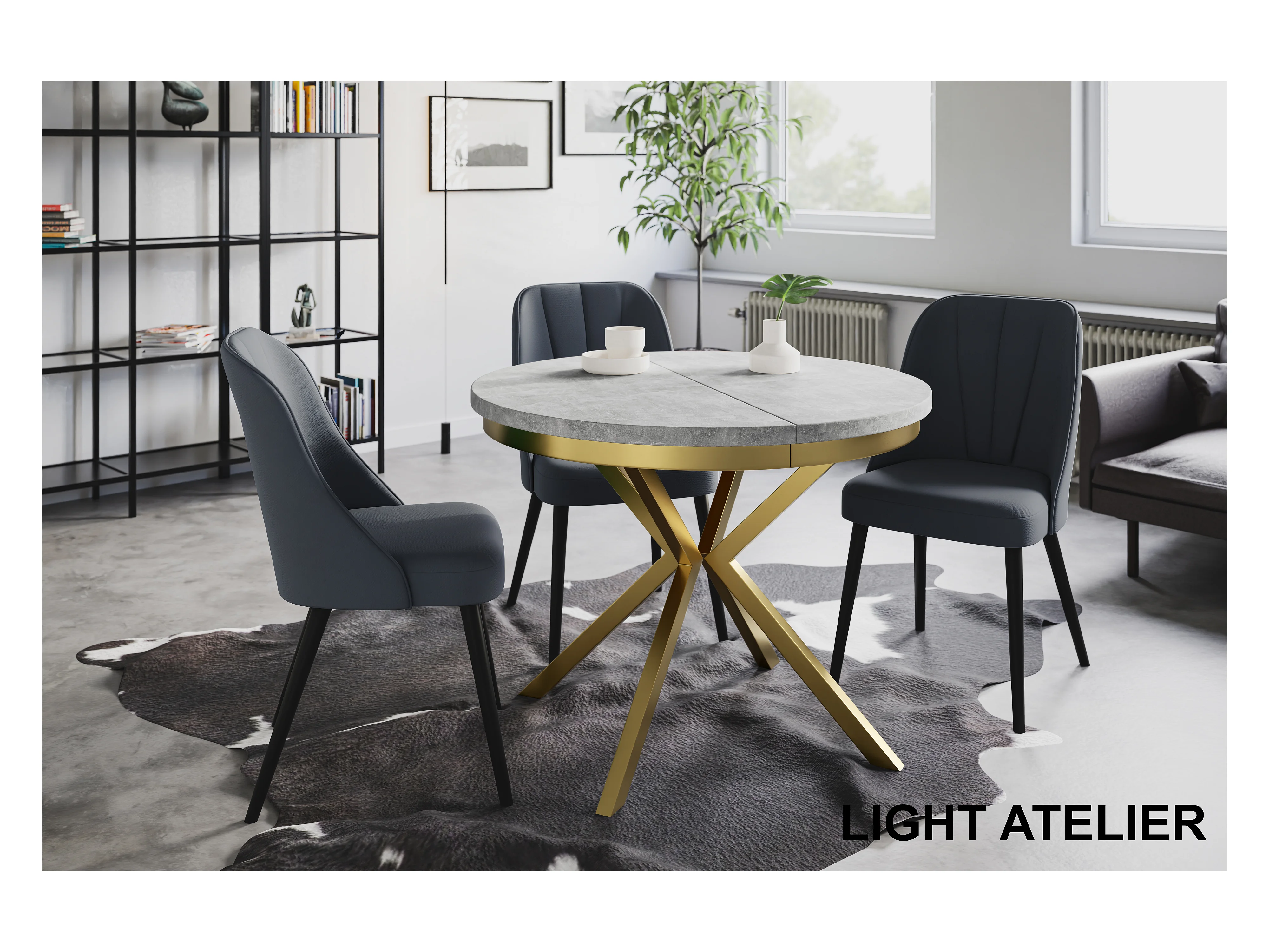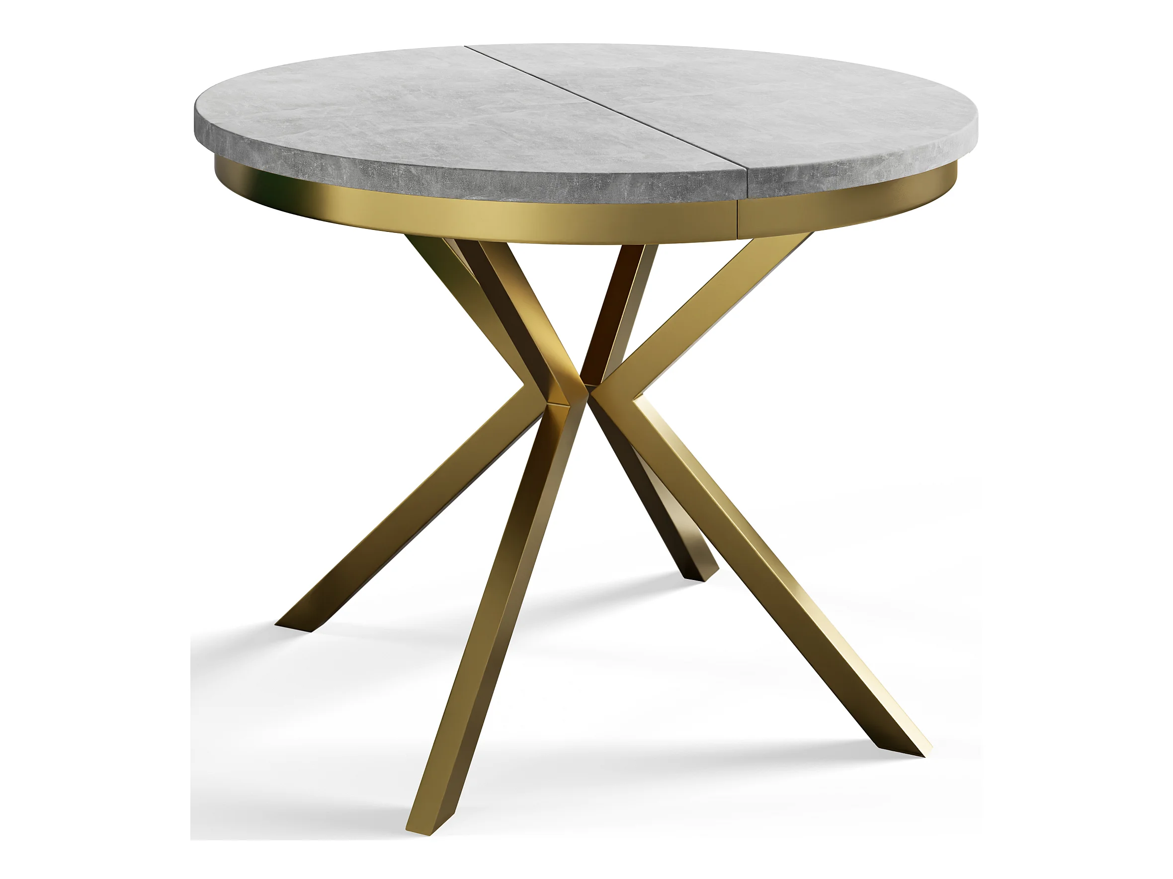Table de salle à manger ronde BERGO, table à rallonges Diamètre : 120 cm/200 cm, couleur de la table basse : gris clair, avec pieds métalliques couleur or