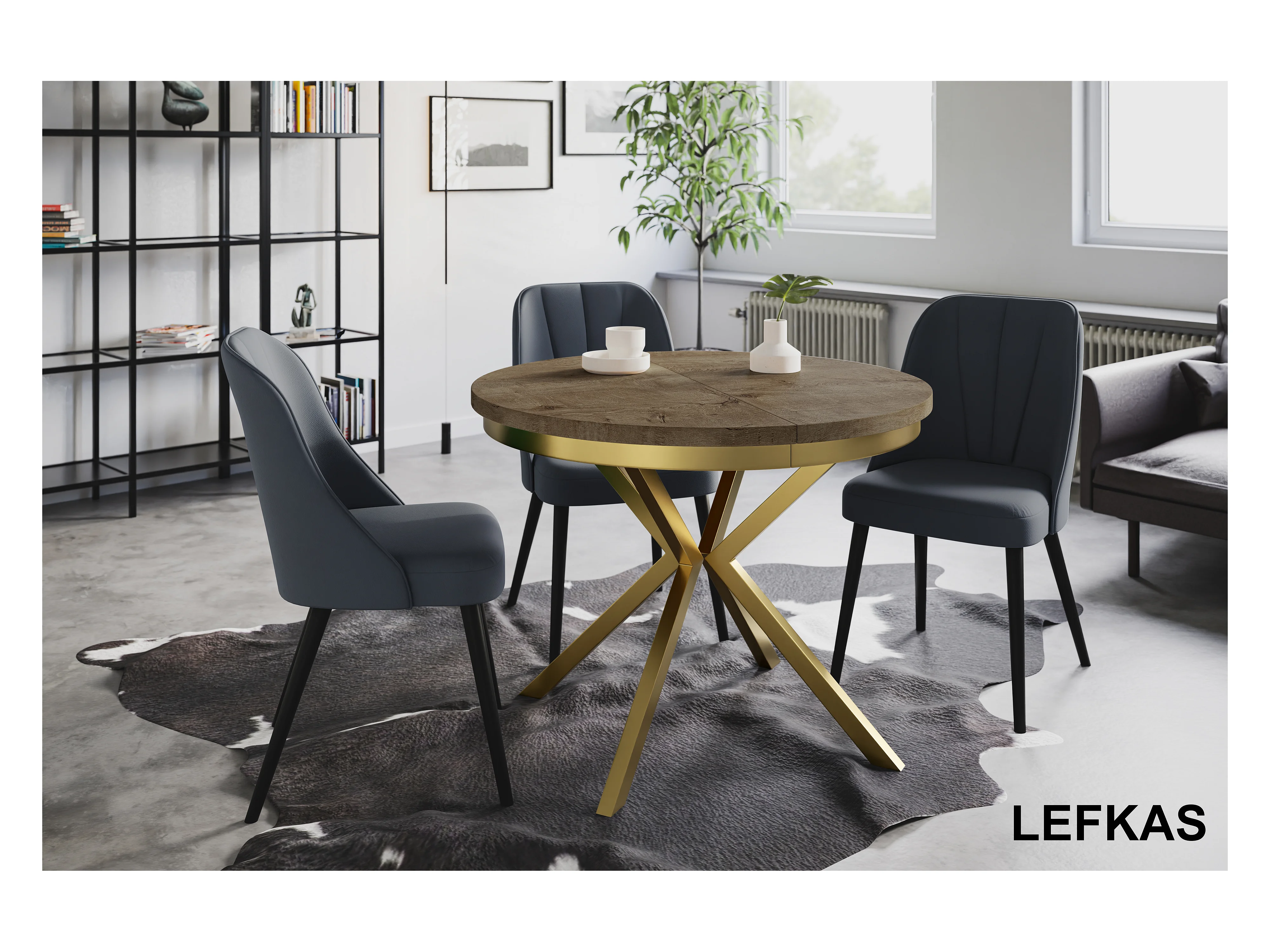 Table de salle à manger ronde BERGO, table à rallonges Diamètre : 90 cm/170 cm, couleur de la table basse : gris, avec pieds métalliques couleur or