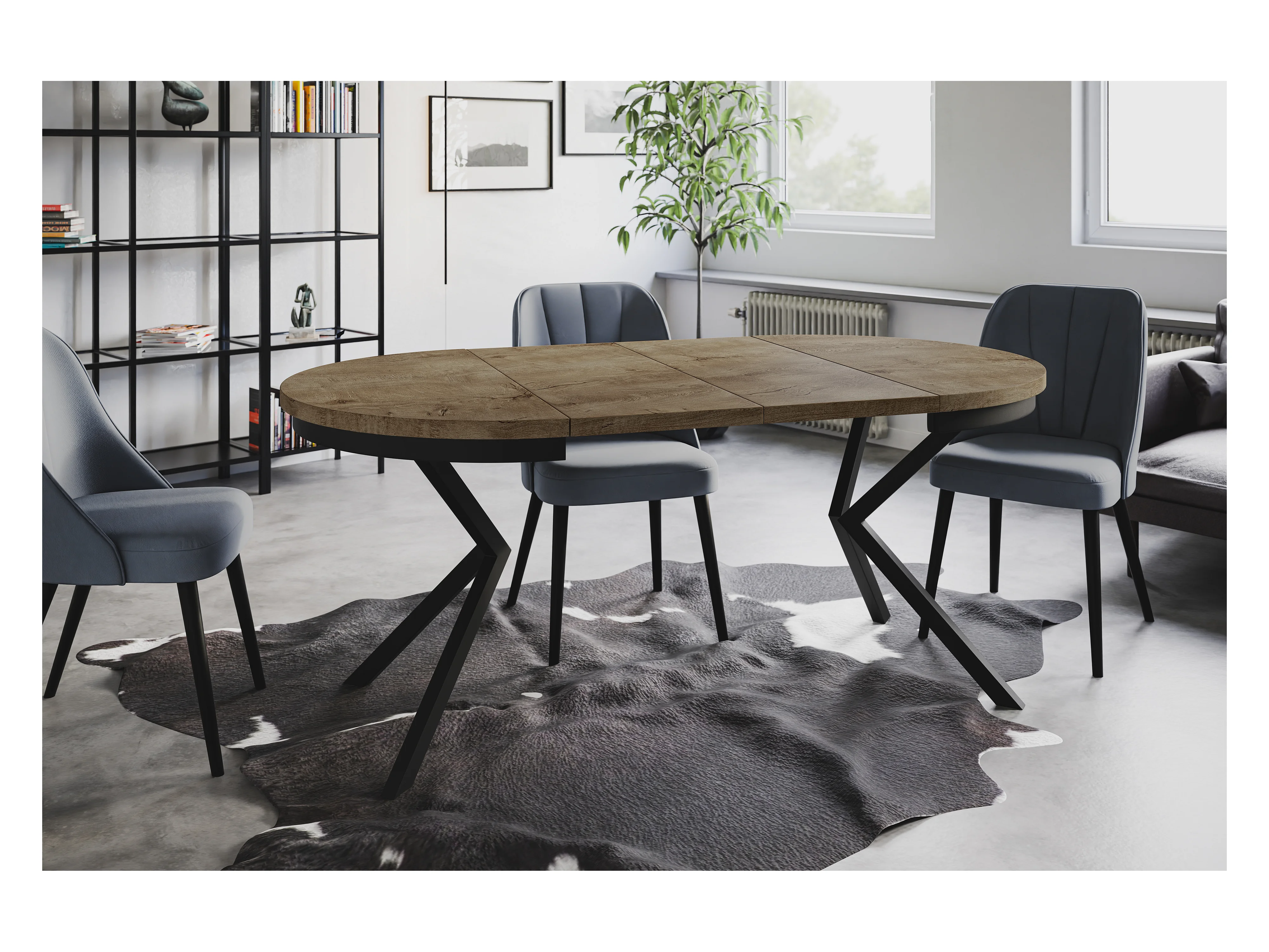 Table de salle à manger ronde BERGO, table à rallonges Diamètre : 90 cm/170 cm, couleur de la table basse : gris, avec pieds métalliques de couleur noire