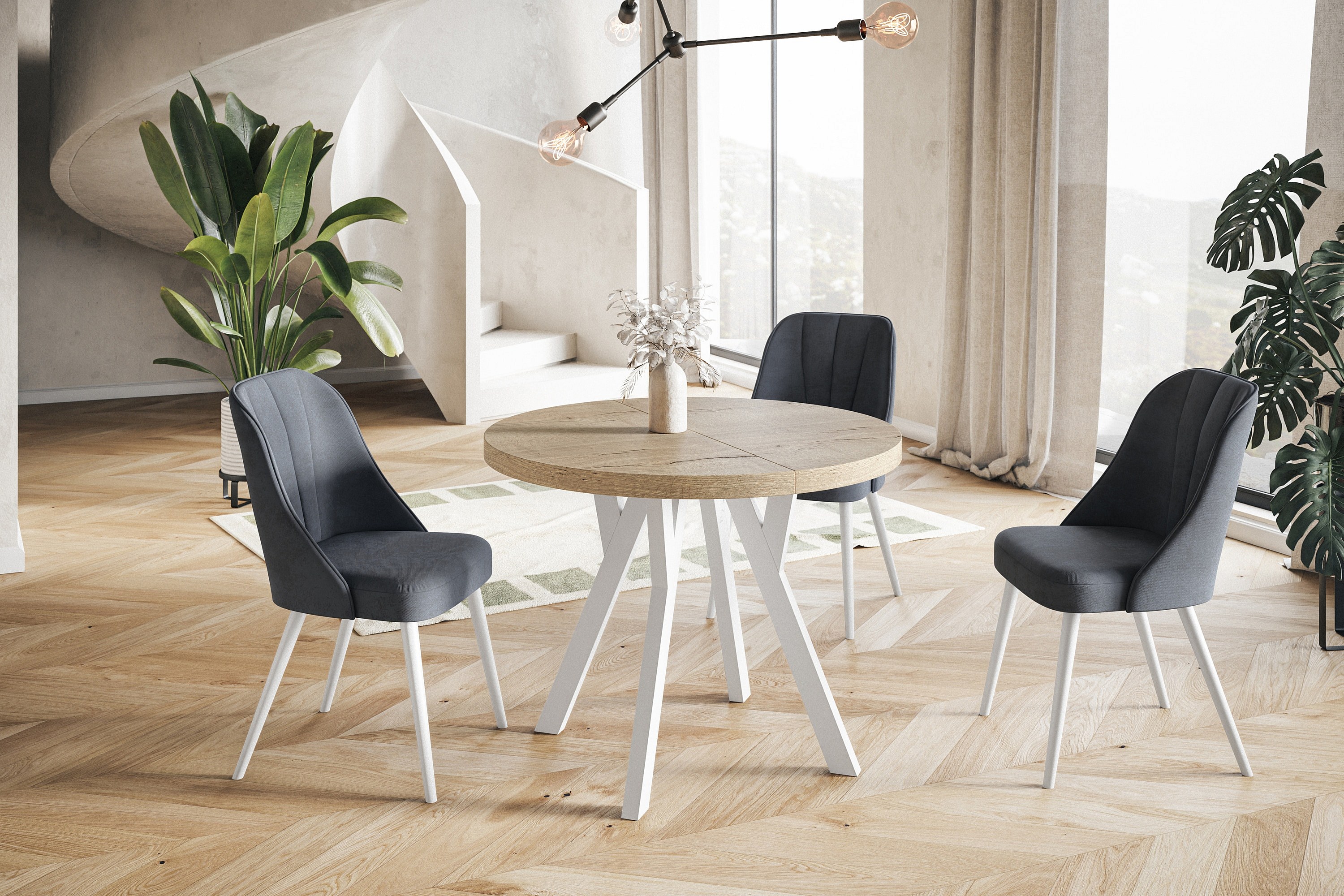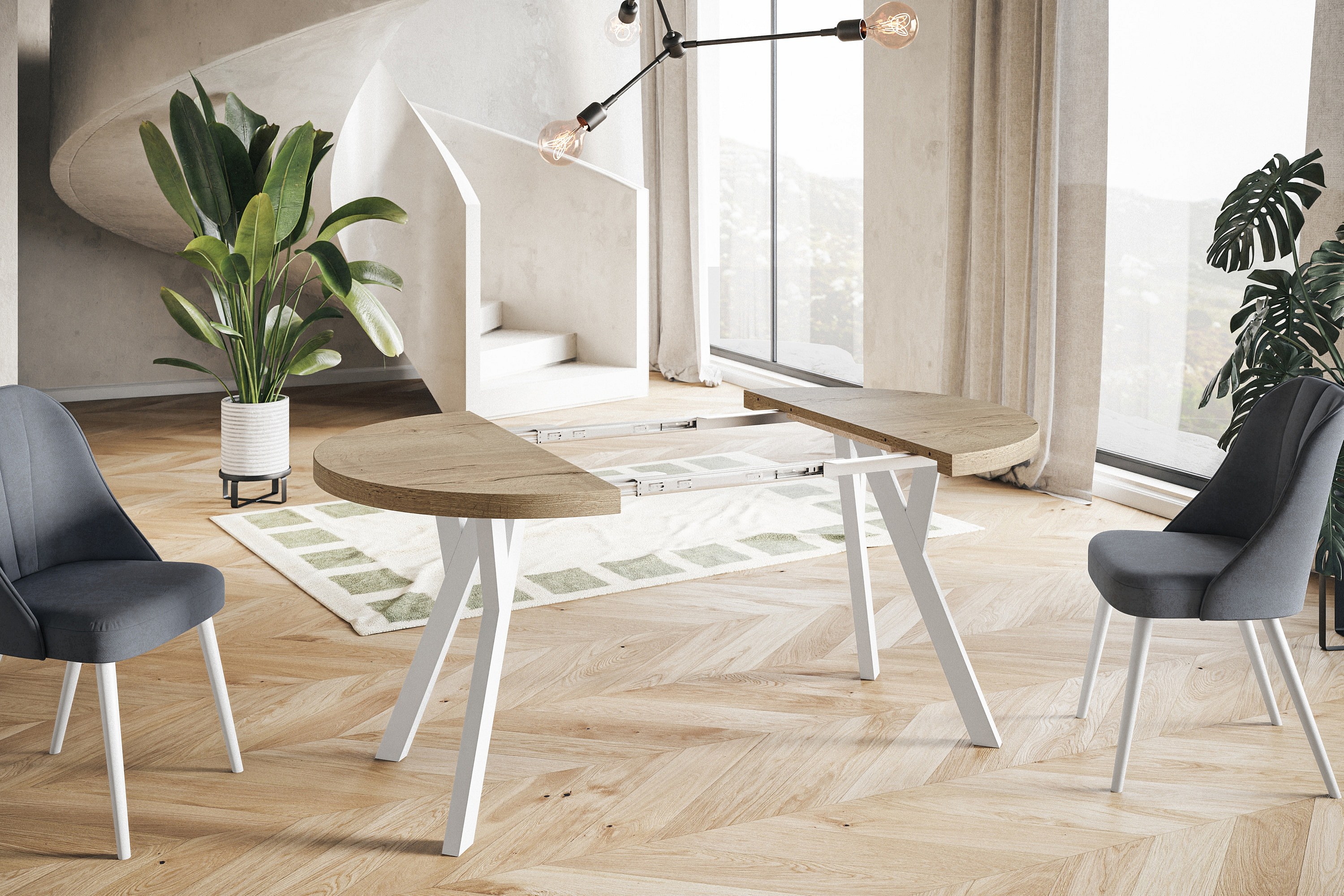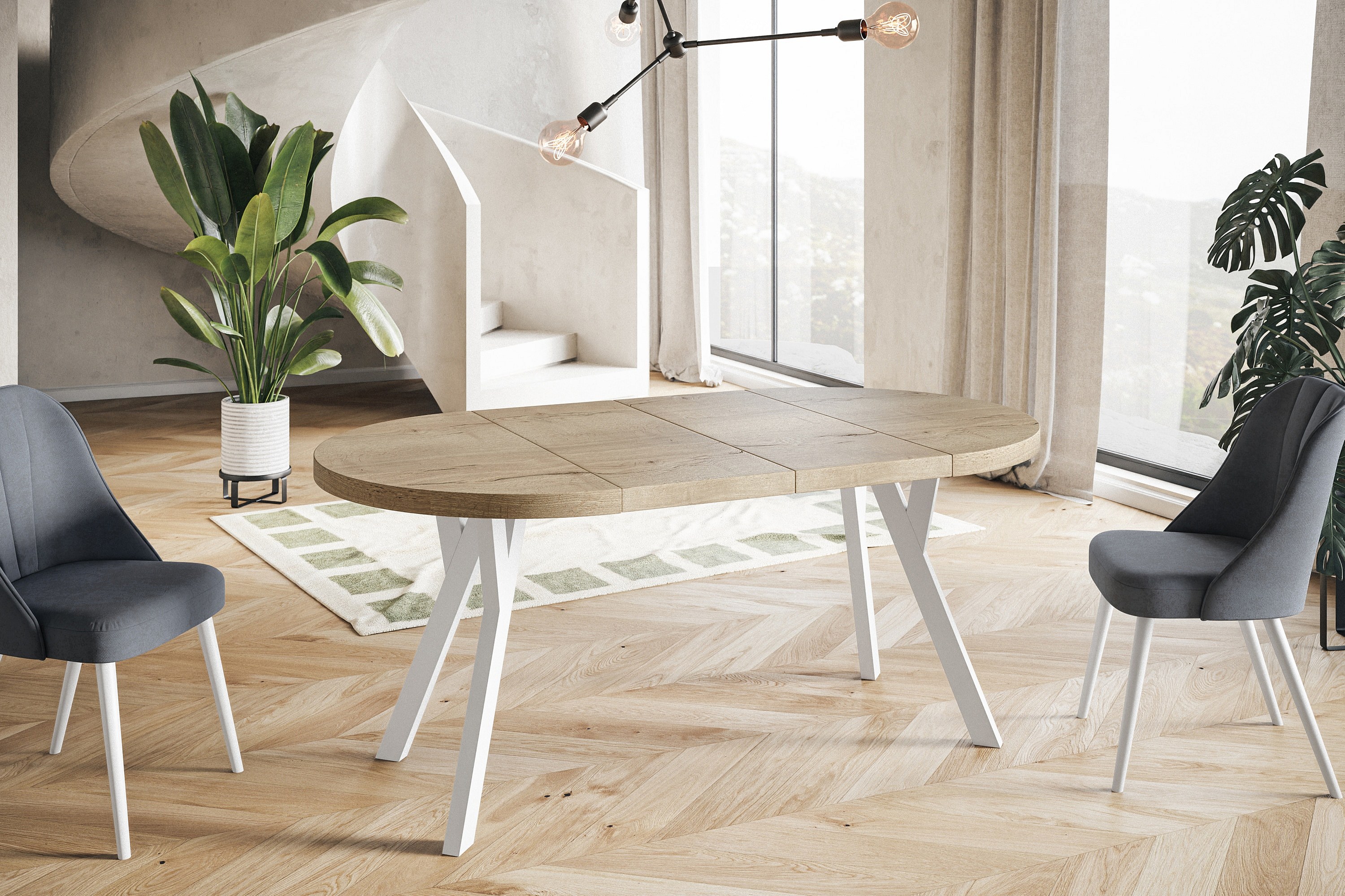 Table de salle à manger ronde OVO, table à rallonges Diamètre : 100 cm à 200 cm, couleur de la table basse : HALIFAX, avec pieds en bois de couleur blanche