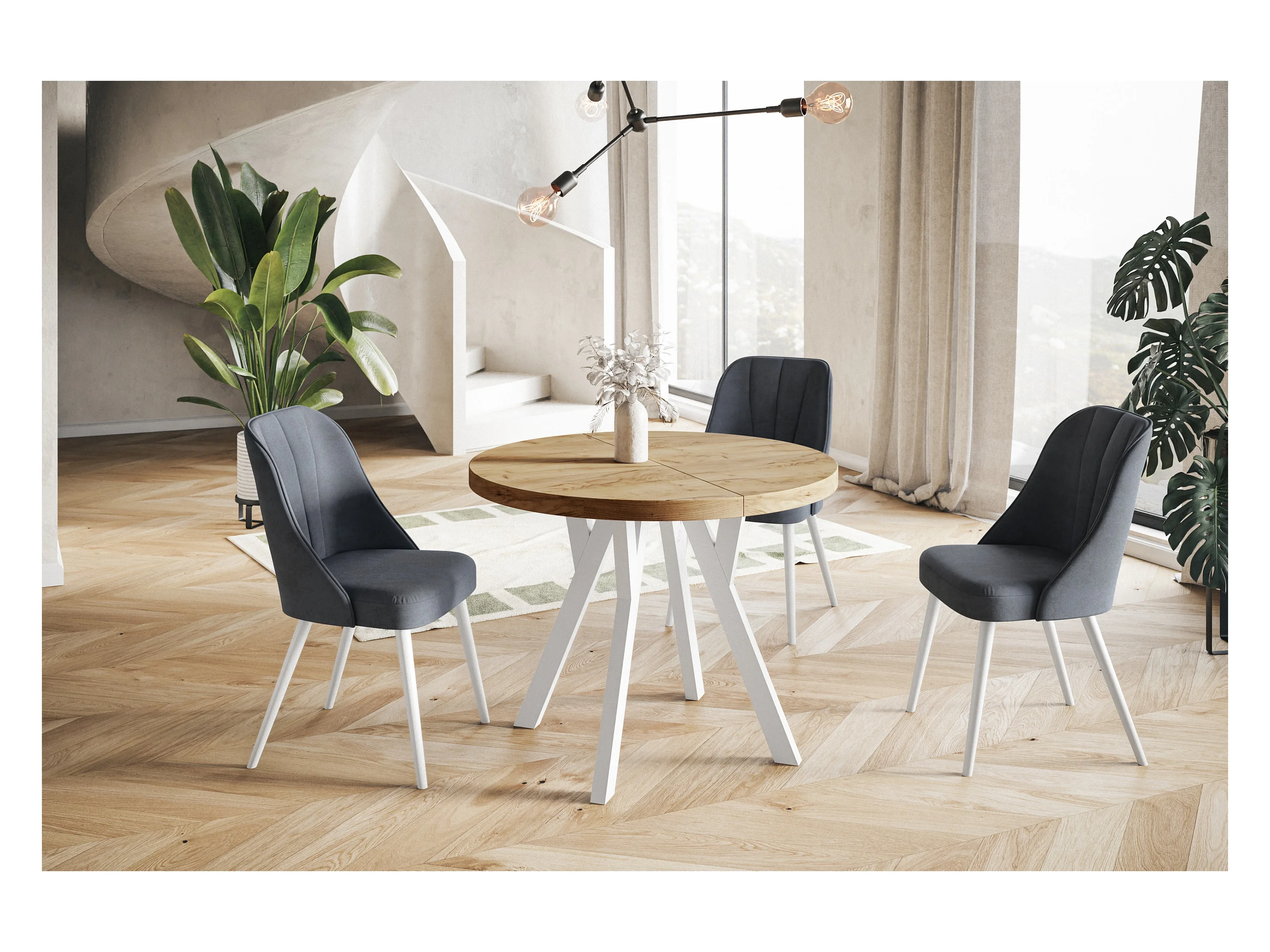 Table de salle à manger ronde OVO, table à rallonges Diamètre : 110 cm à 210 cm, couleur de la table basse : CRAFT, avec pieds en bois de couleur blanche