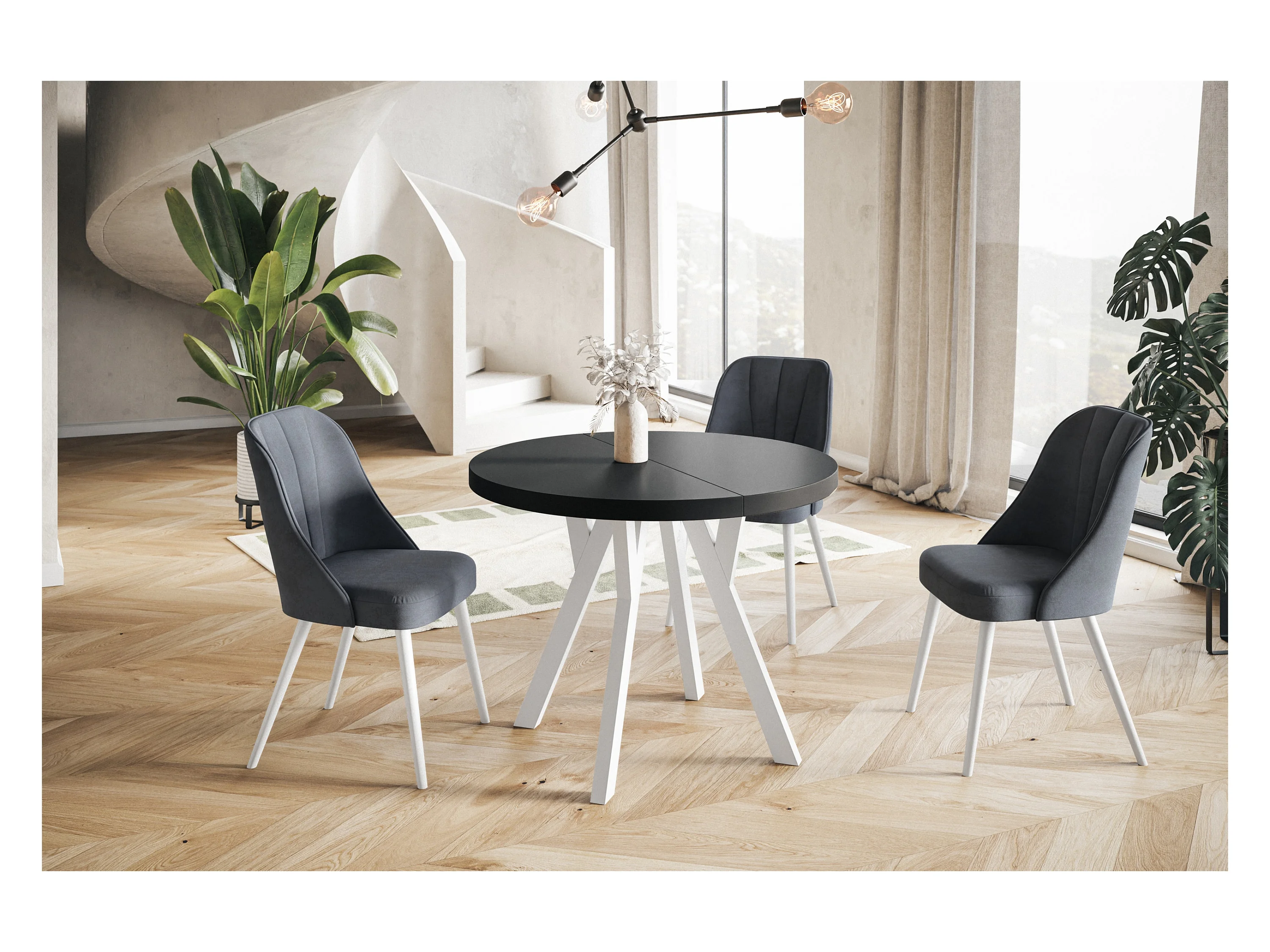 Table de salle à manger ronde OVO, table à rallonges Diamètre : 110 cm à 210 cm, couleur de la table basse : noir, avec pieds en bois de couleur blanche