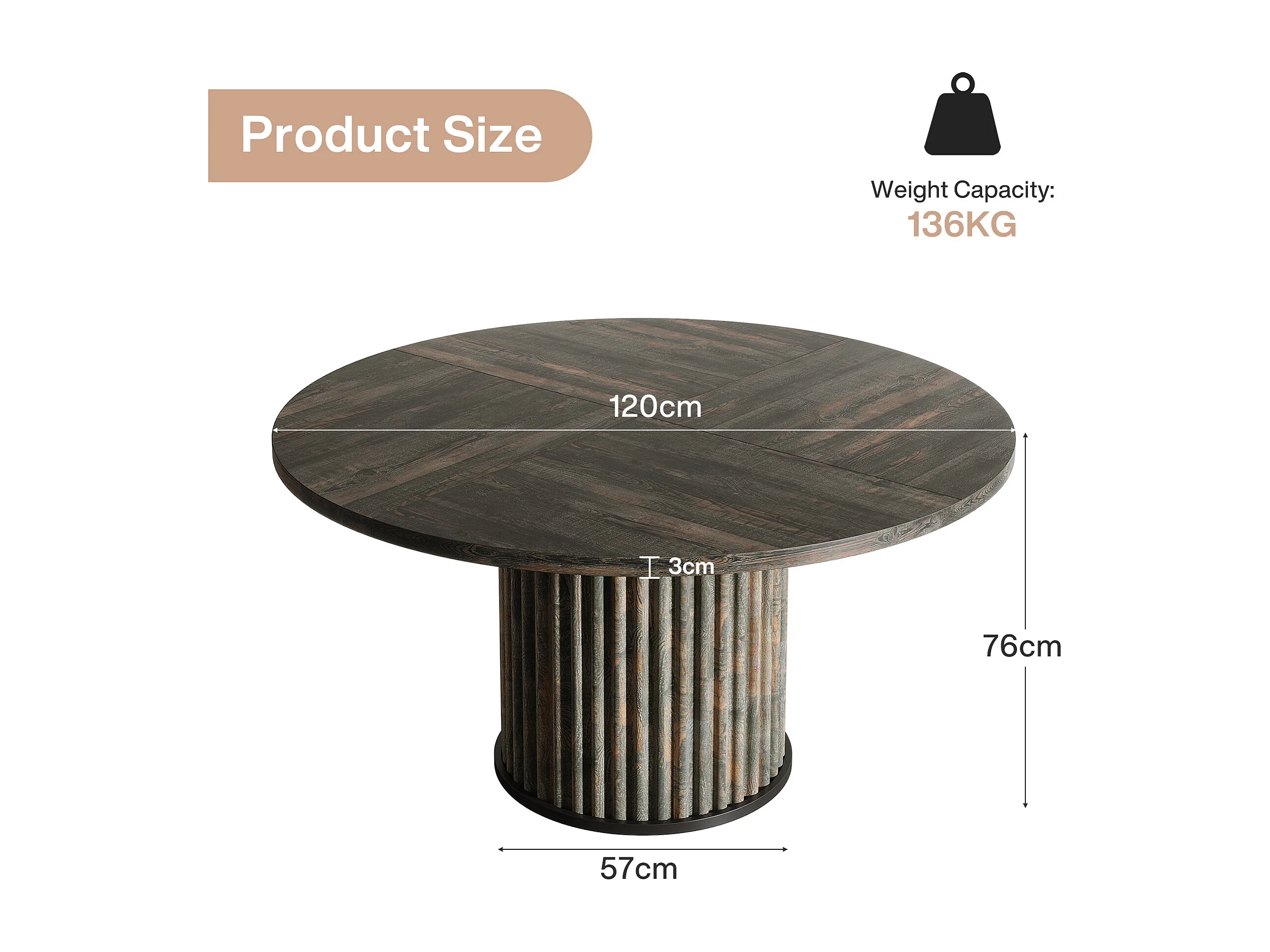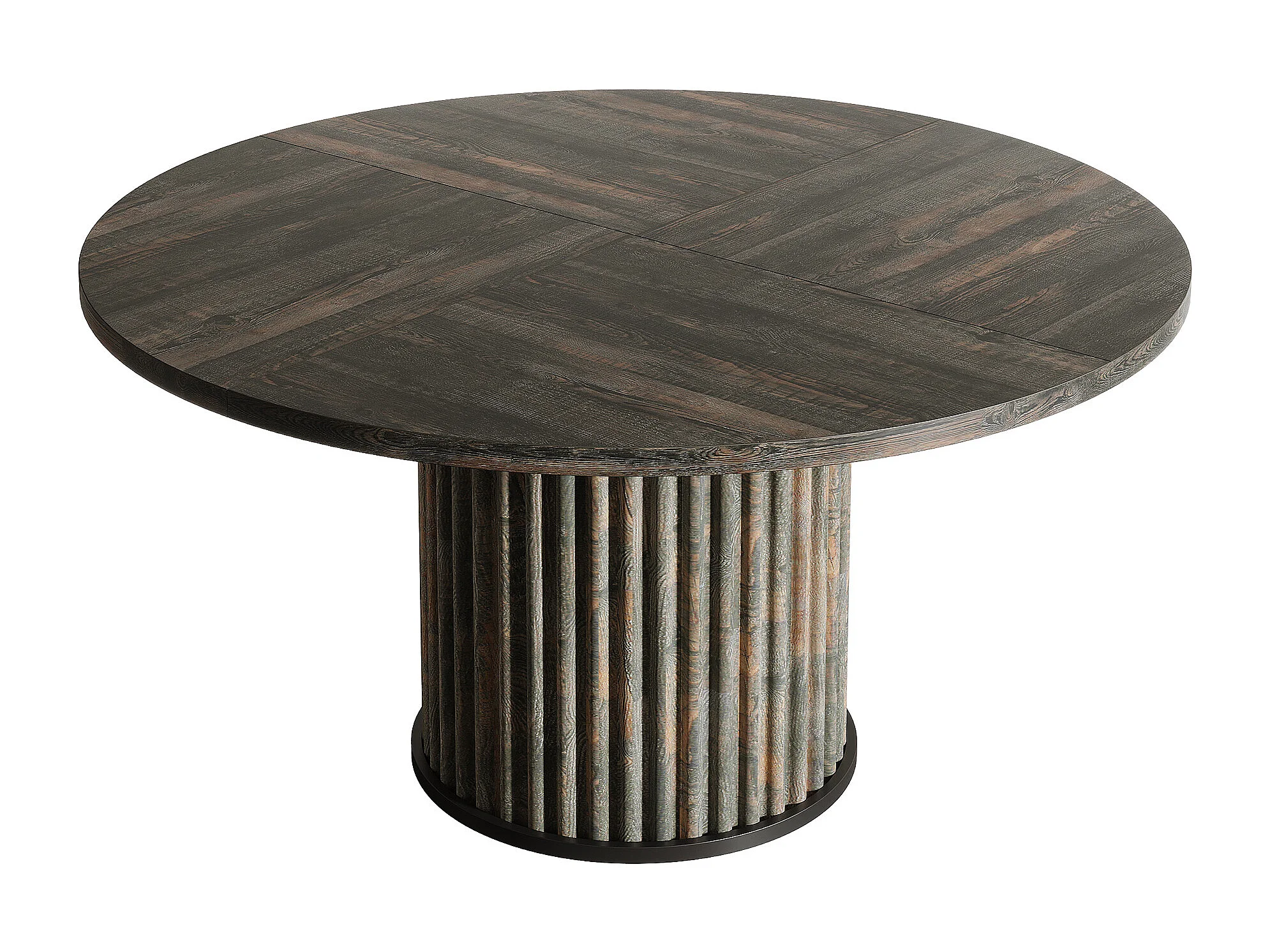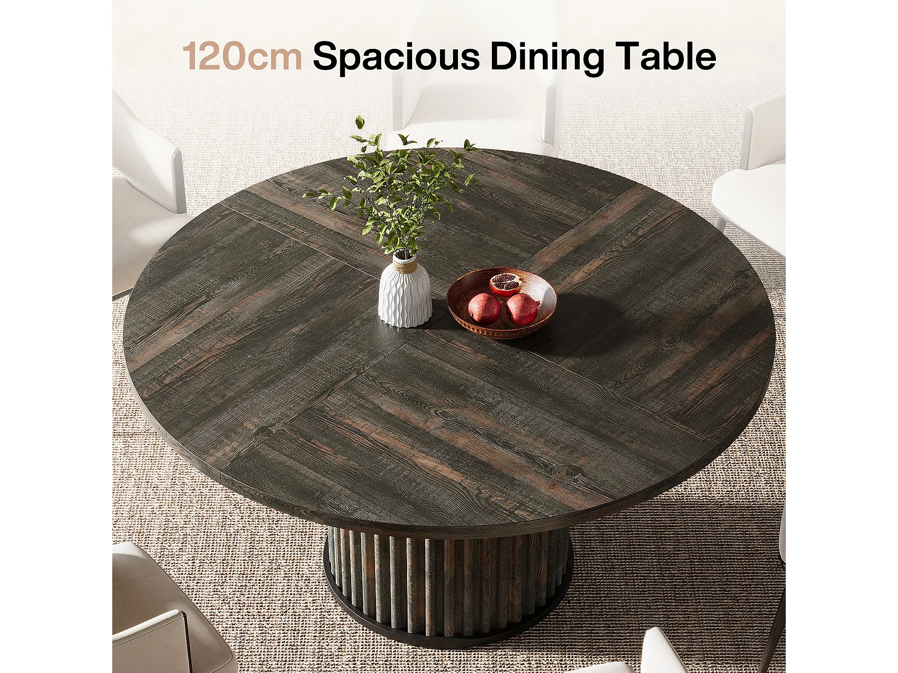Table de salle à manger ronde pour 4 à 6 personnes, 120 cm, style moderne, avec piètement rond cannelé.