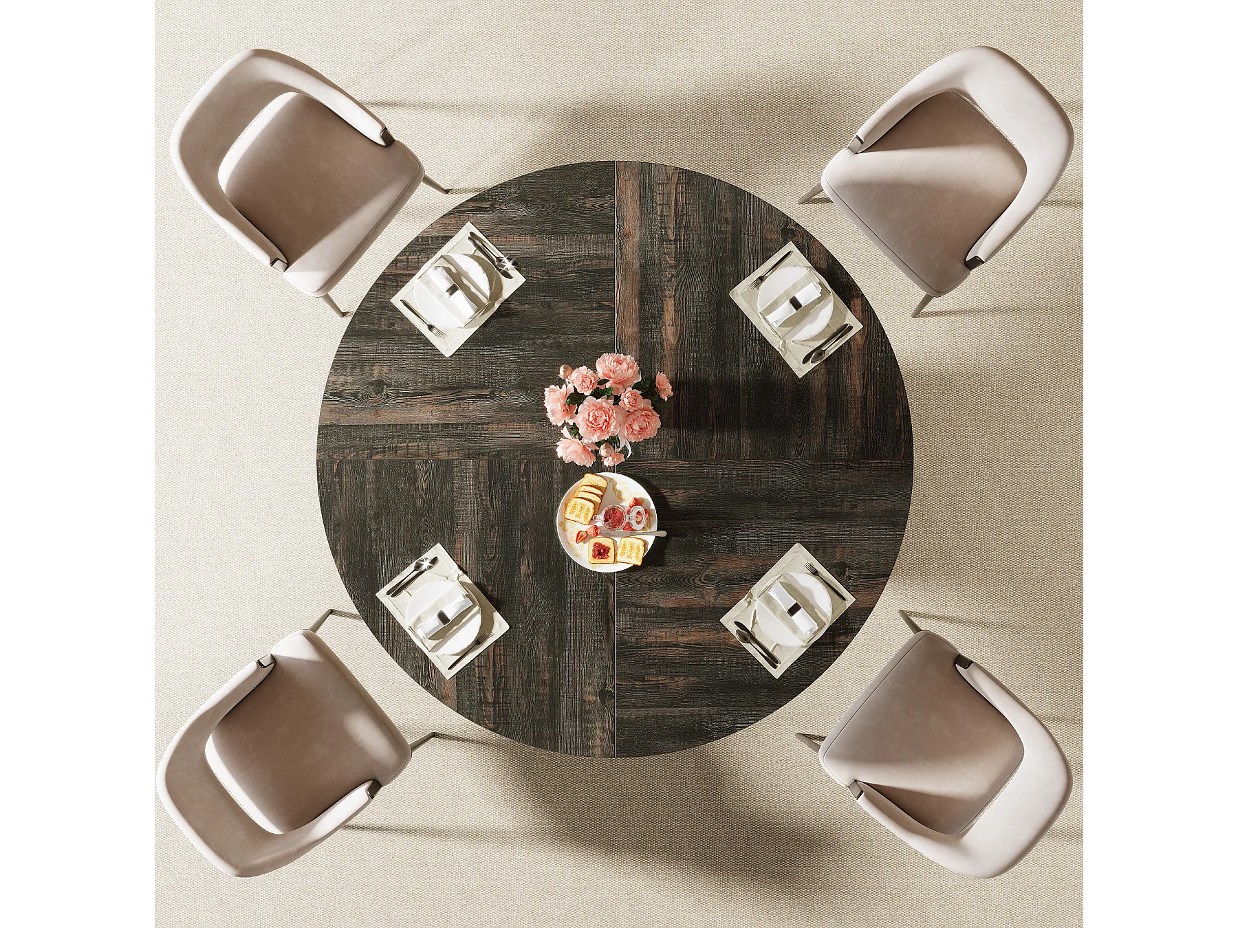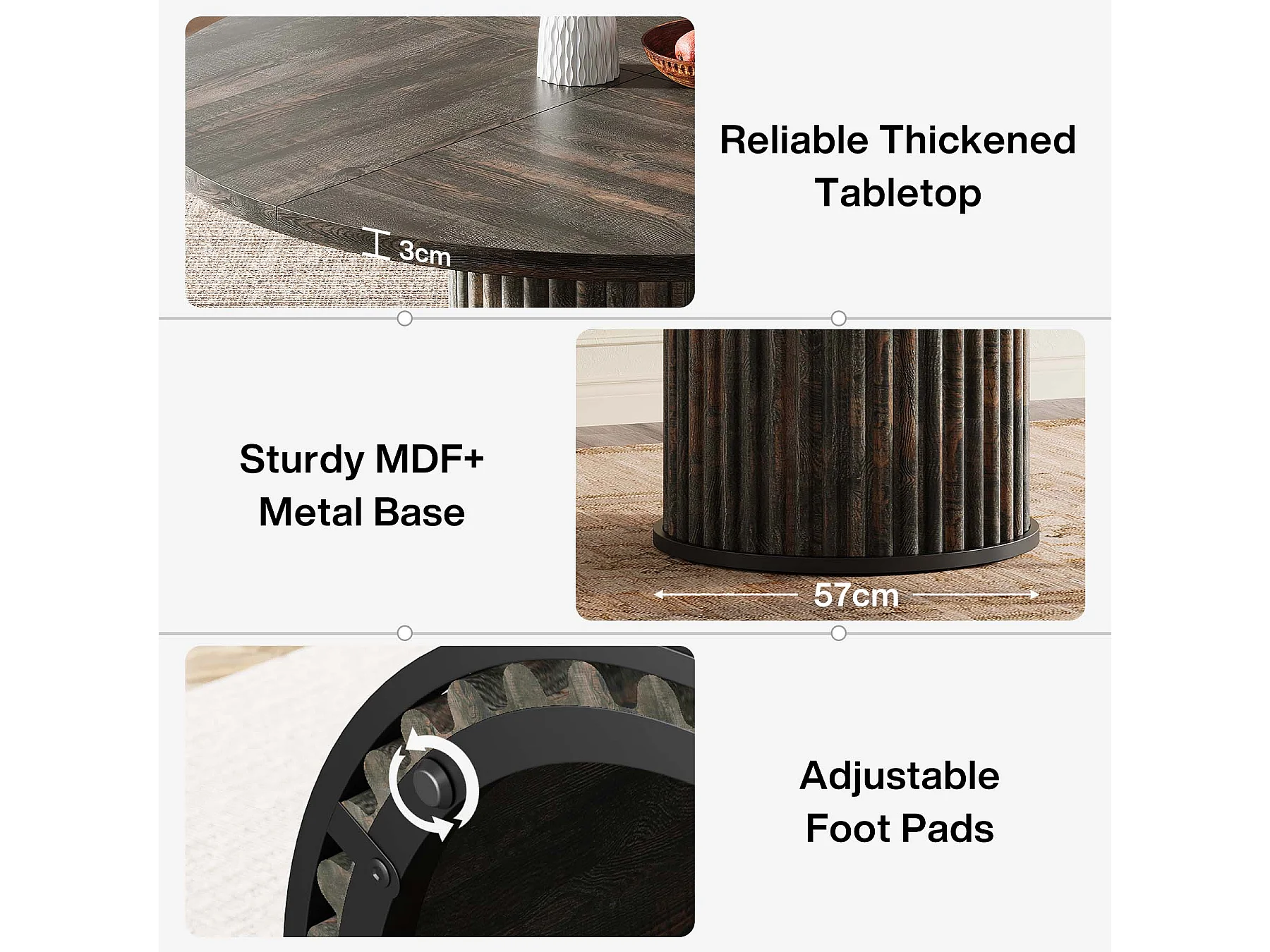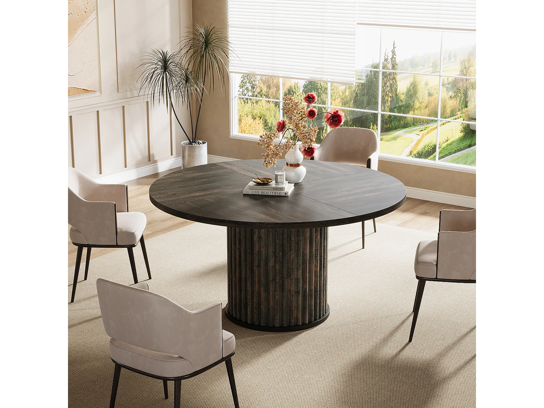 Table de salle à manger ronde pour 4 à 6 personnes, 120 cm, style moderne, avec piètement rond cannelé.