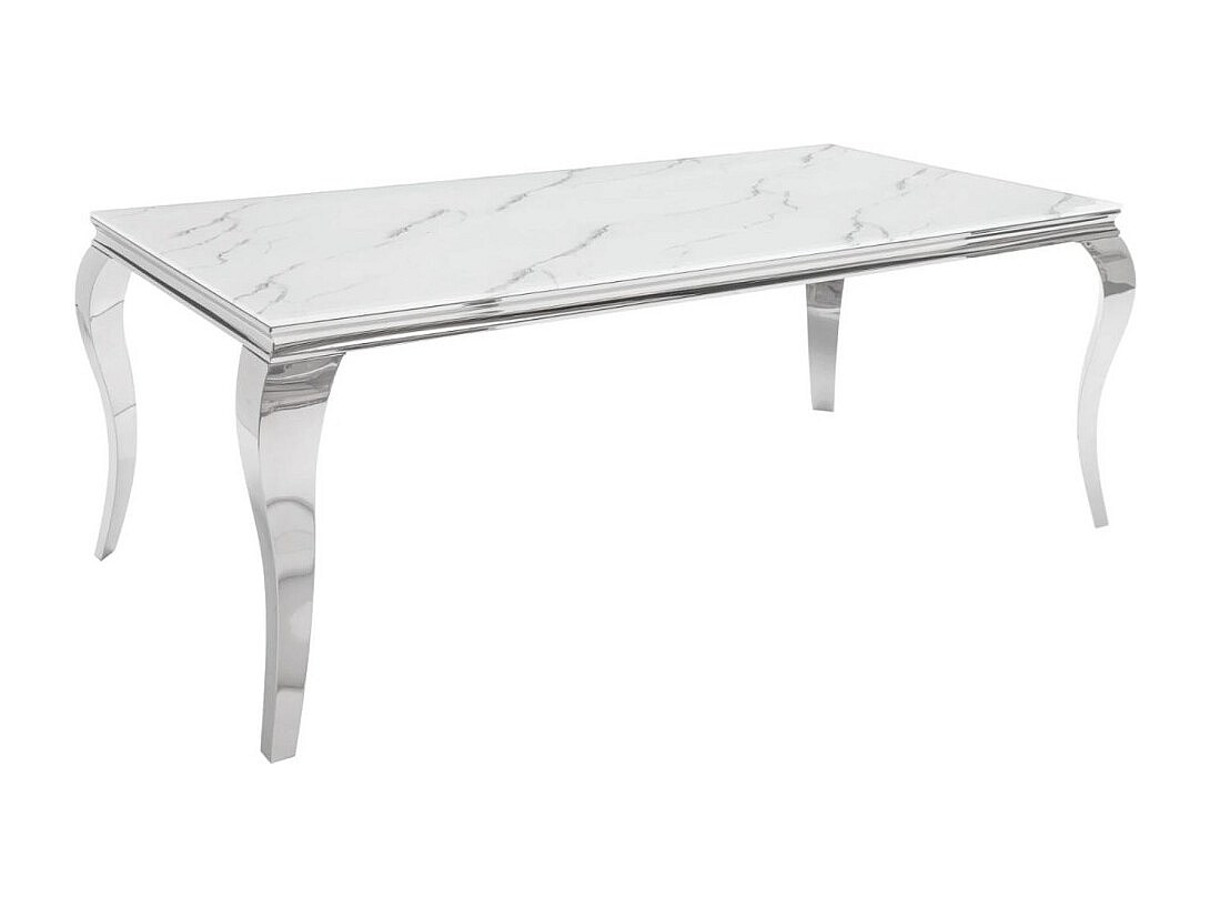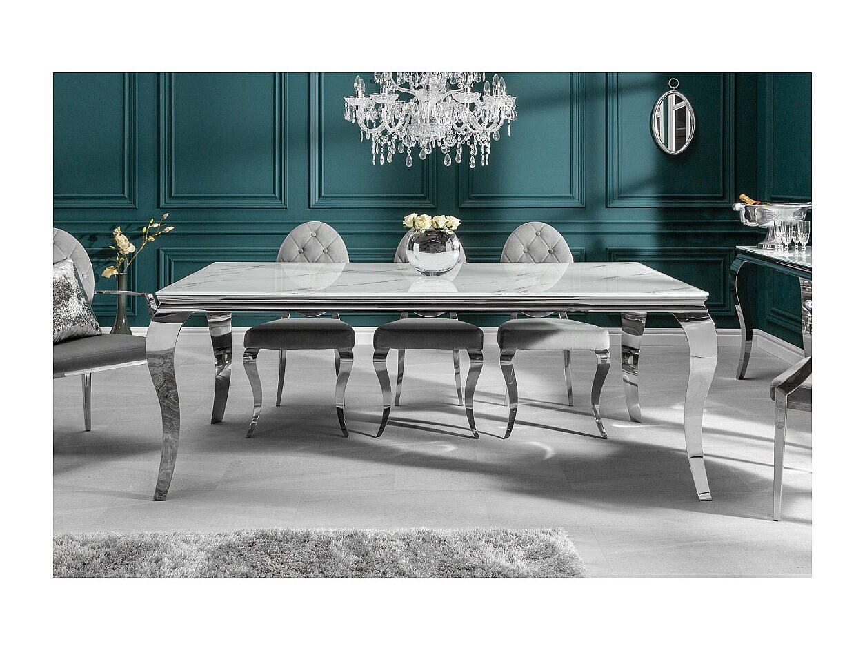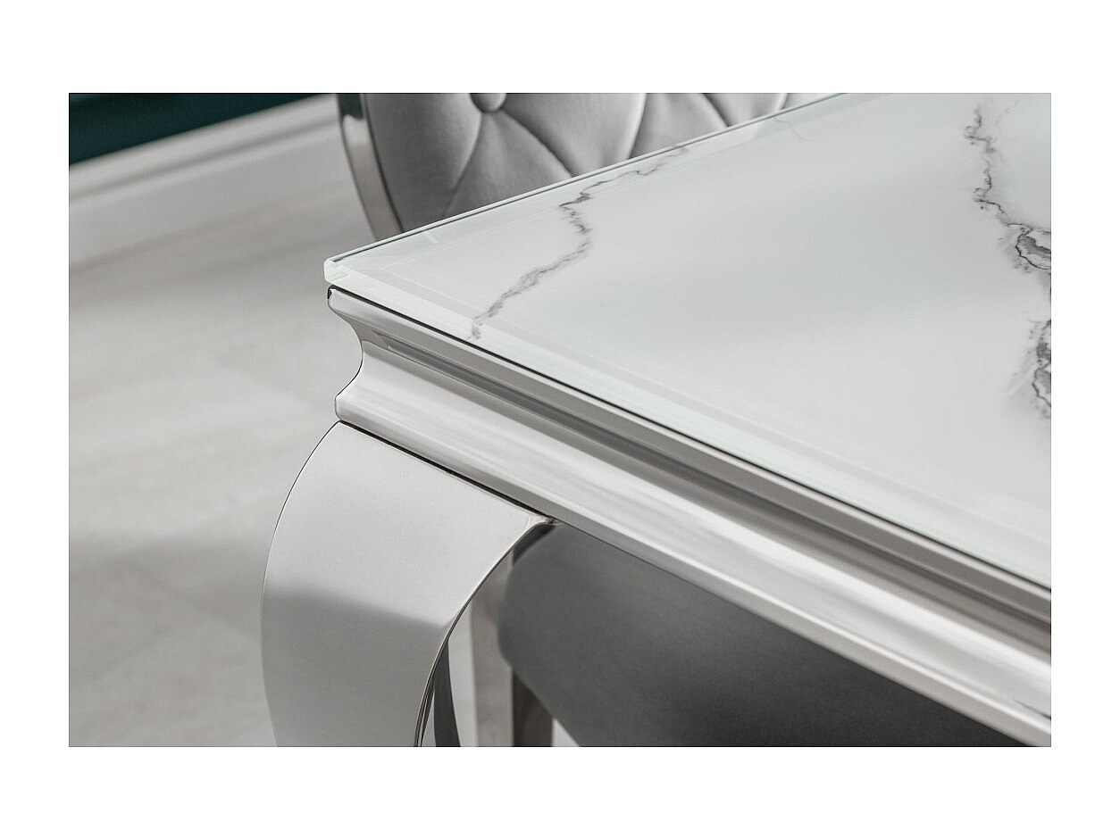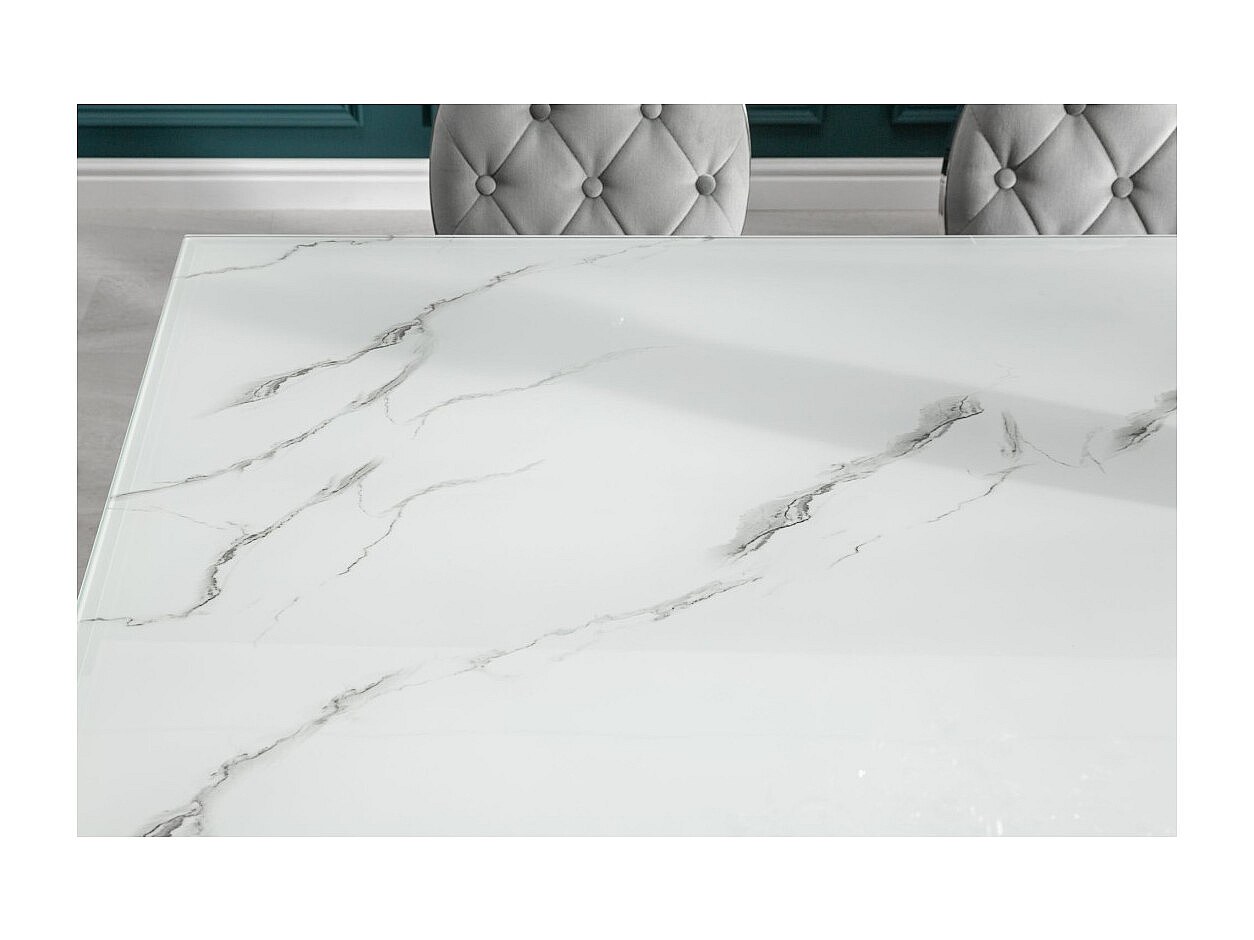Table de salle à manger VELENA 180 cm – Plateau en verre effet marbre blanc – Structure en acier argenté