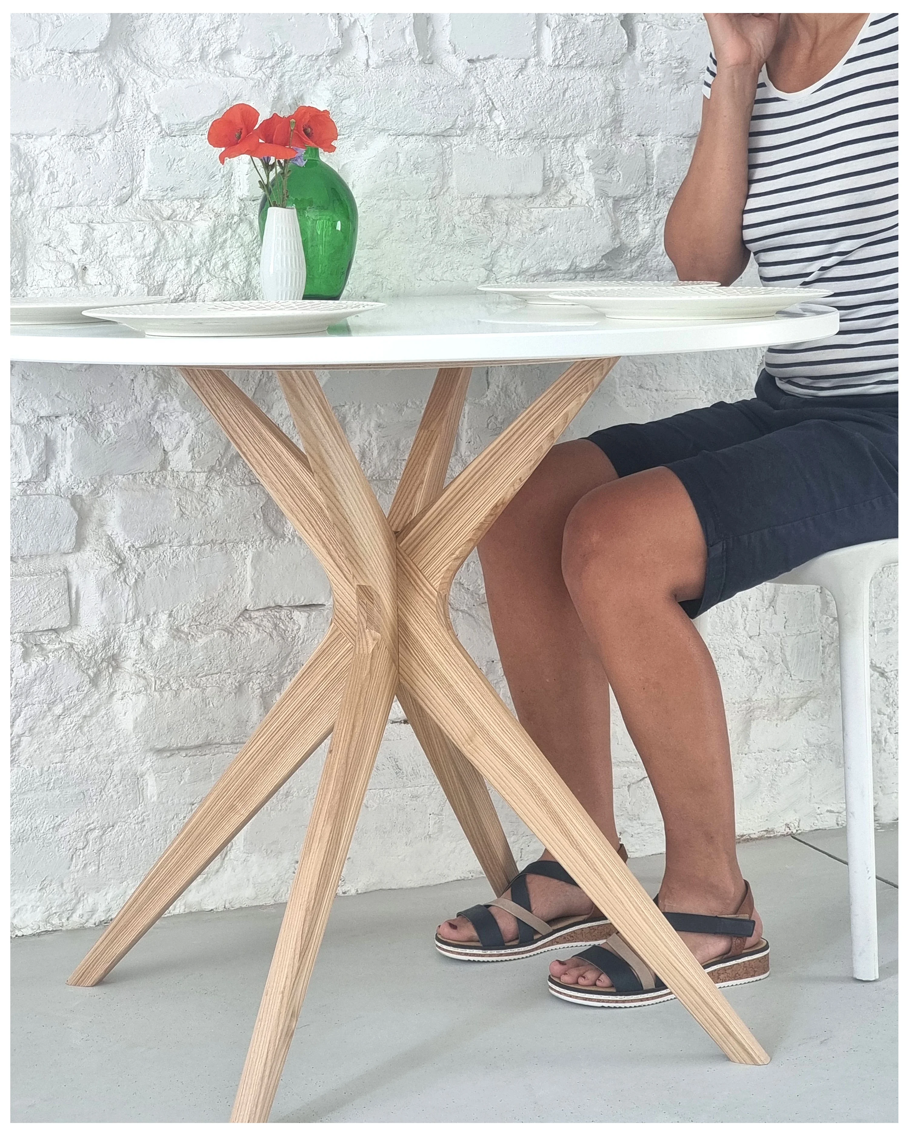 Table demi-ovale à manger 80x80 cm, 3 personnes, MDF Blanc Craie | frêne