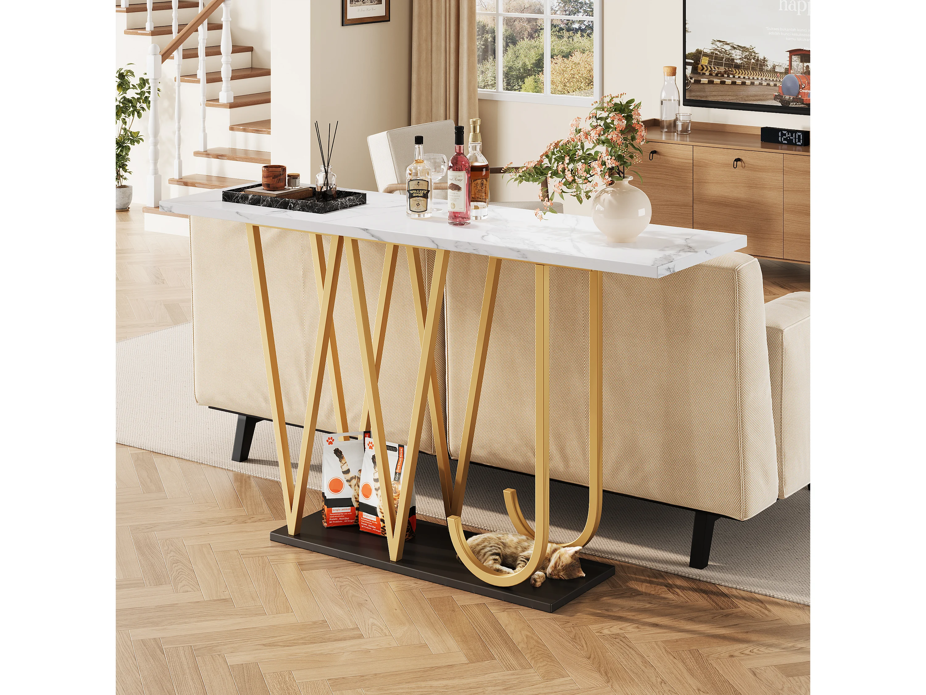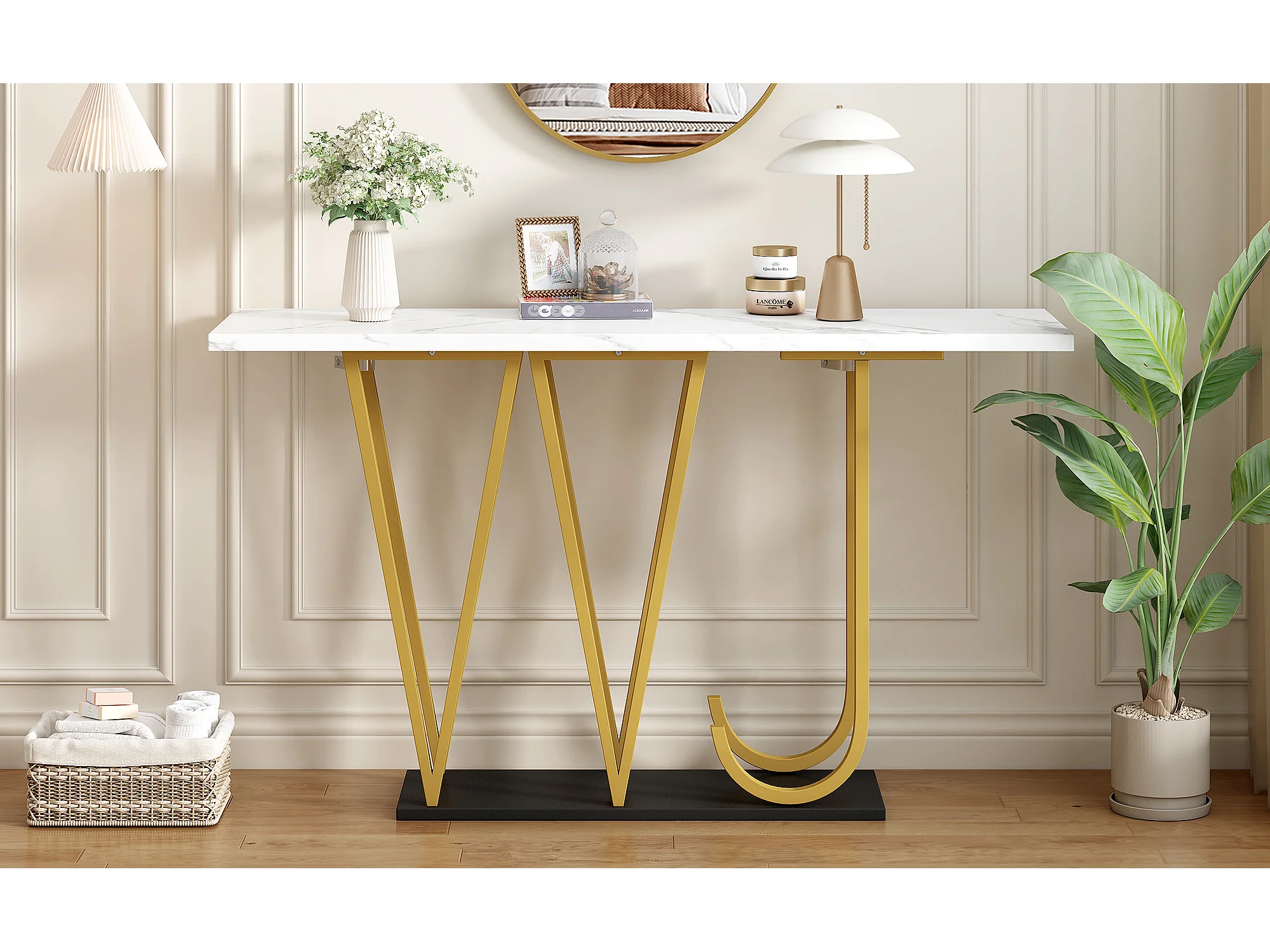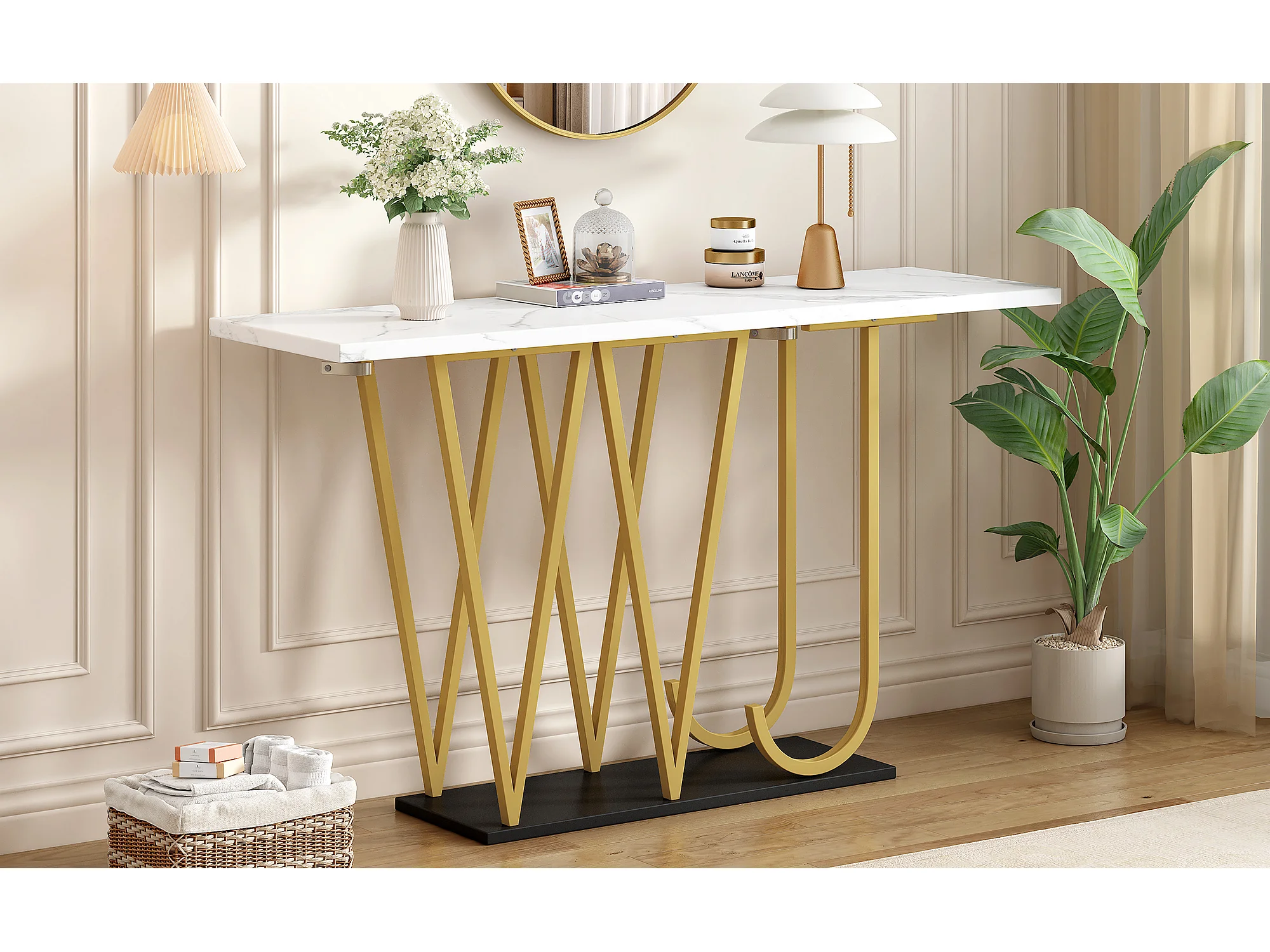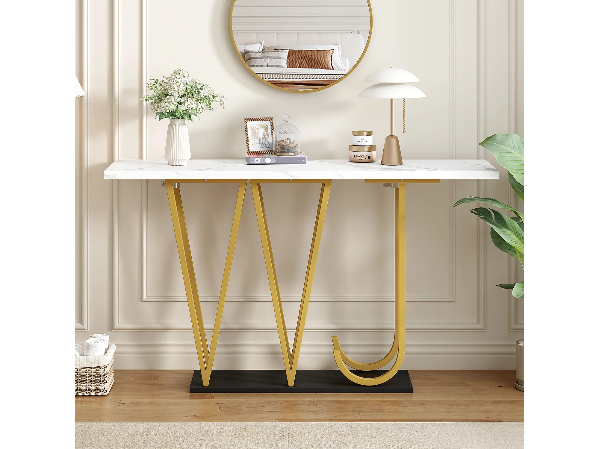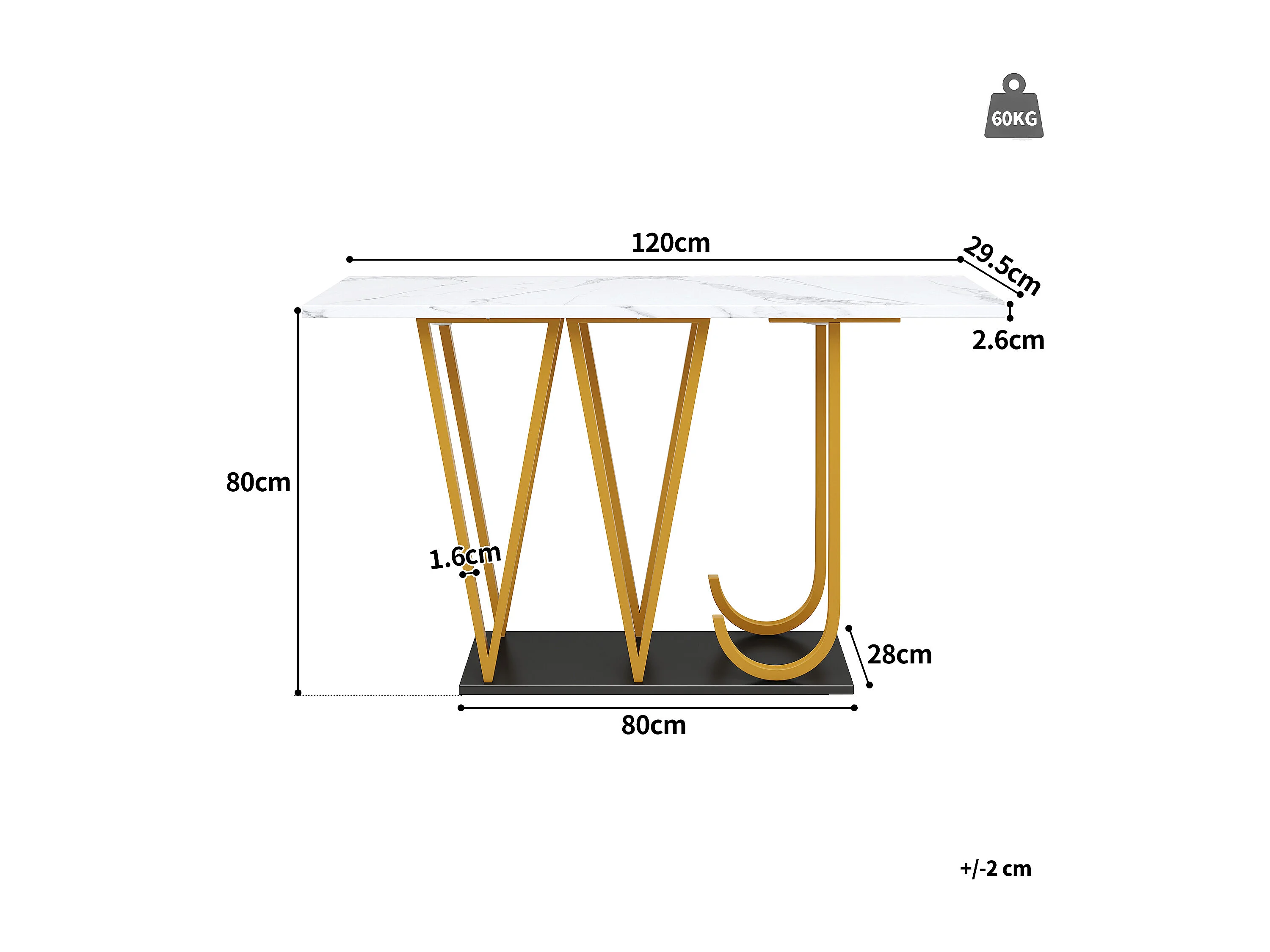 Table d'entrée - 120 x 29.5 x 80 cm - table à manger en bois - plateau de table aspect marbre - MDF + métal - blanc