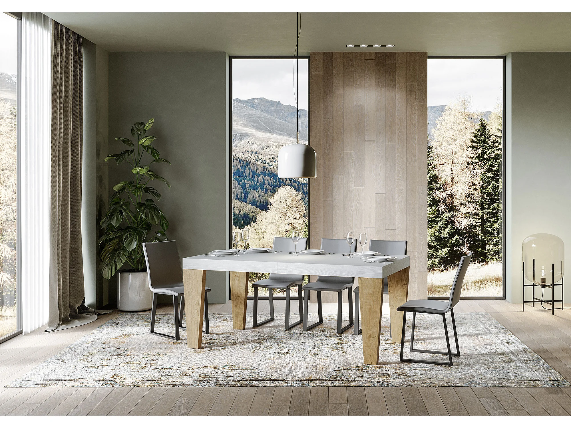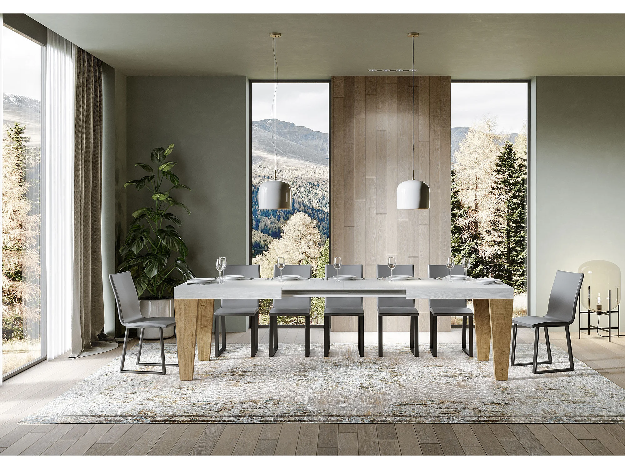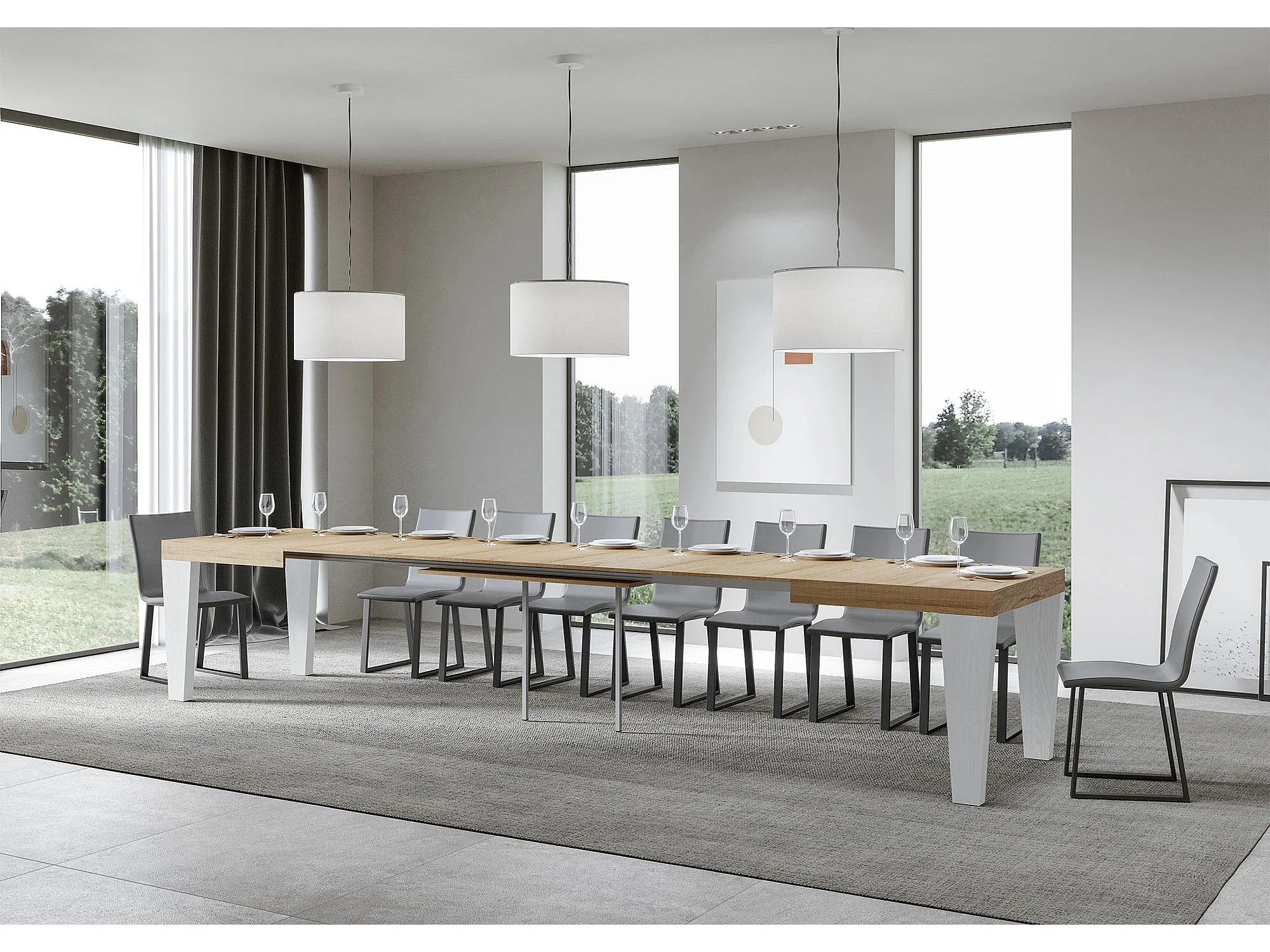 Table extensible blanche et pieds chêne naturel 6 à 20 places Kristo 180 à 440cm-Sur roulettes