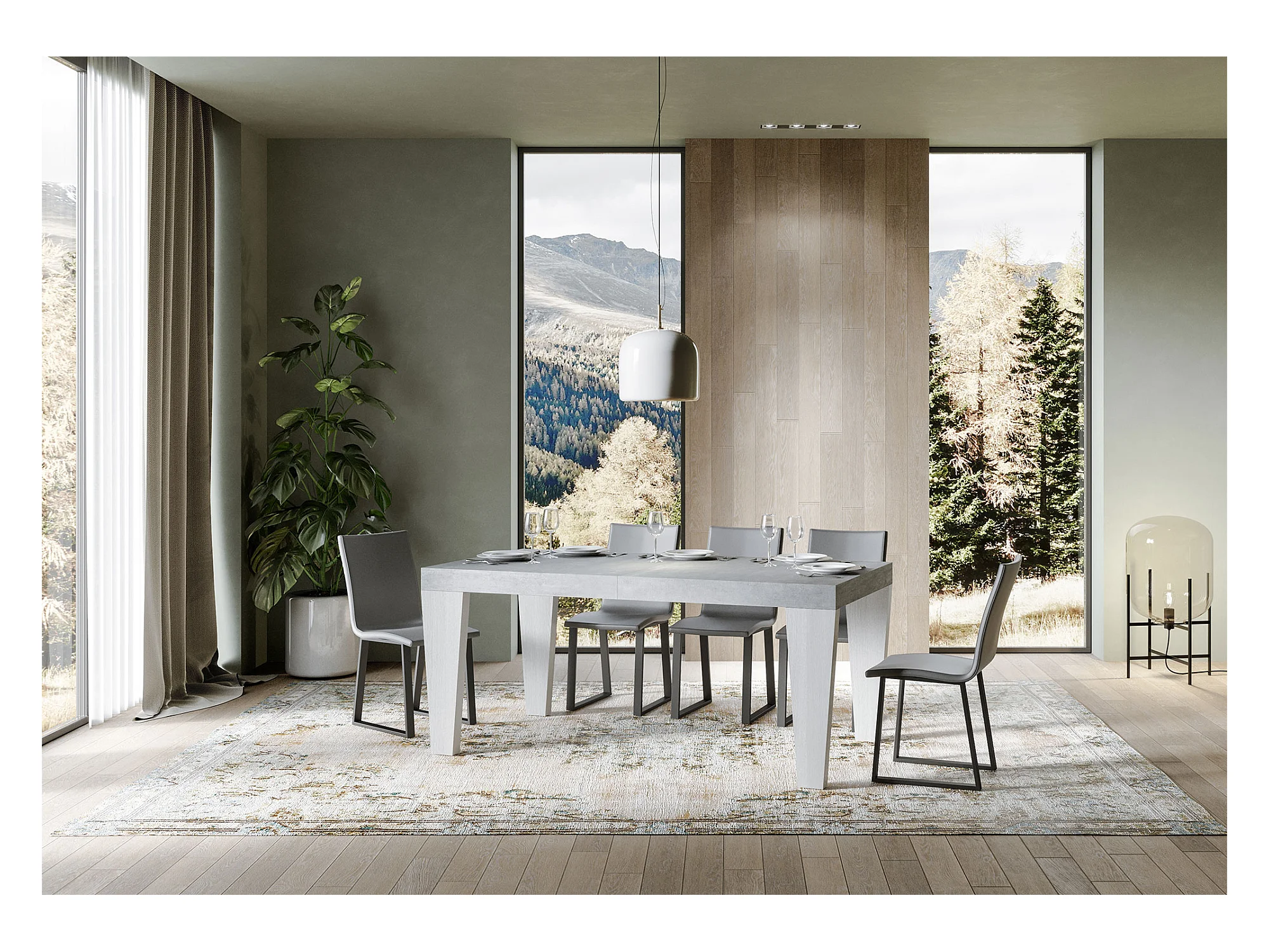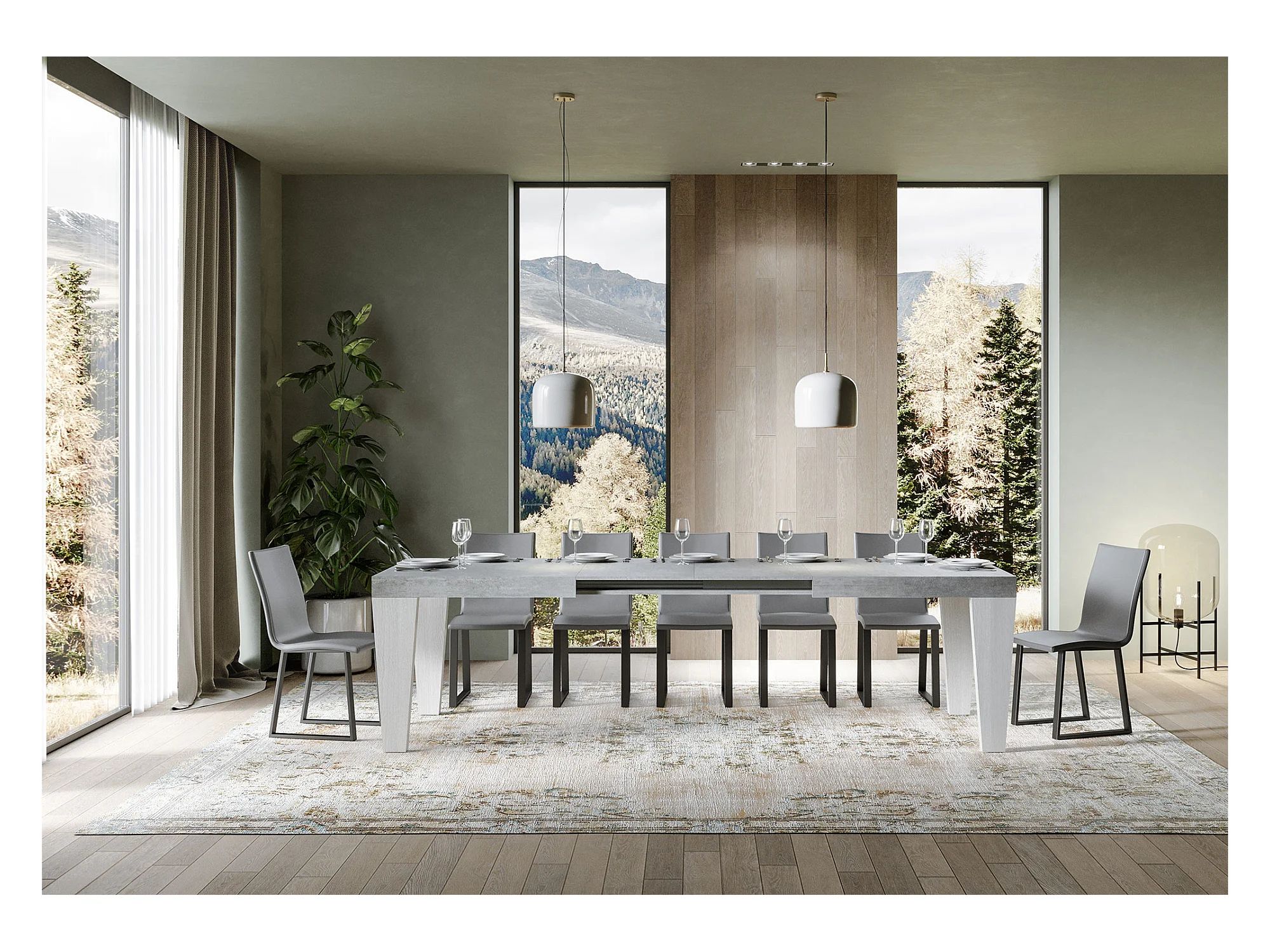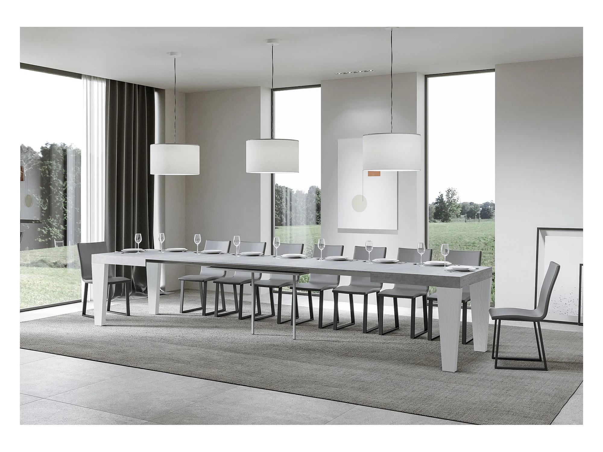 Table extensible gris béton et pieds bois blanc 6 à 20 places Kristo 180 à 440cm-Sur roulettes