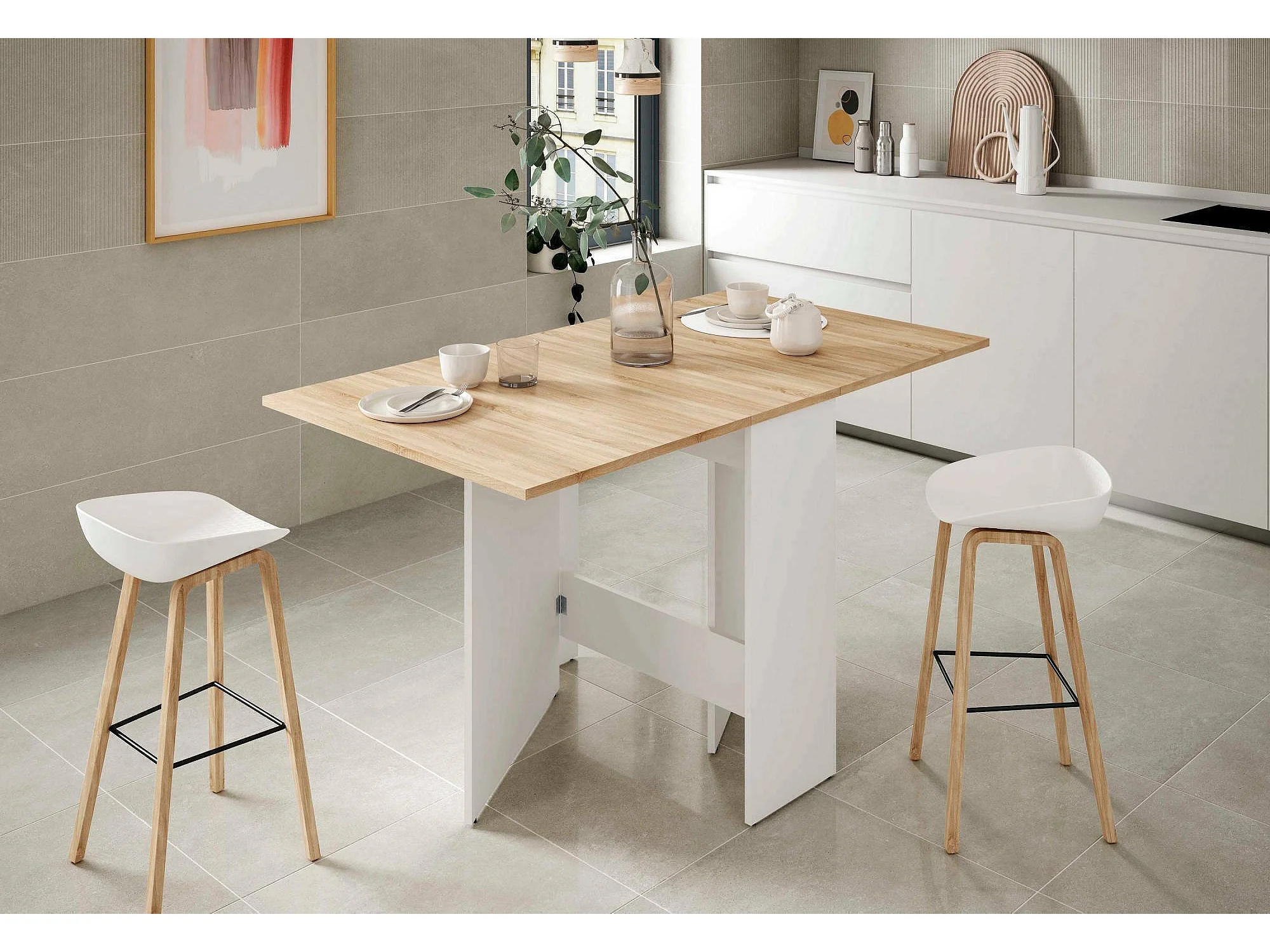 Table extensible Toledo, Table à manger pliante avec plateau rabattable, Table d'appoint pliable, 31x77h78 cm, Blanc et Chêne