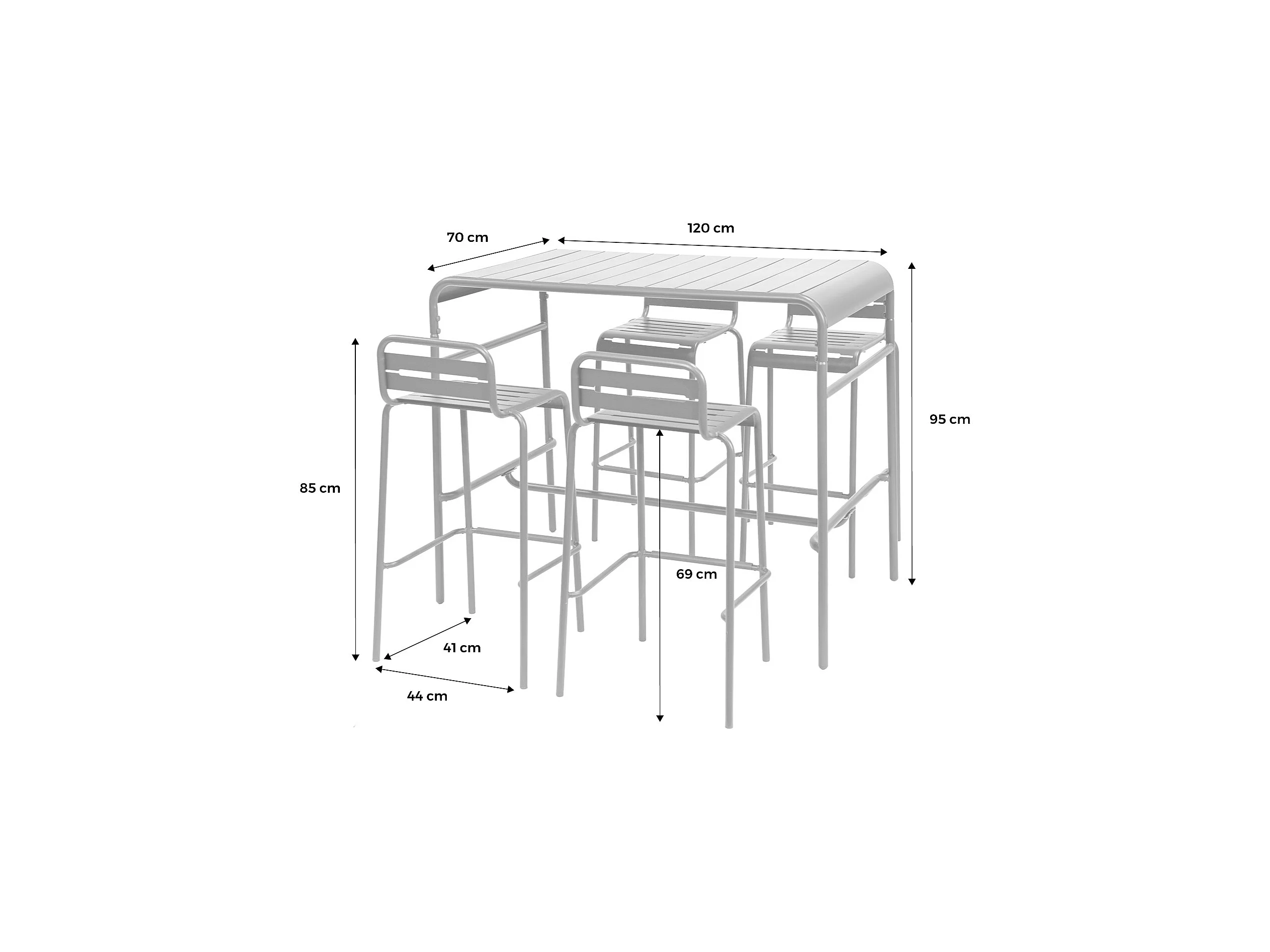 Table haute de jardin acier + 4 assises AMELIA beige. 4 chaises hautes en acier. 120 x 70cm x 95cm