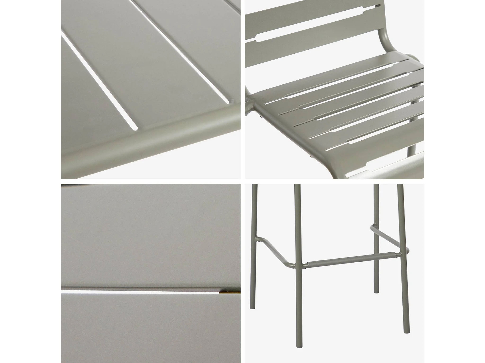 Table haute de jardin acier + 4 assises AMELIA kaki. 4 chaises hautes en acier. 120 x 70cm x 95cm