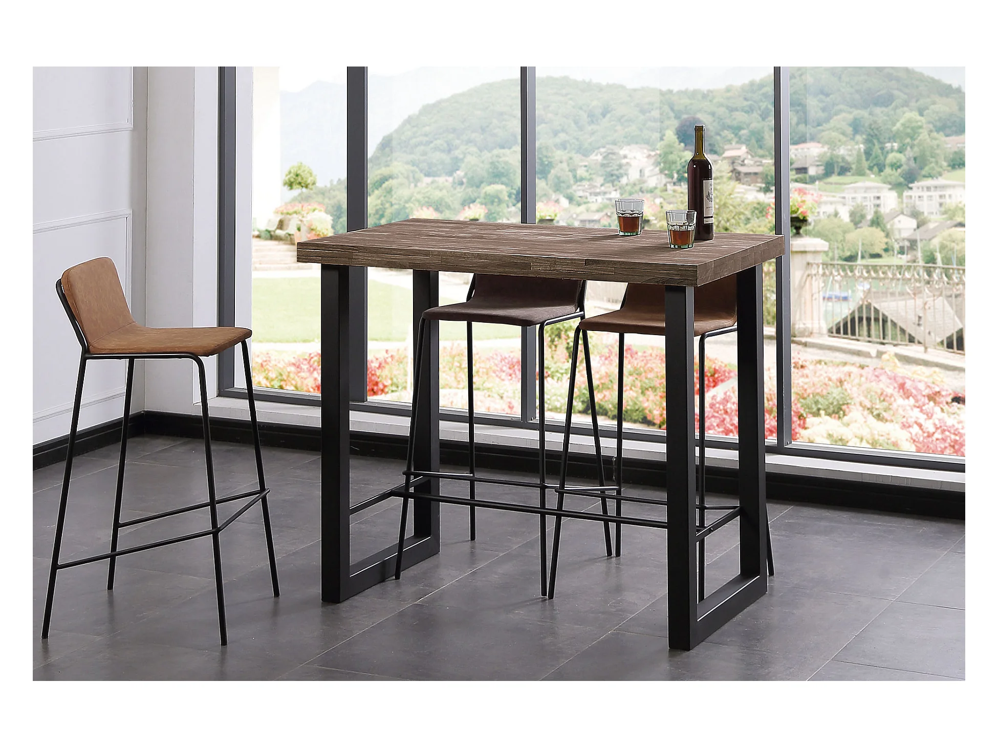 Table haute en bois coloris chêne américain / pieds noir - Longueur 120 x profondeur 70 x Hauteur 100 cm