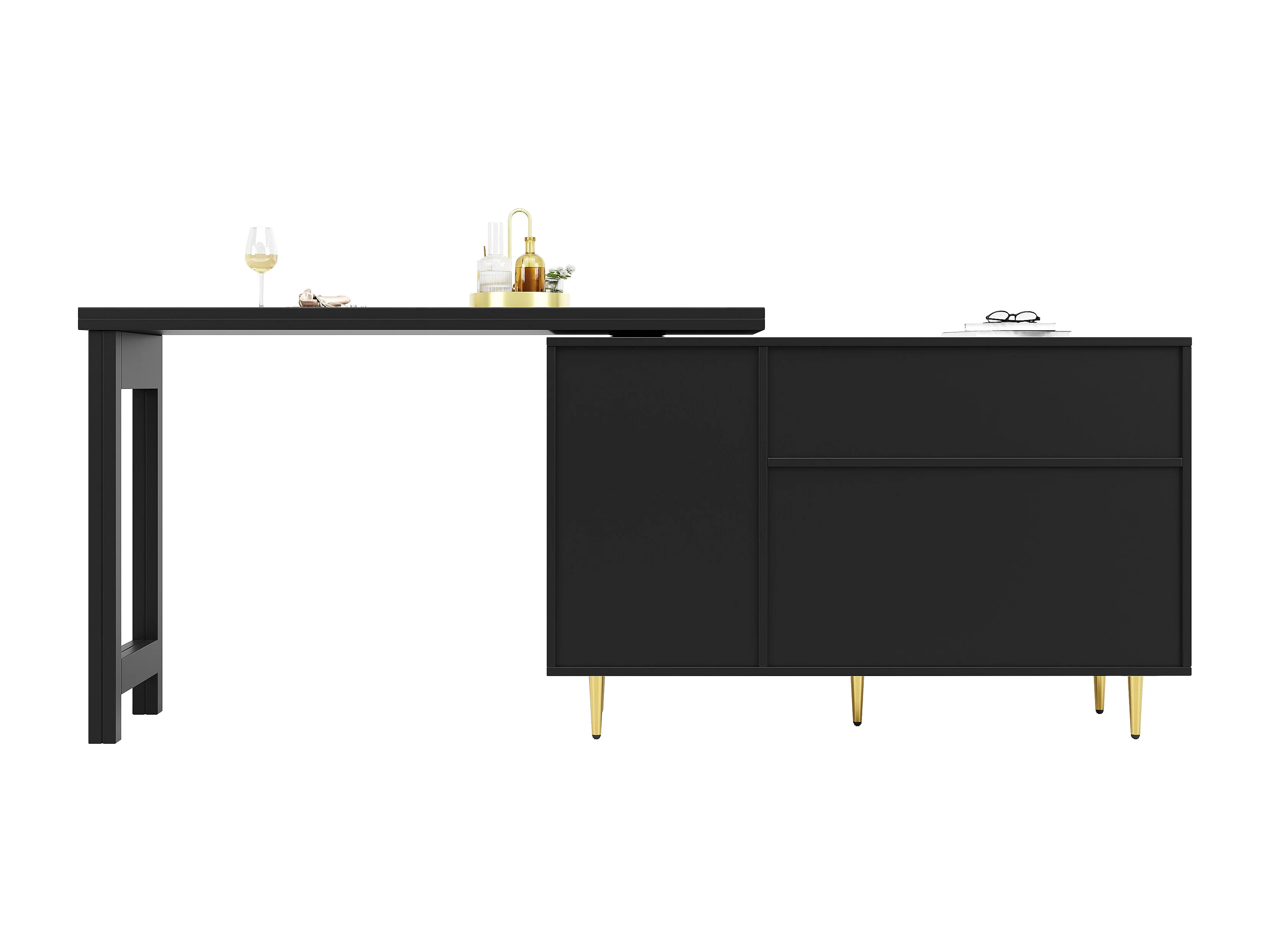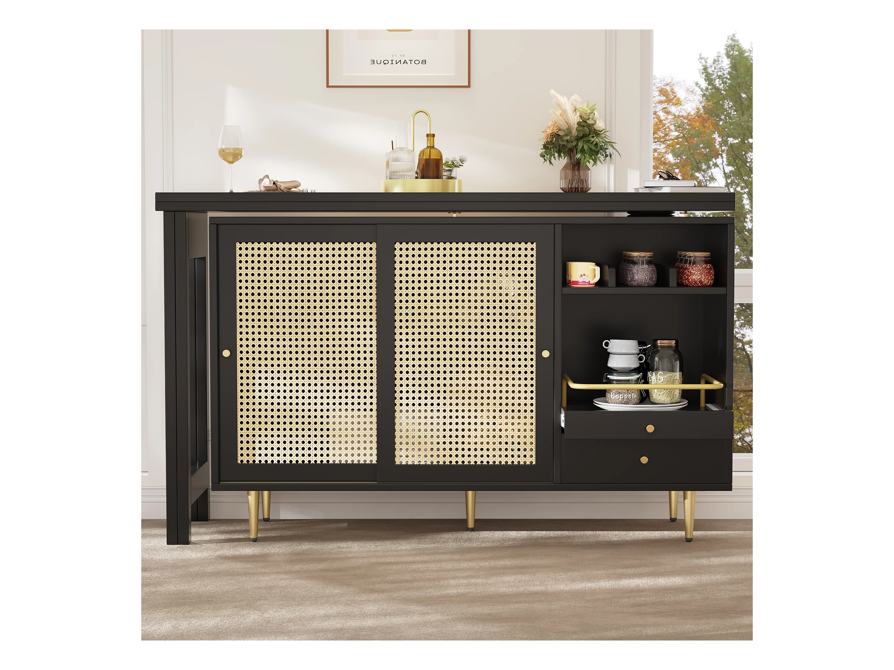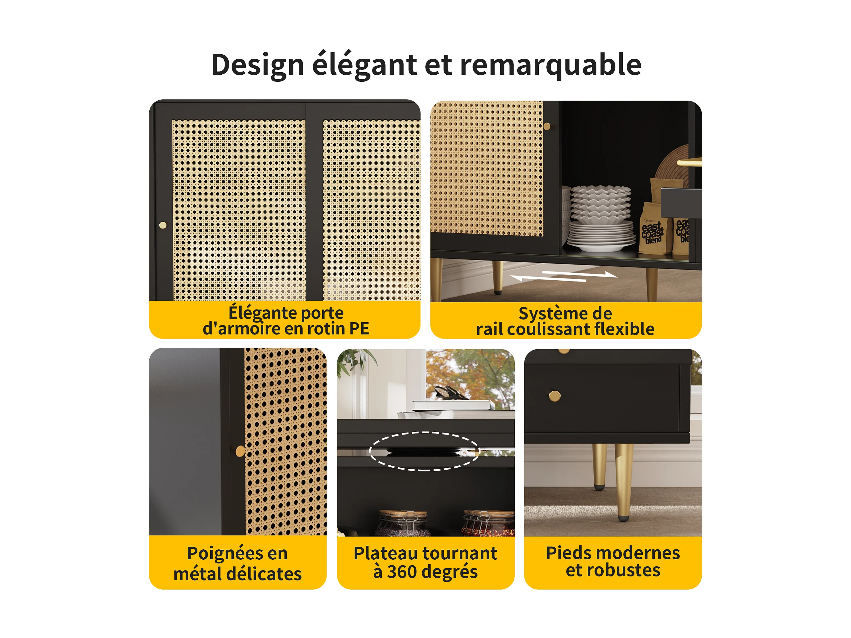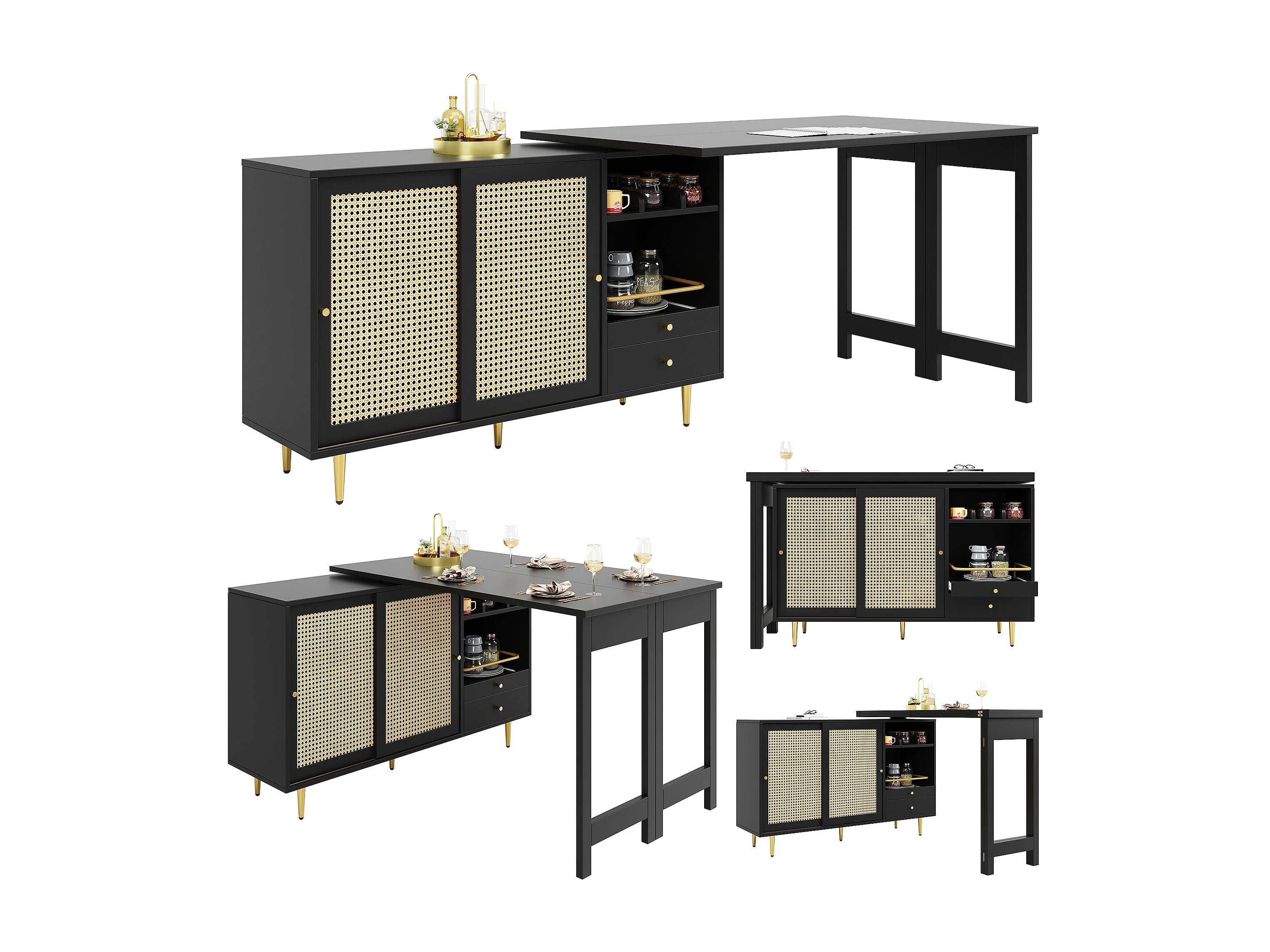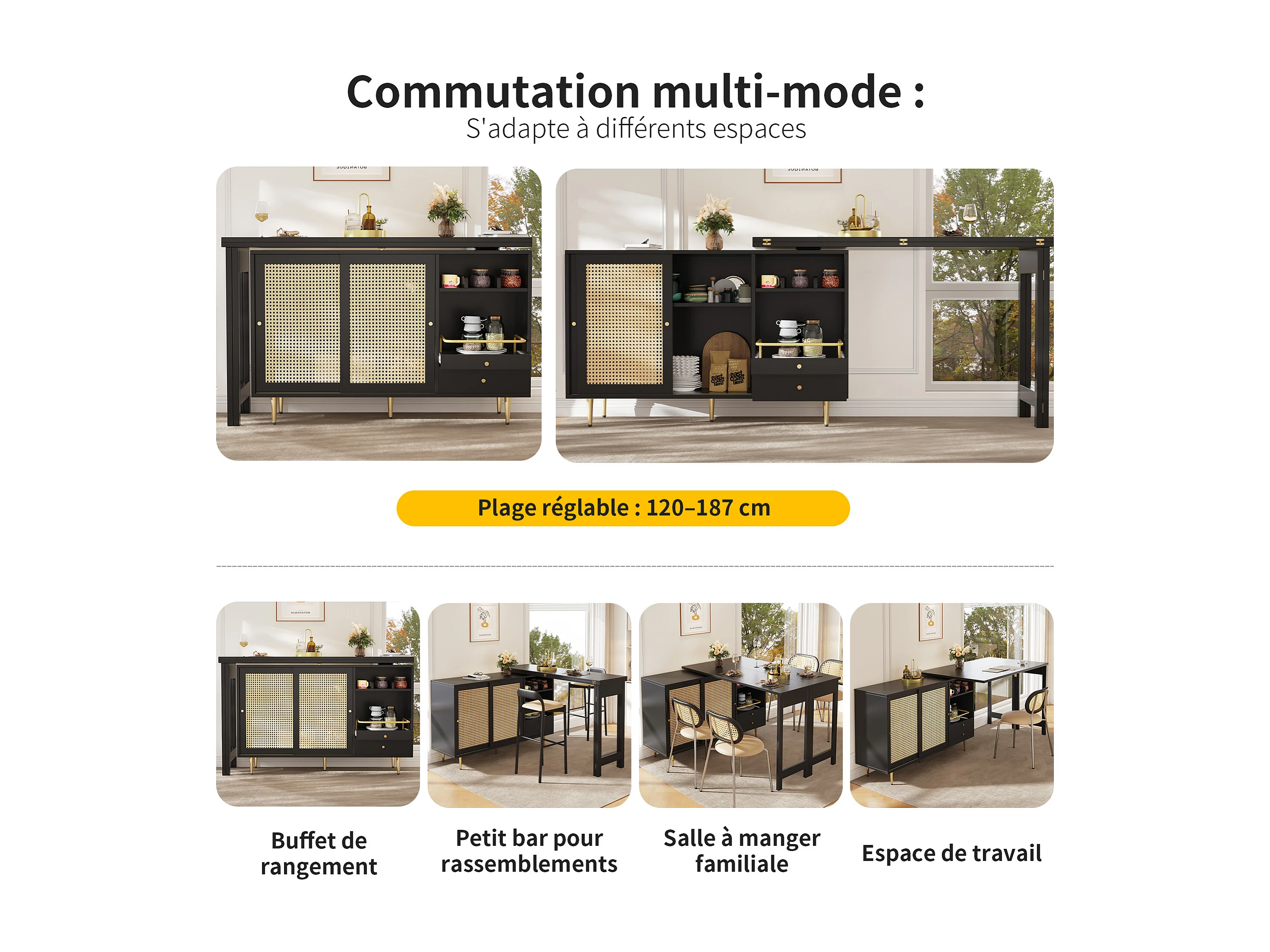 Table haute pivotante 360° noire extensible avec rangement et étagère ouverte, porte en rotin
