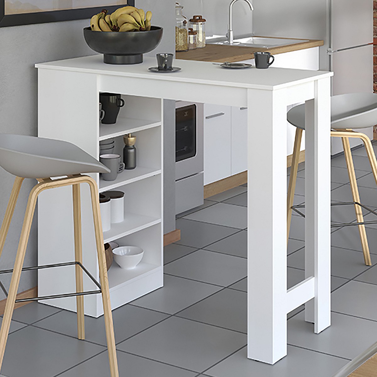 Table haute, table de bar avec rangements couleur blanc - Longueur 120 x profondeur 50 x hauteur 105 cm