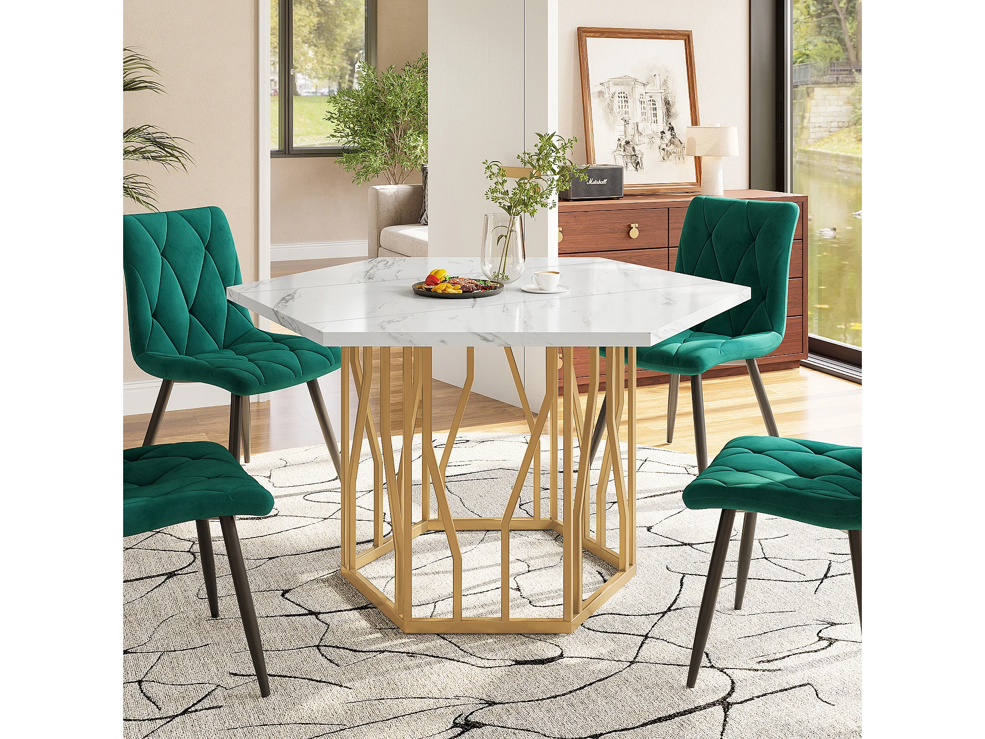 Table hexagonale effet marbre, Piétement métal, Cuisine/Salon, Table esthétique et simple, Pieds dorés