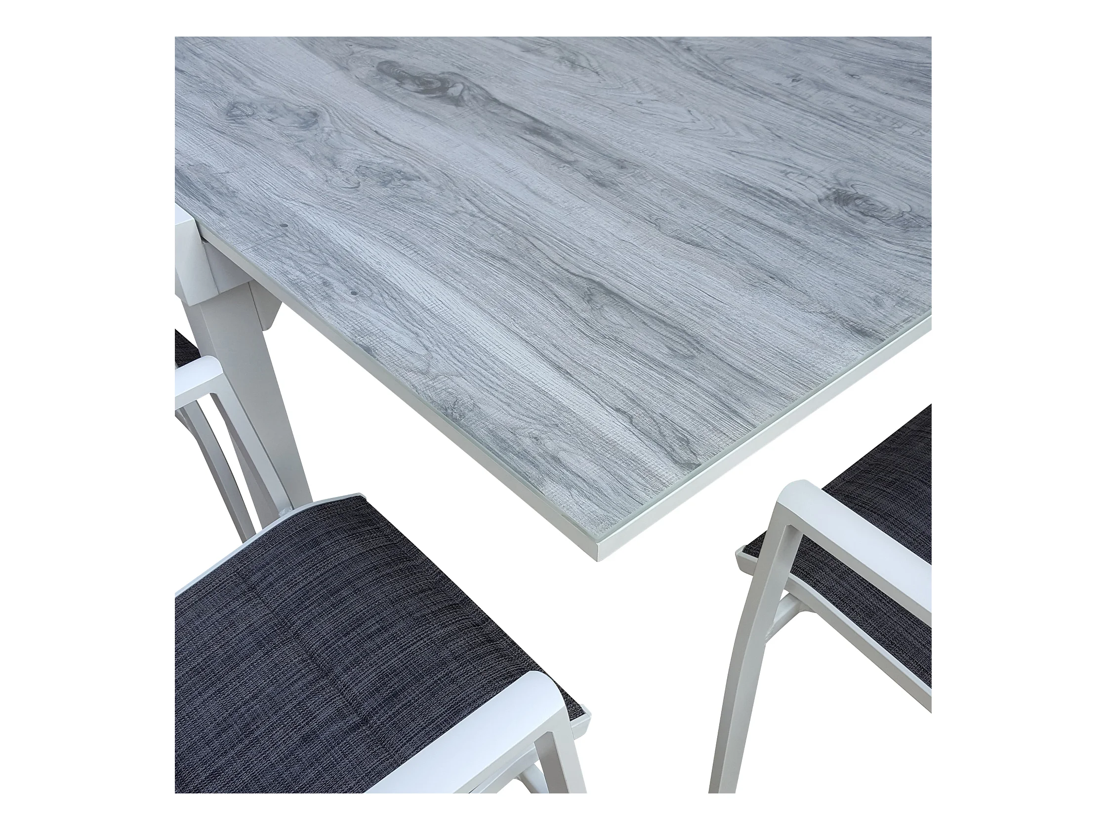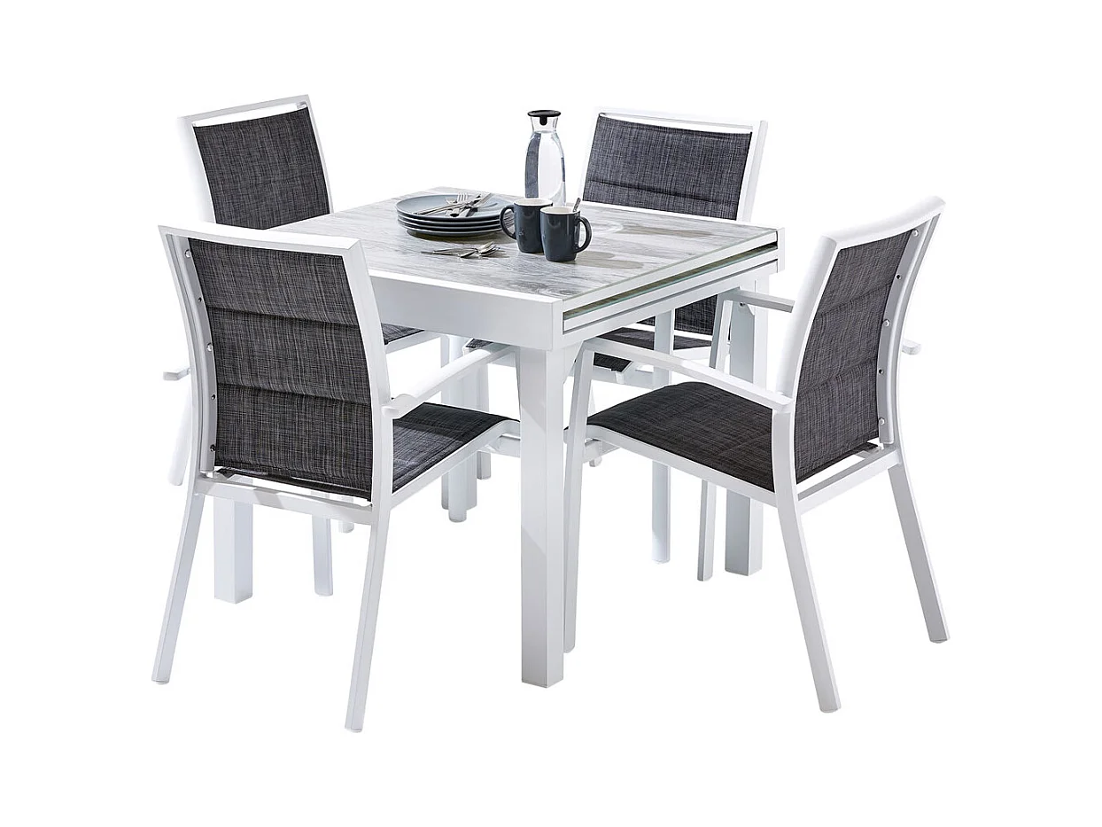 Table Modulo 4/8 personnes structure aluminium blanche, plateau en verre décors bois