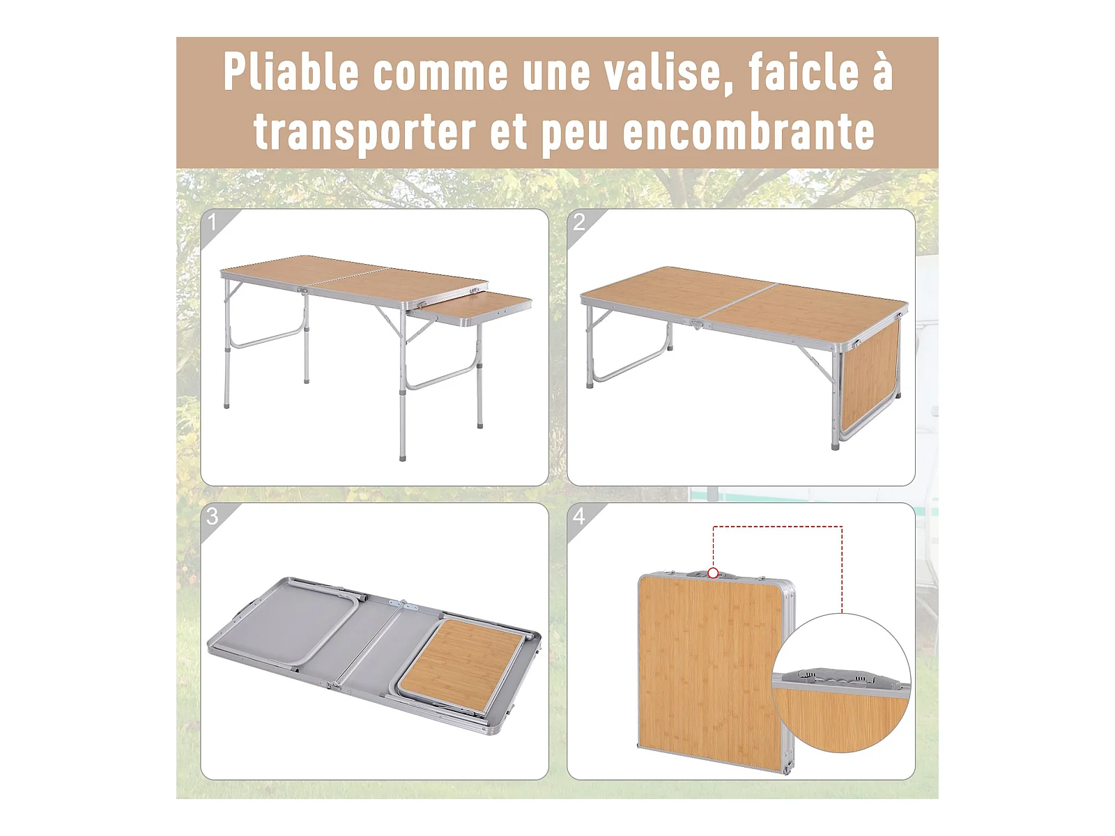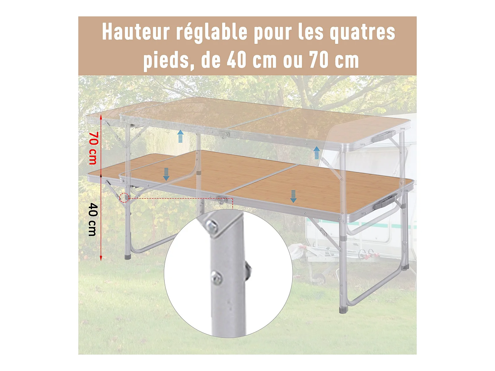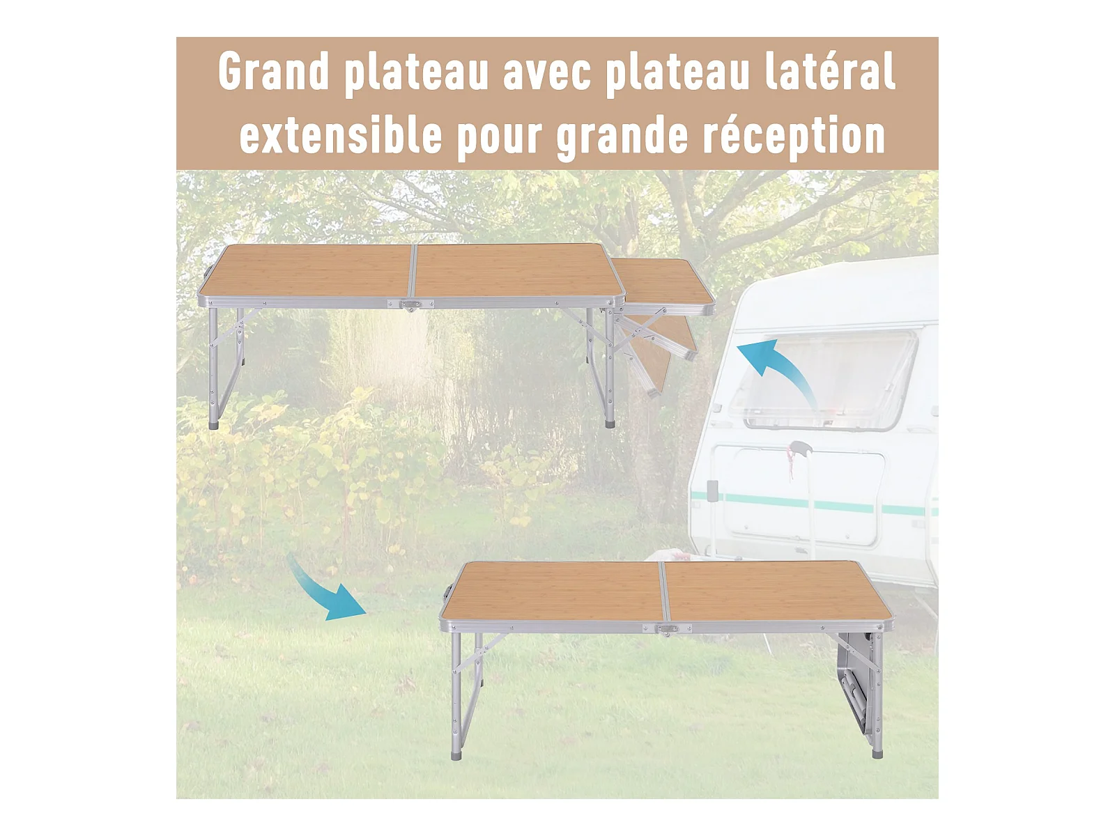 Table pliante table de camping table de jardin avec rallonge hauteur réglable aluminium MDF imitation bambou