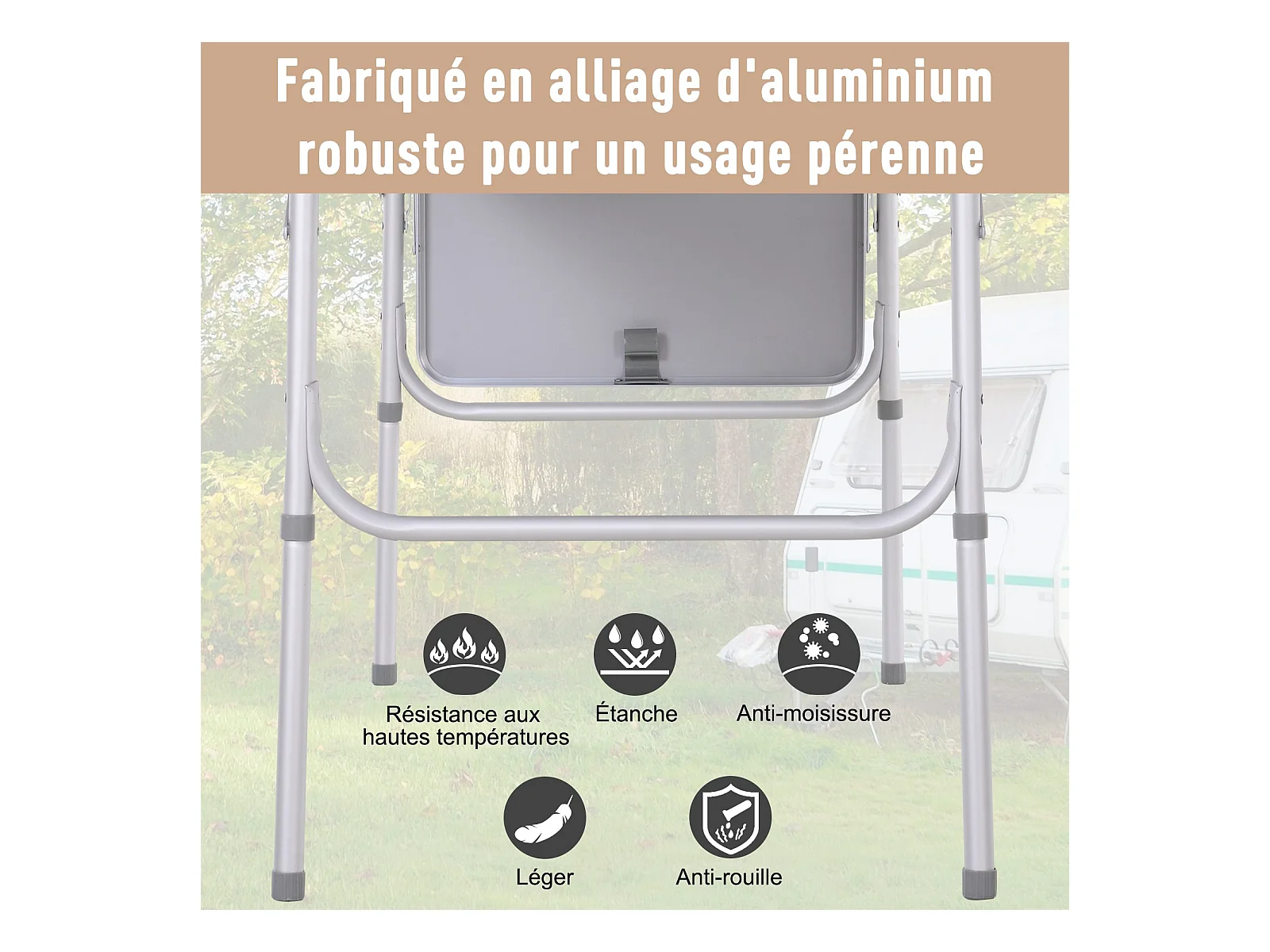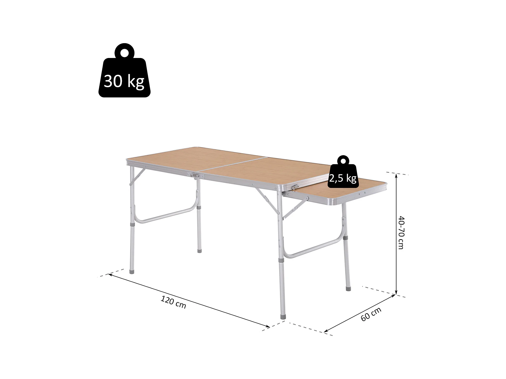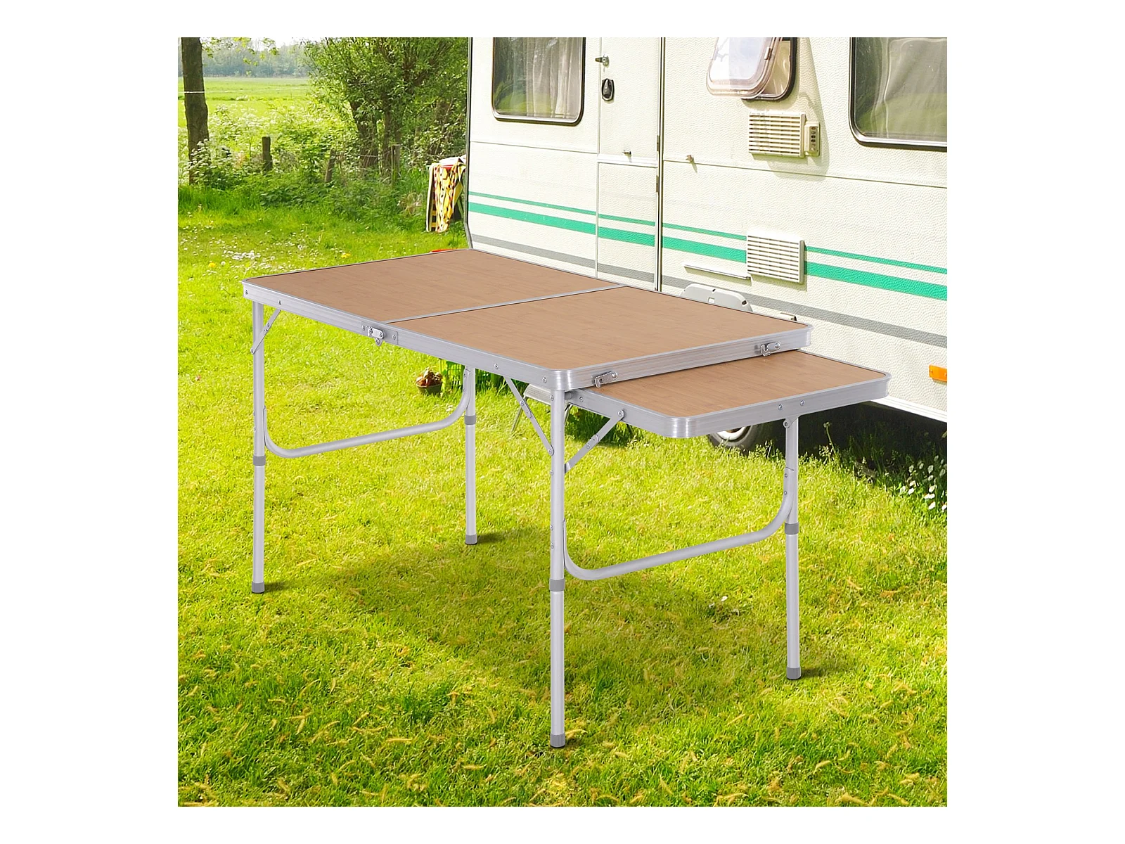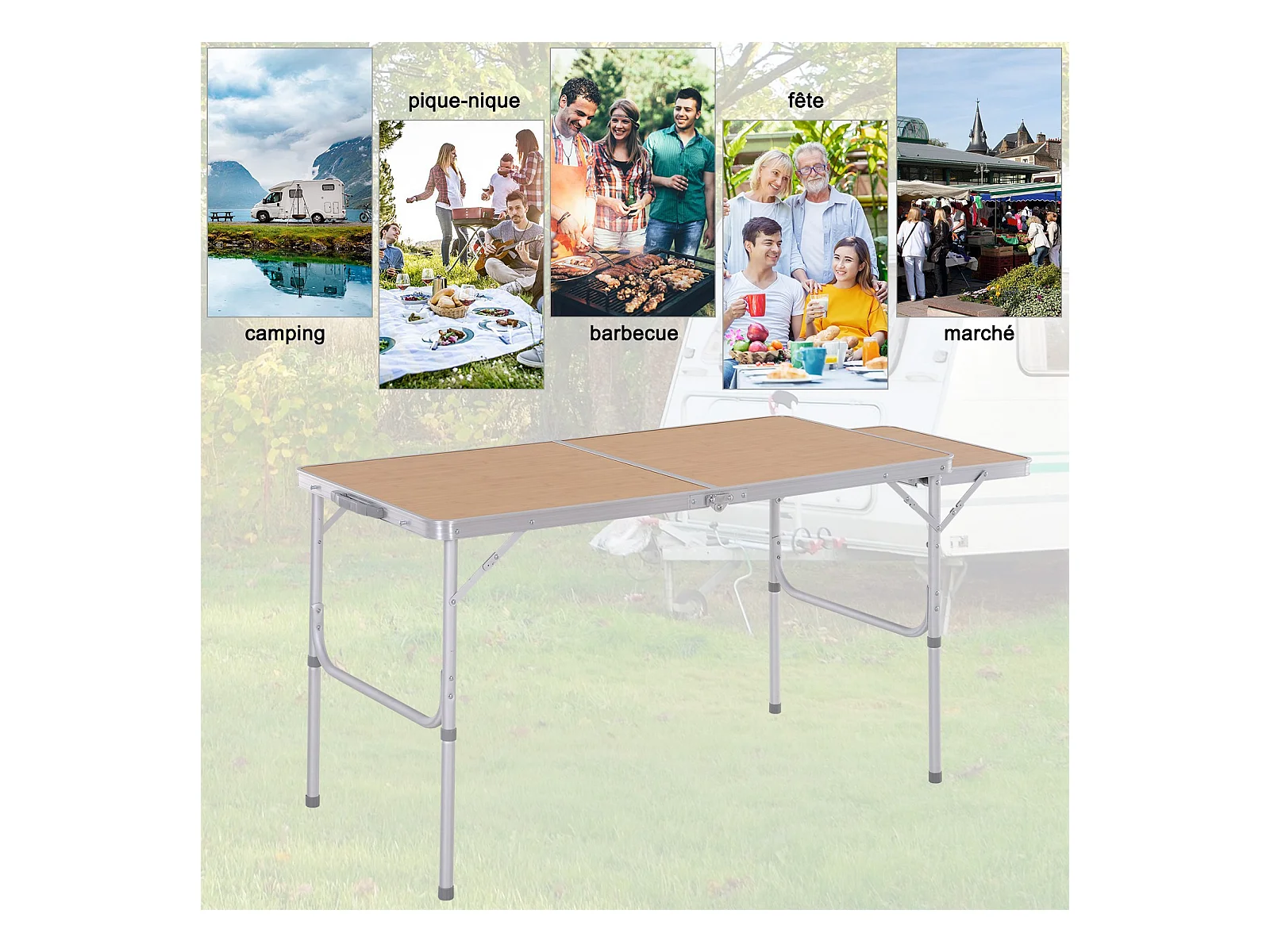 Table pliante table de camping table de jardin avec rallonge hauteur réglable aluminium MDF imitation bambou