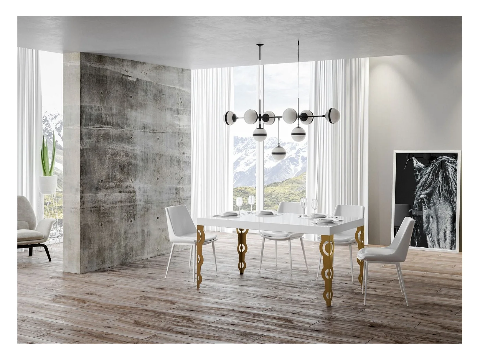 Table rectangulaire extensible orientale 6 à 10 personnes L 130 à 234cm blanc brillant et pieds métal doré Kazay