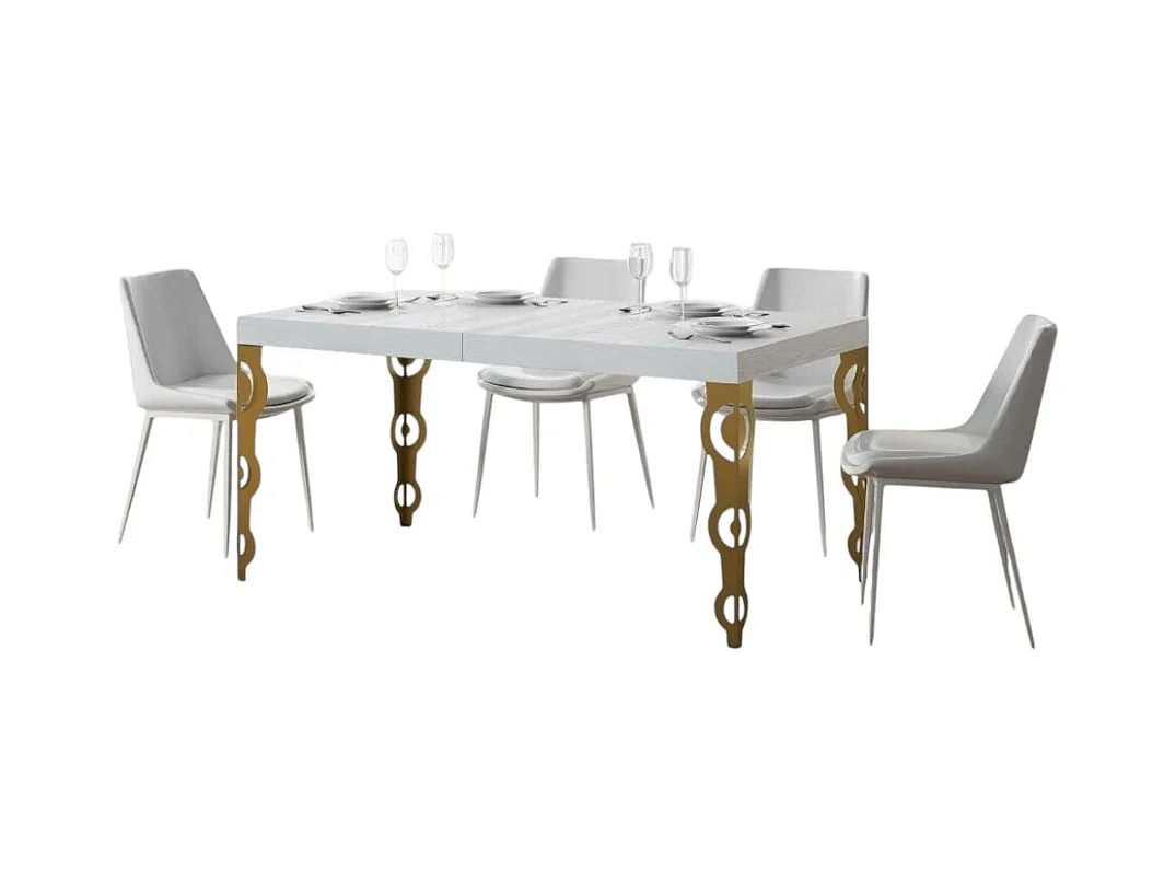 Table rectangulaire extensible orientale 6 à 10 personnes L 130 à 234cm frêne blanc et pieds métal doré Kazay