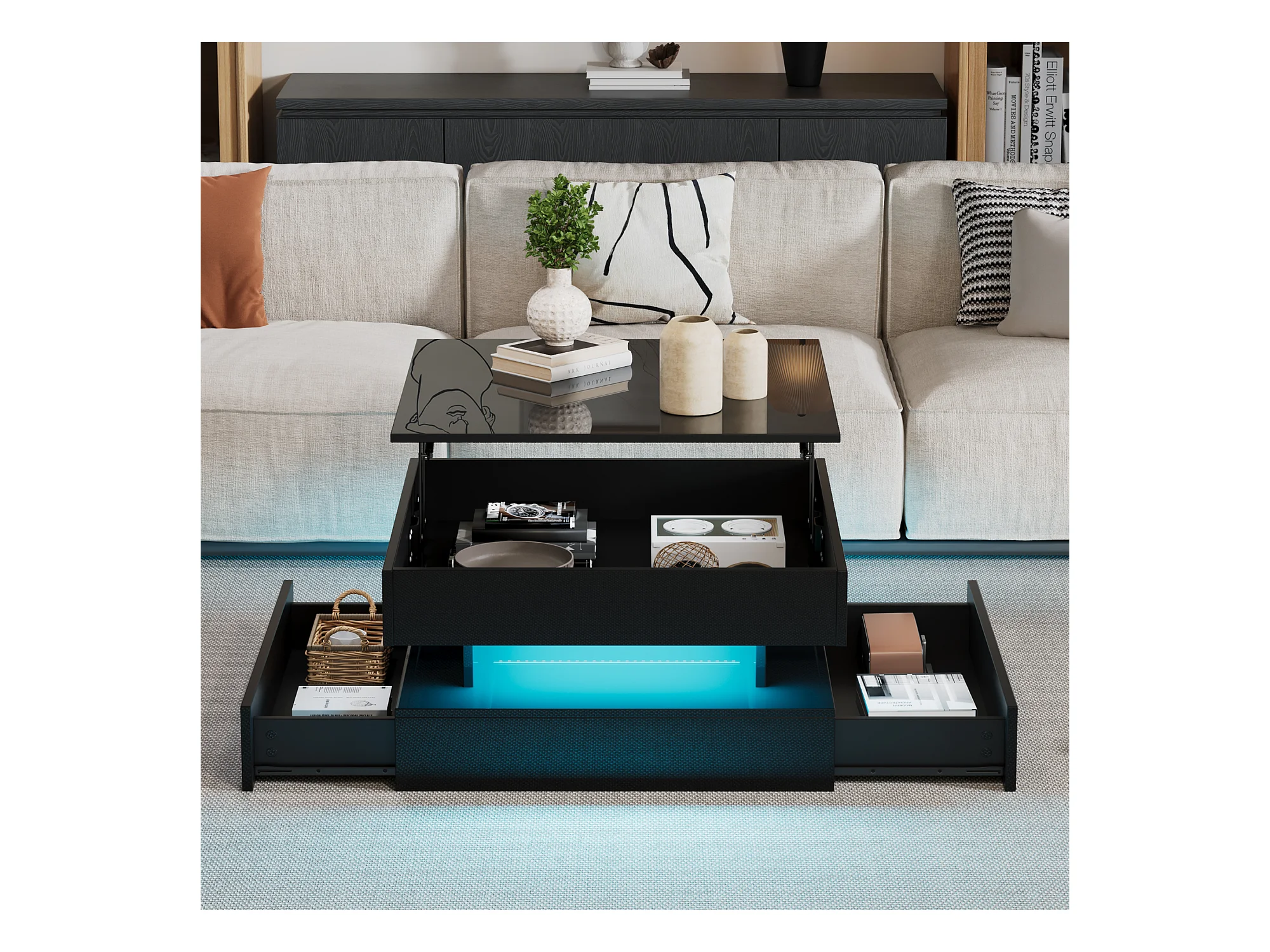 Table basse relevable - 100 x 50 x 40 cm - avec rangement dissimulé + Leds + 1 tiroir -aggloméré - noir