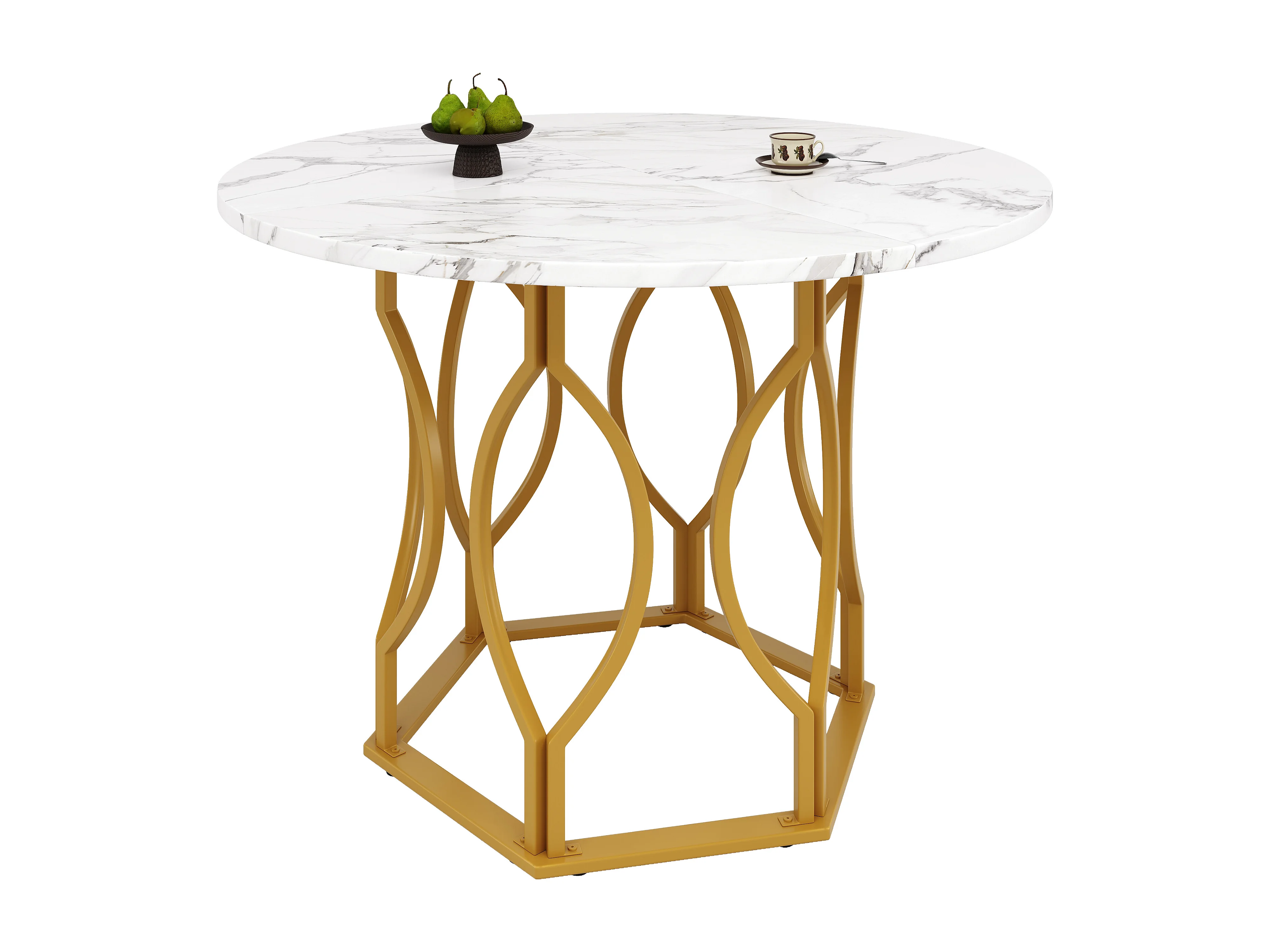 Table ronde 100×100×76cm, Plateau MDF marbré, Piétement métal, Cuisine/Salon, Pieds dorés, 4 personnes
