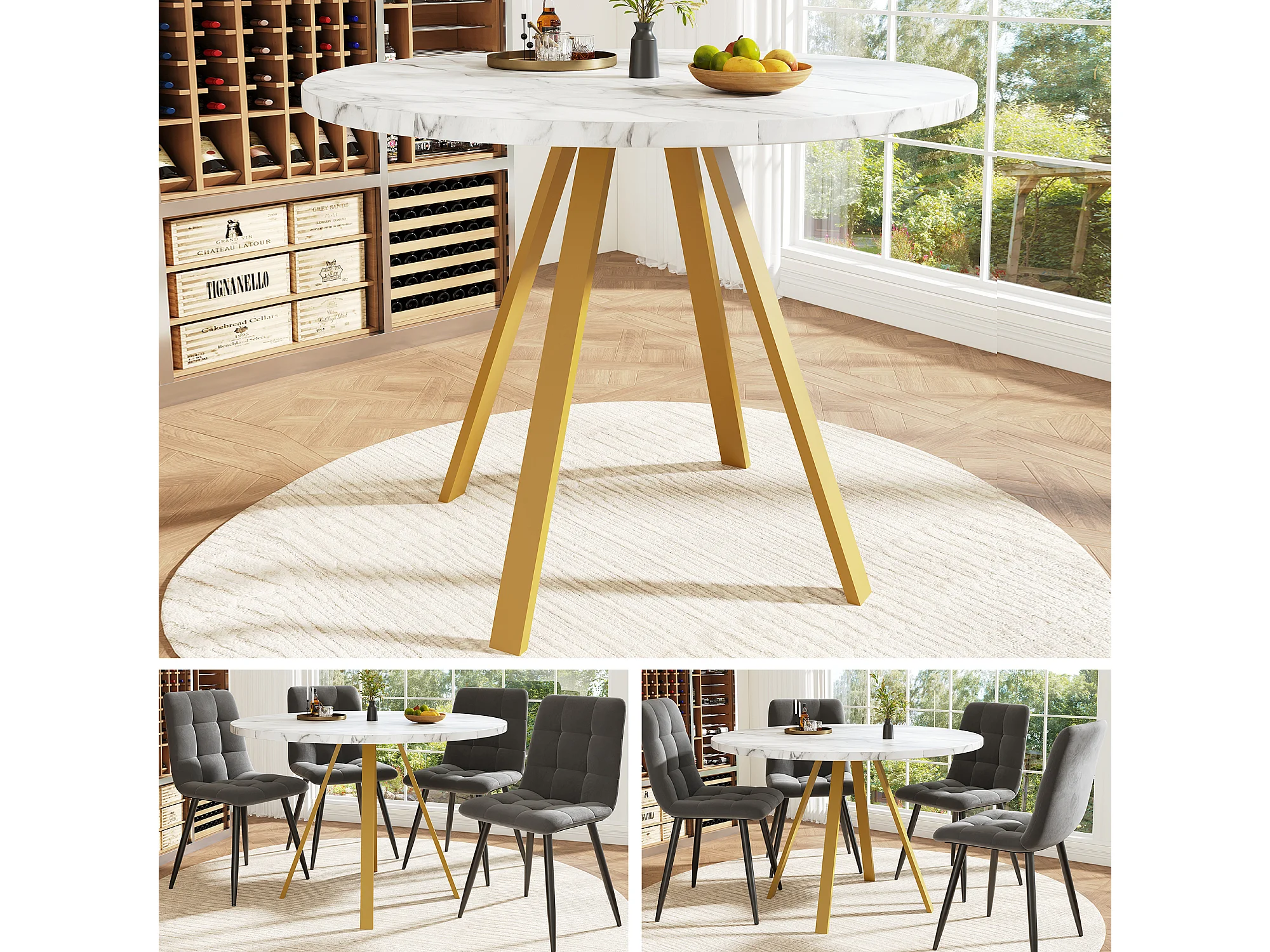 Table ronde 80×80×75cm, 1 pièce, Plateau pour 4 personnes, Piétement métal, Cuisine/Salon, Blanc/Doré