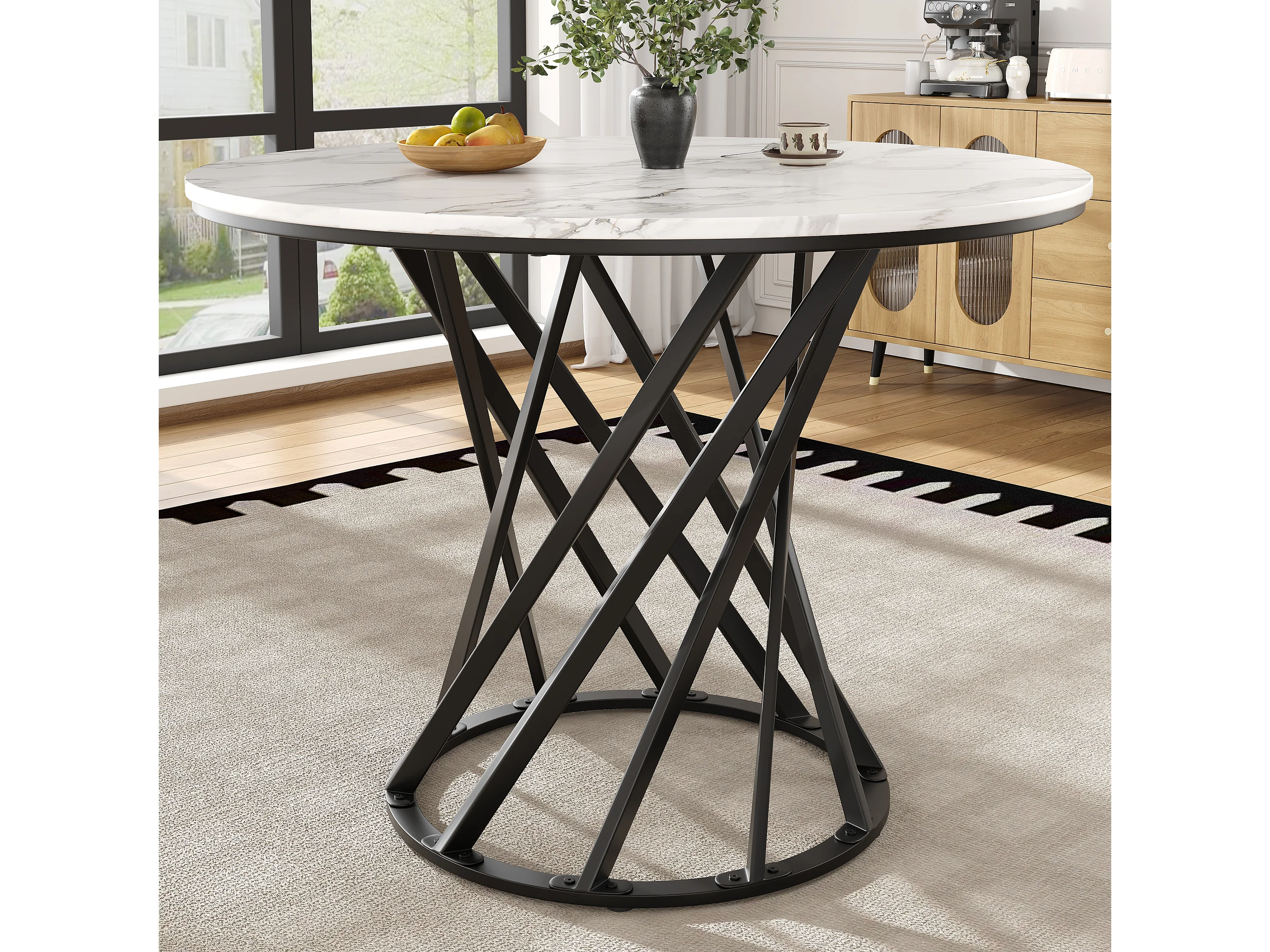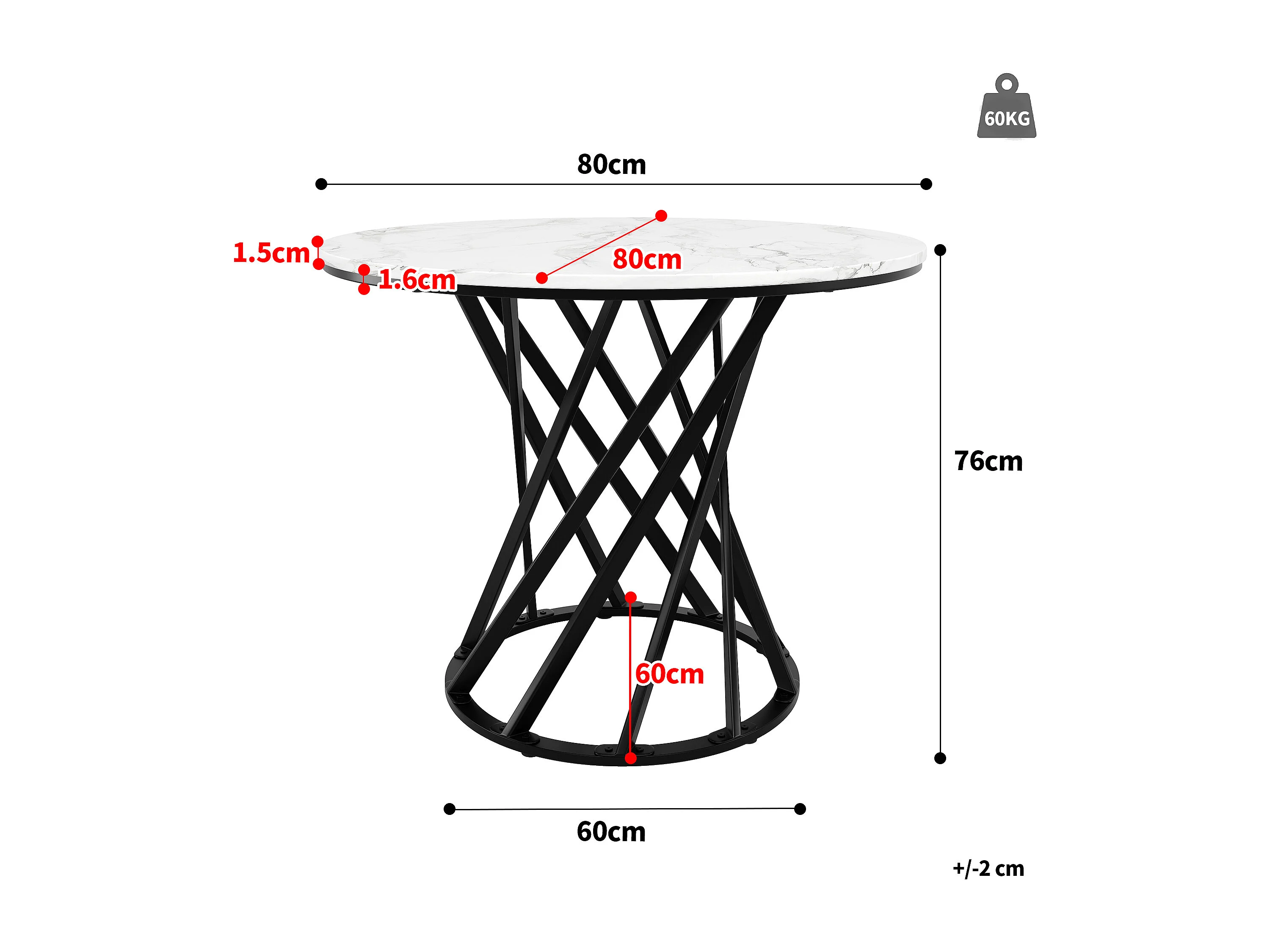 Table ronde 80×80×76cm, Plateau MDF marbré, Piétement métal noir, Cuisine/Salon, 4 personnes