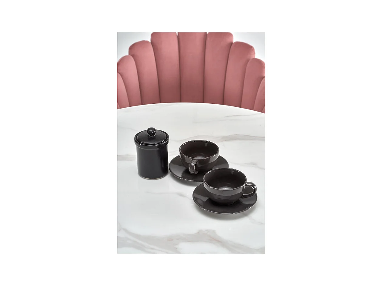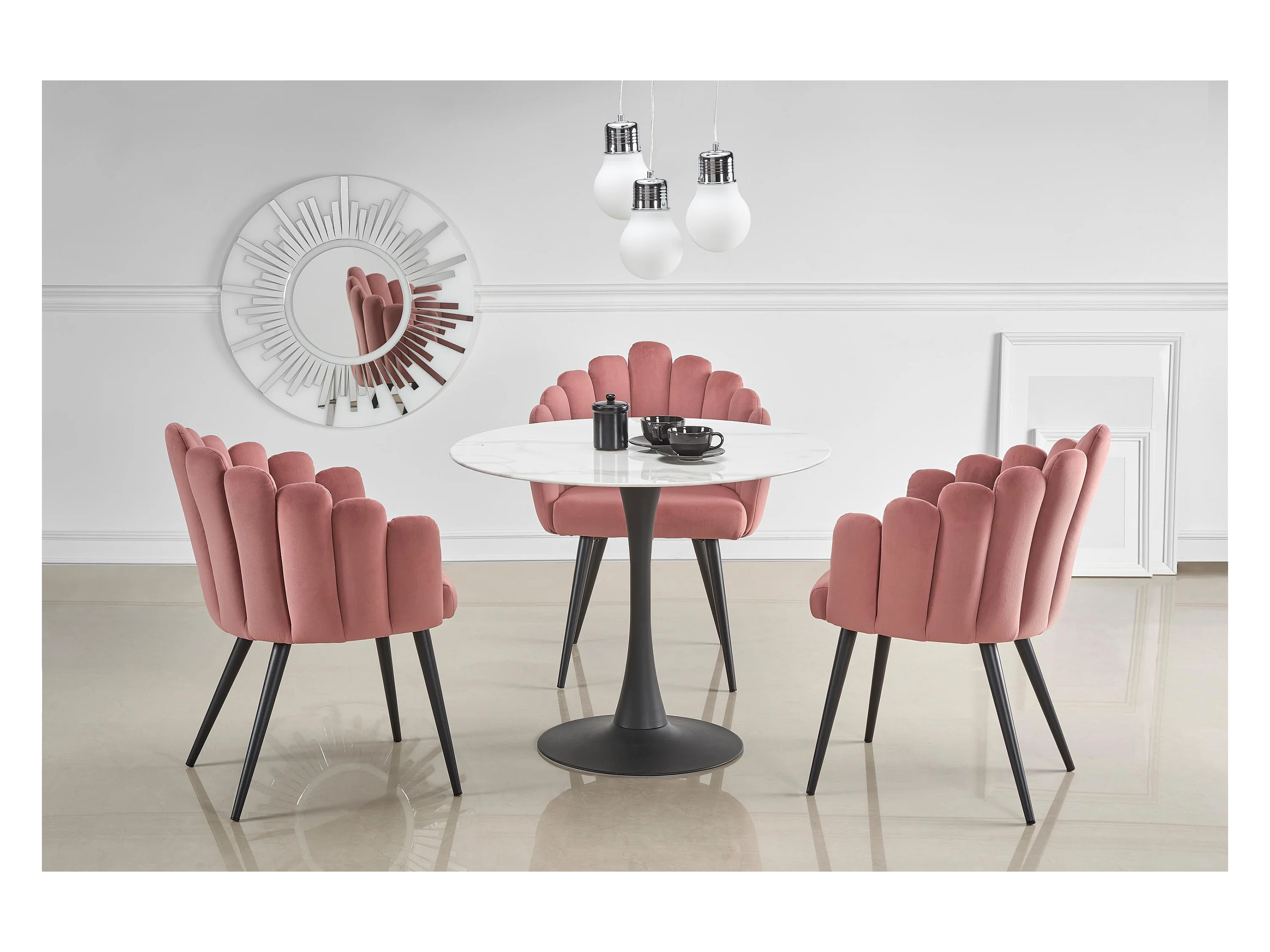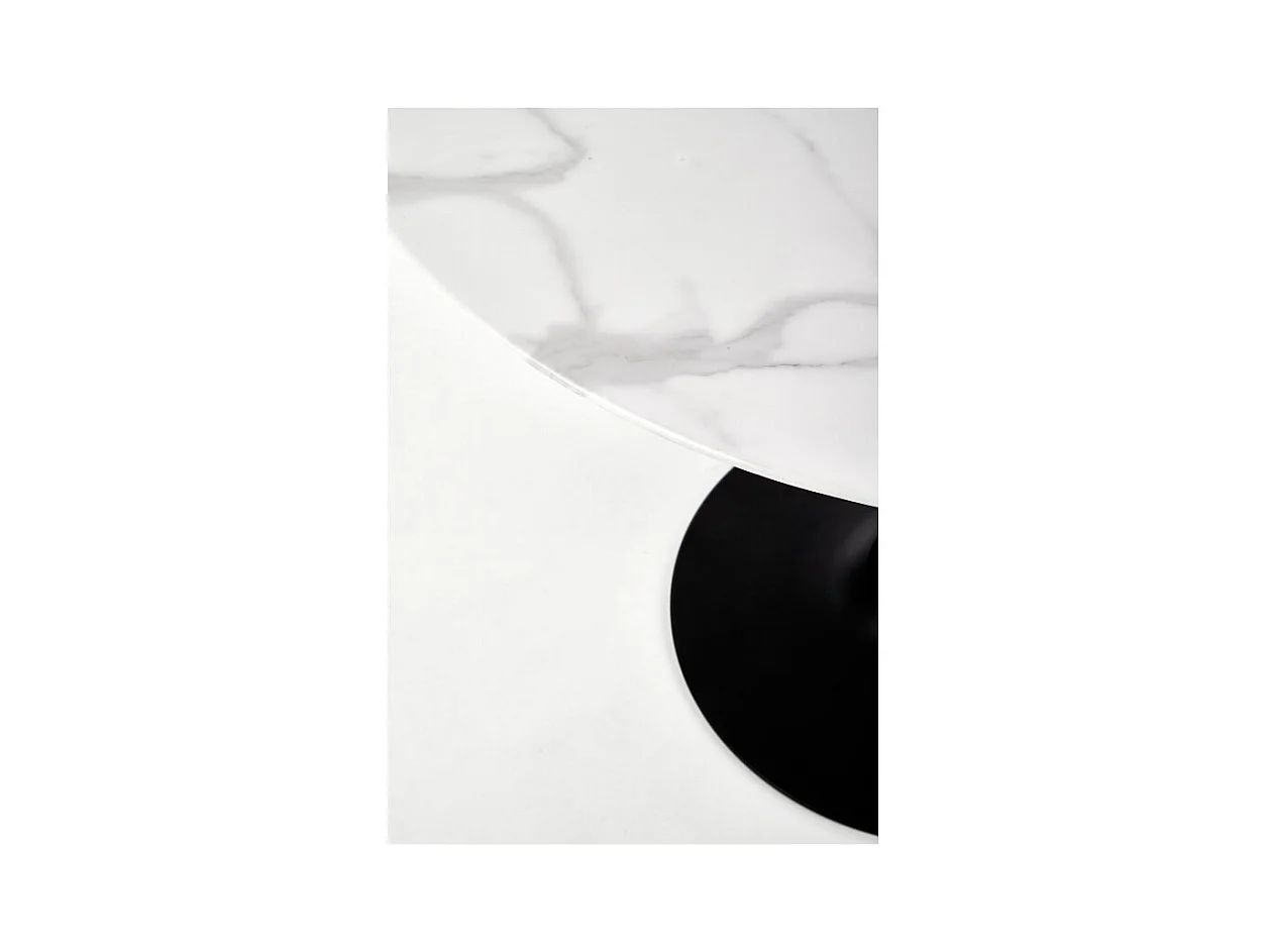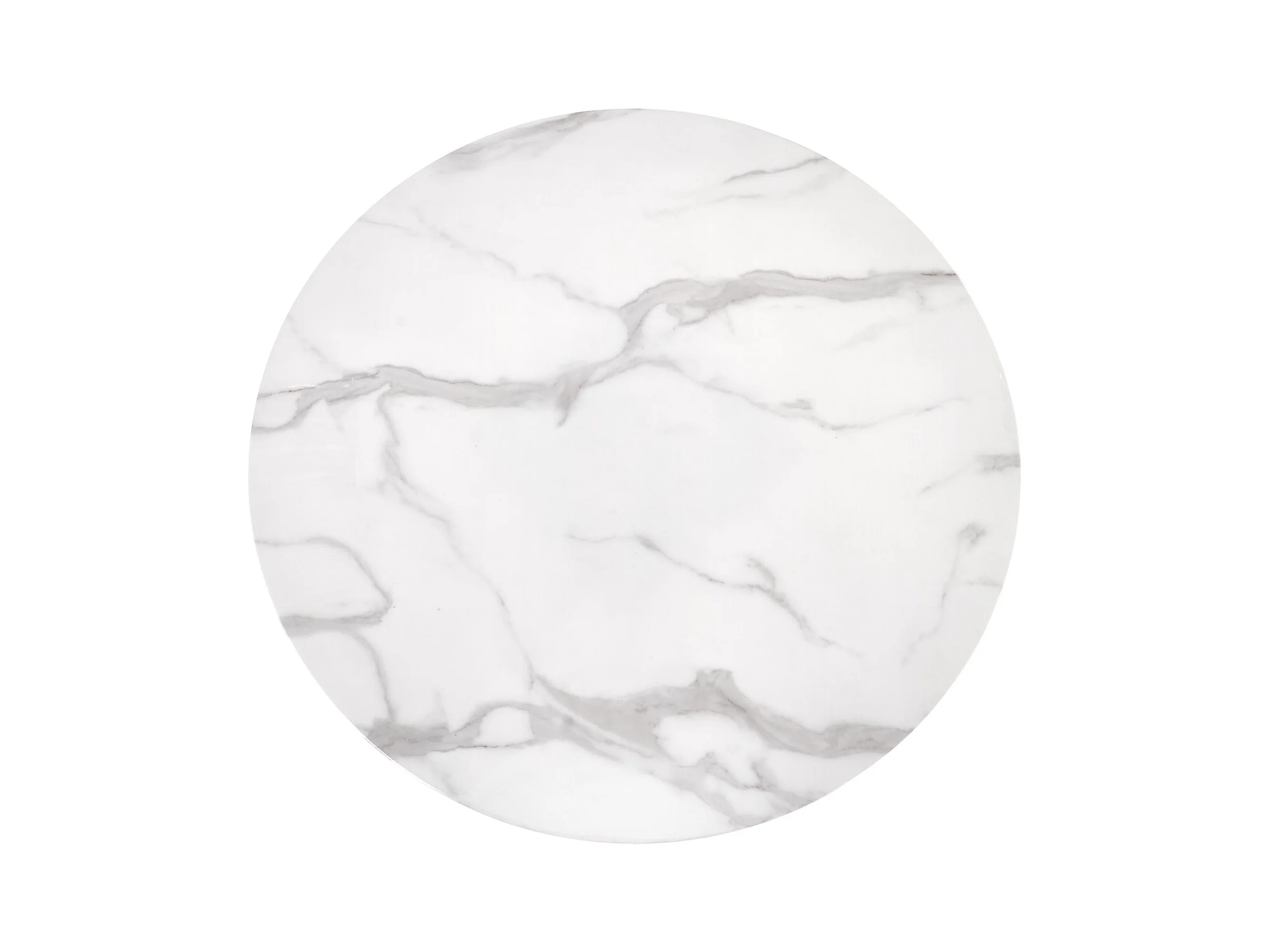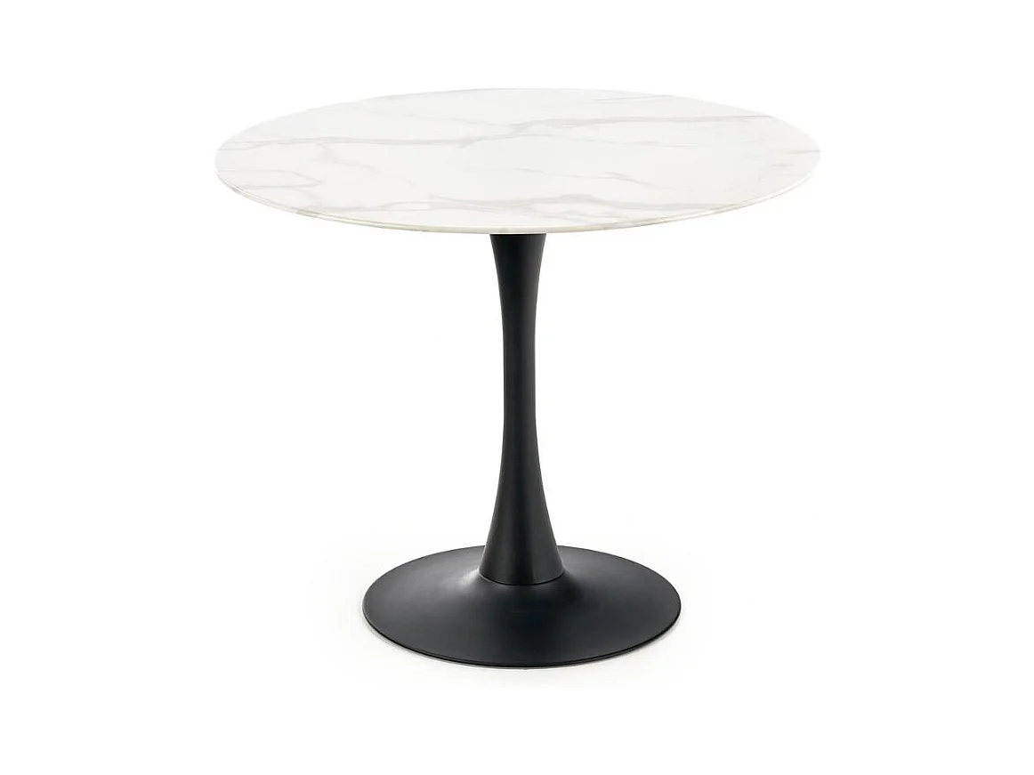Table ronde 90cm avec plateau en verre aspect marbre blanc et pied central noir Amboise