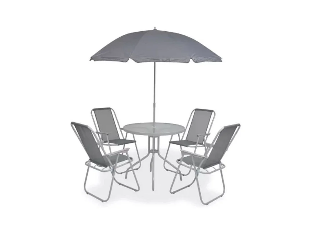 Table ronde avec parasol et 4 chaises de jardin métal gris Castle