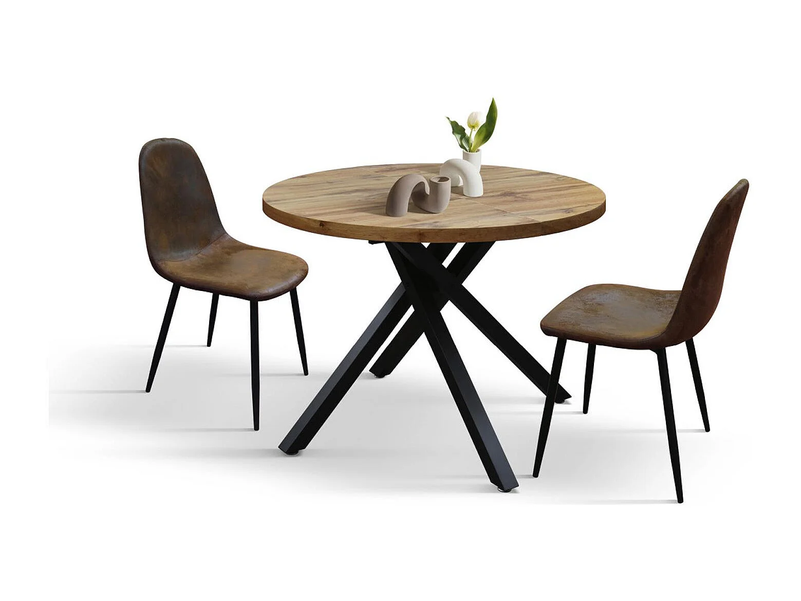 Table ronde en bois, finition chêne, pieds en métal noir, Ø100xH75-140x100x75 - POLA